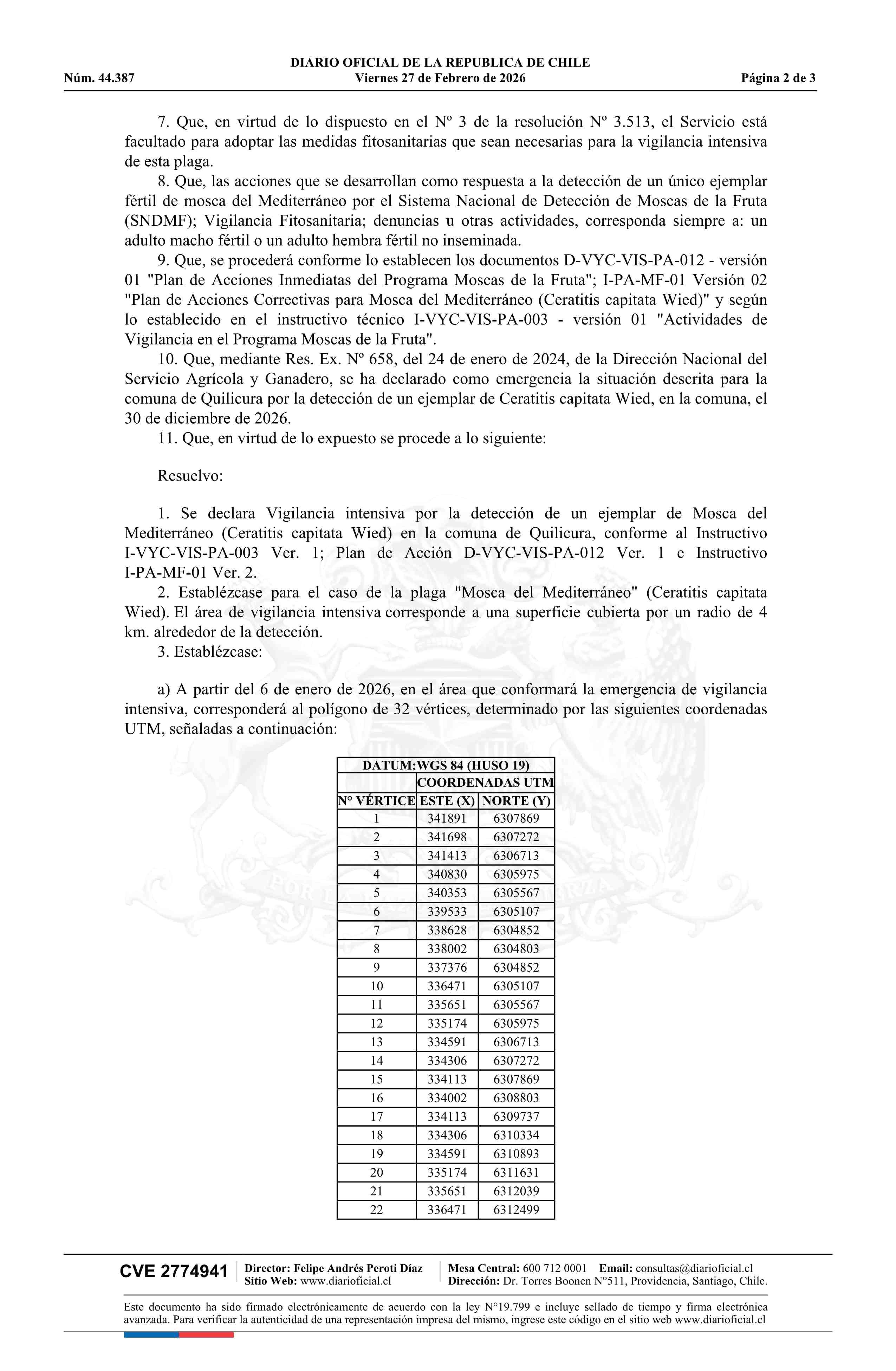 Título: Resolución exenta número 12, de 2026.- Activa vigilancia intensiva ante la detección de un único ejemplar adulto de Mosca del Mediterráneo (Ceratitis capitata Wied), comuna de Quilicura