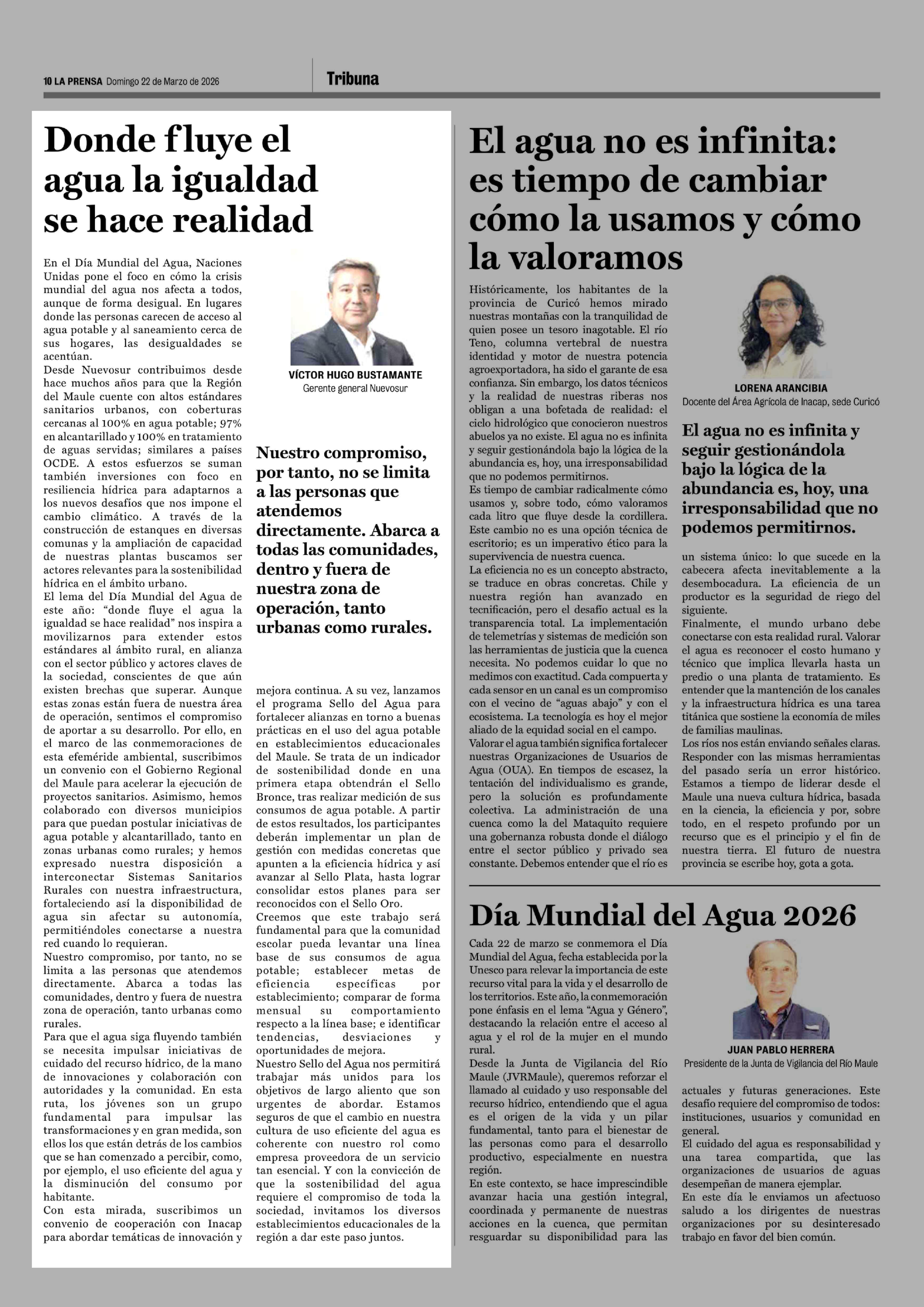 Columnas de Opinión: Donde fluye el agua la igualdad se hace realidad 22-03-2026 La Prensa de Curicó |