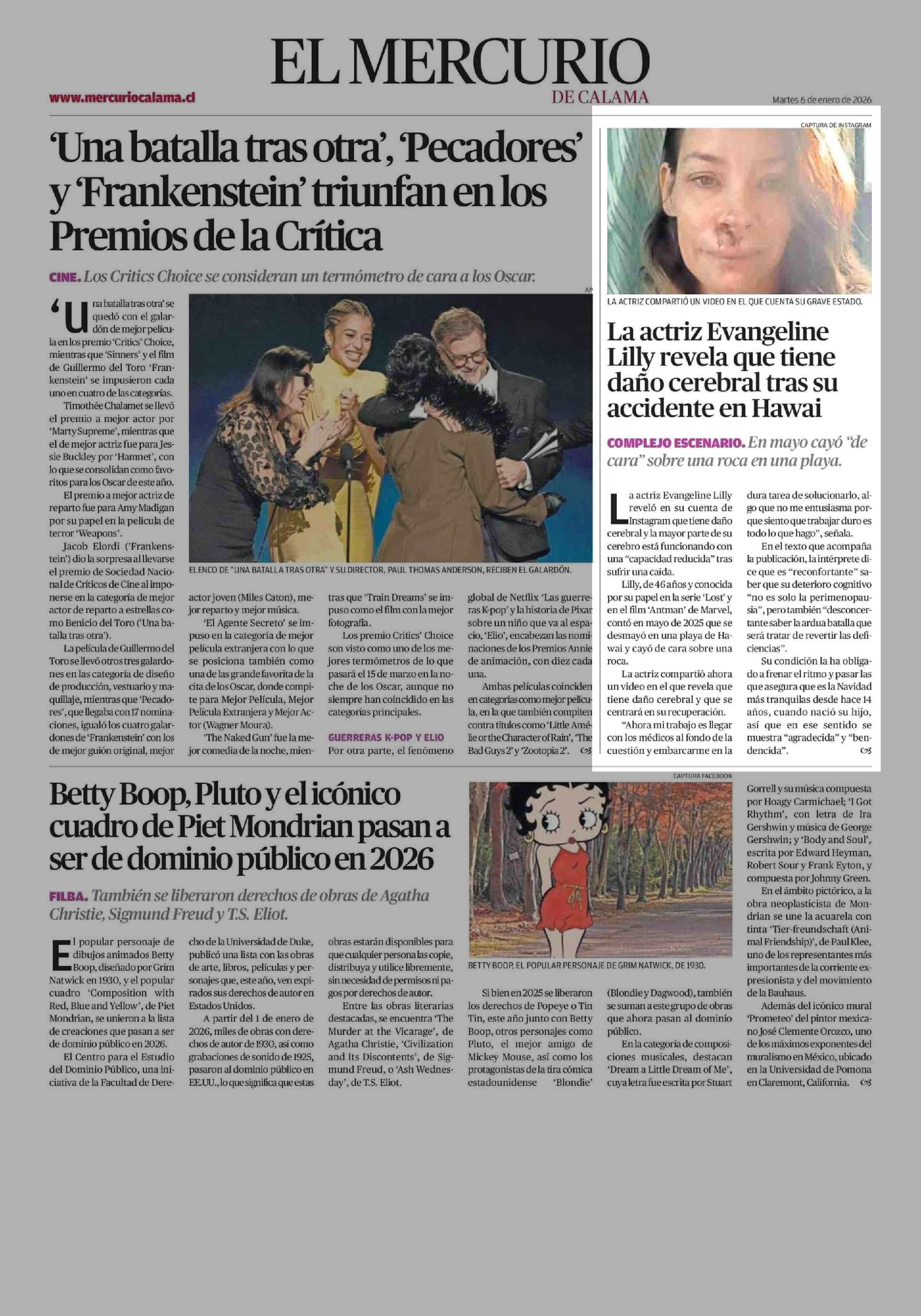 La actriz Evangeline Lilly revela que tiene daño cerebral tras su accidente en Hawai 06-01-2026 El Mercurio de Calama |