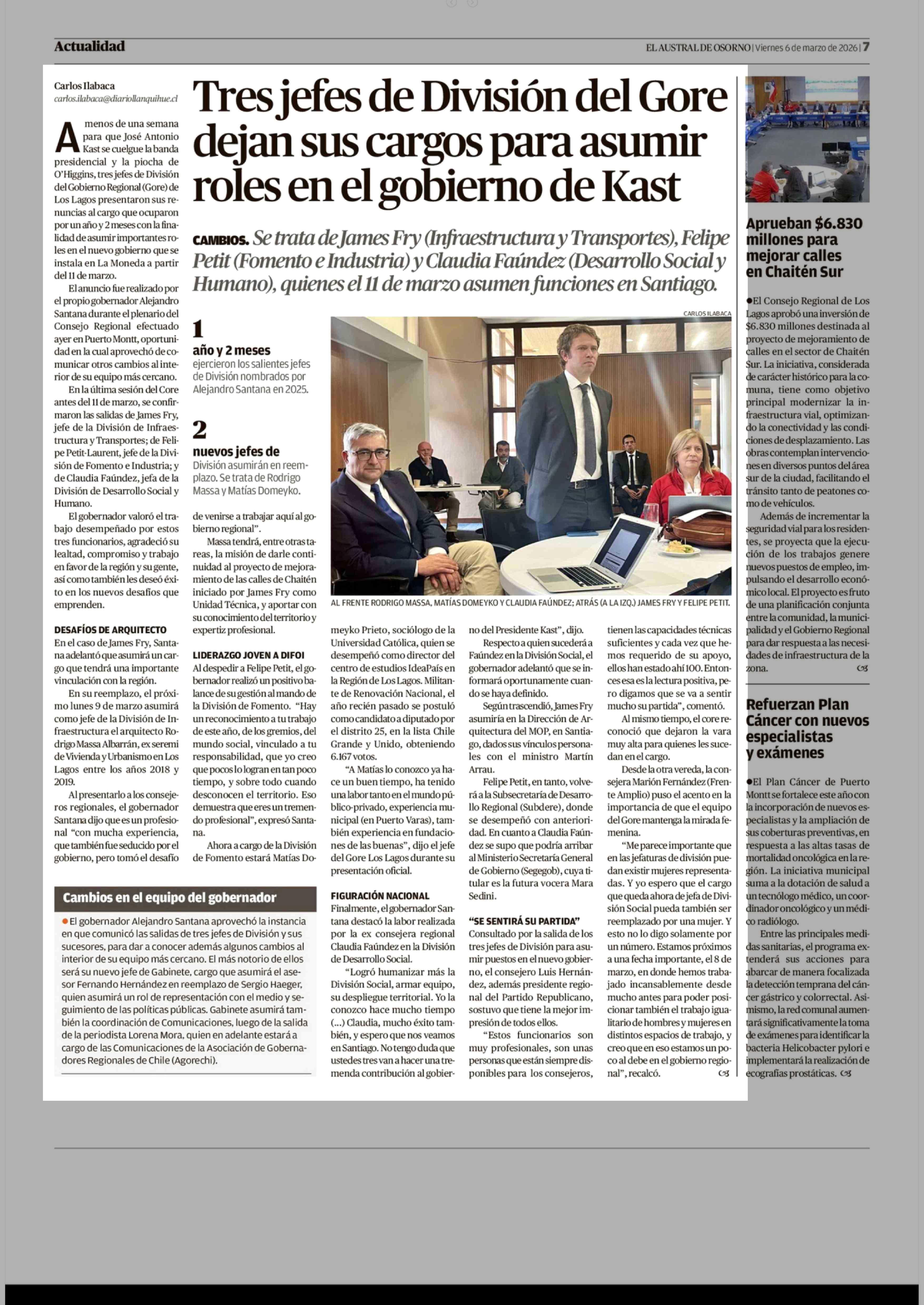 Tres jefes de División del Gore dejan sus cargos para asumir roles en el gobierno de Kast 06-03-2026 El Austral de Osorno |