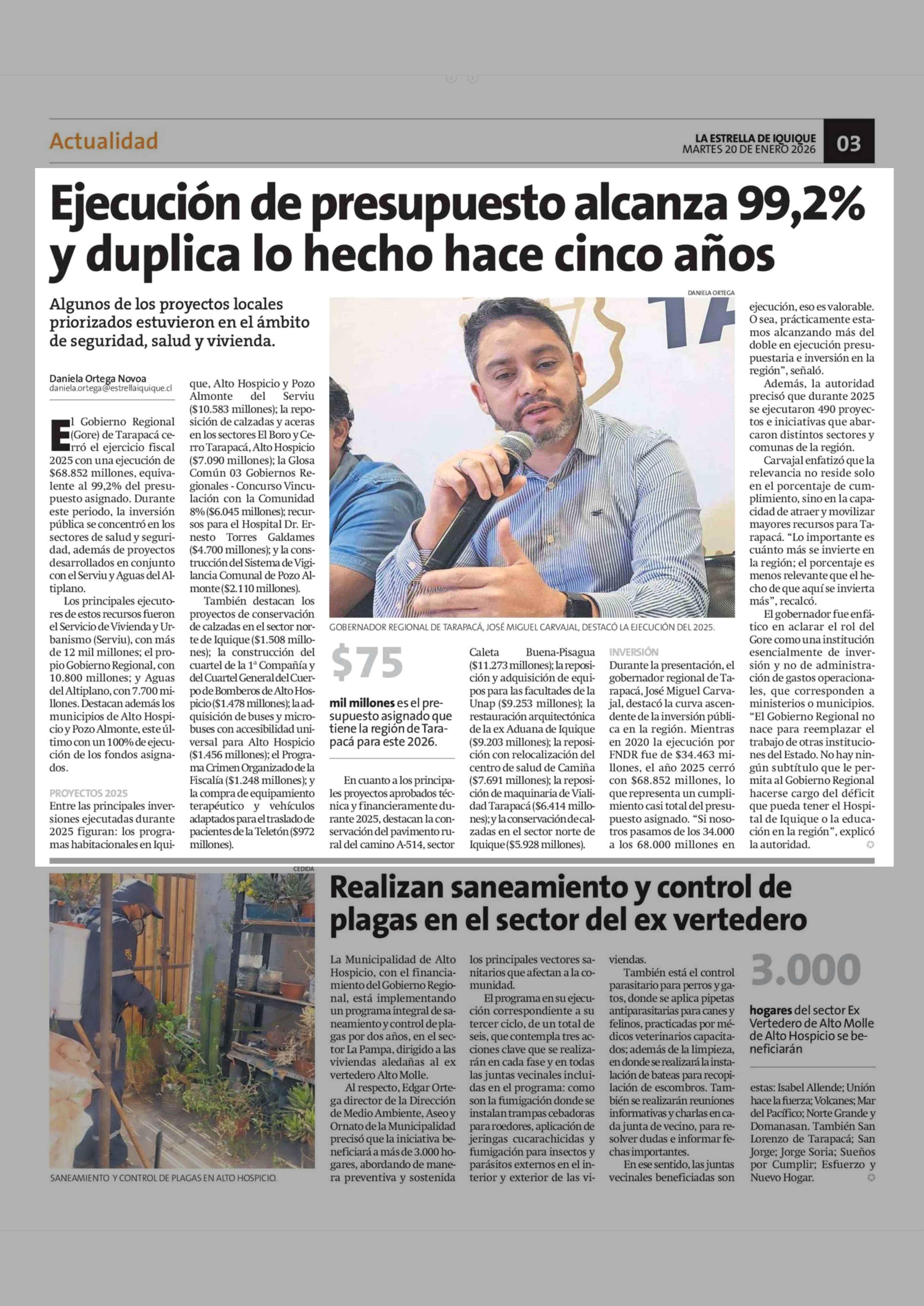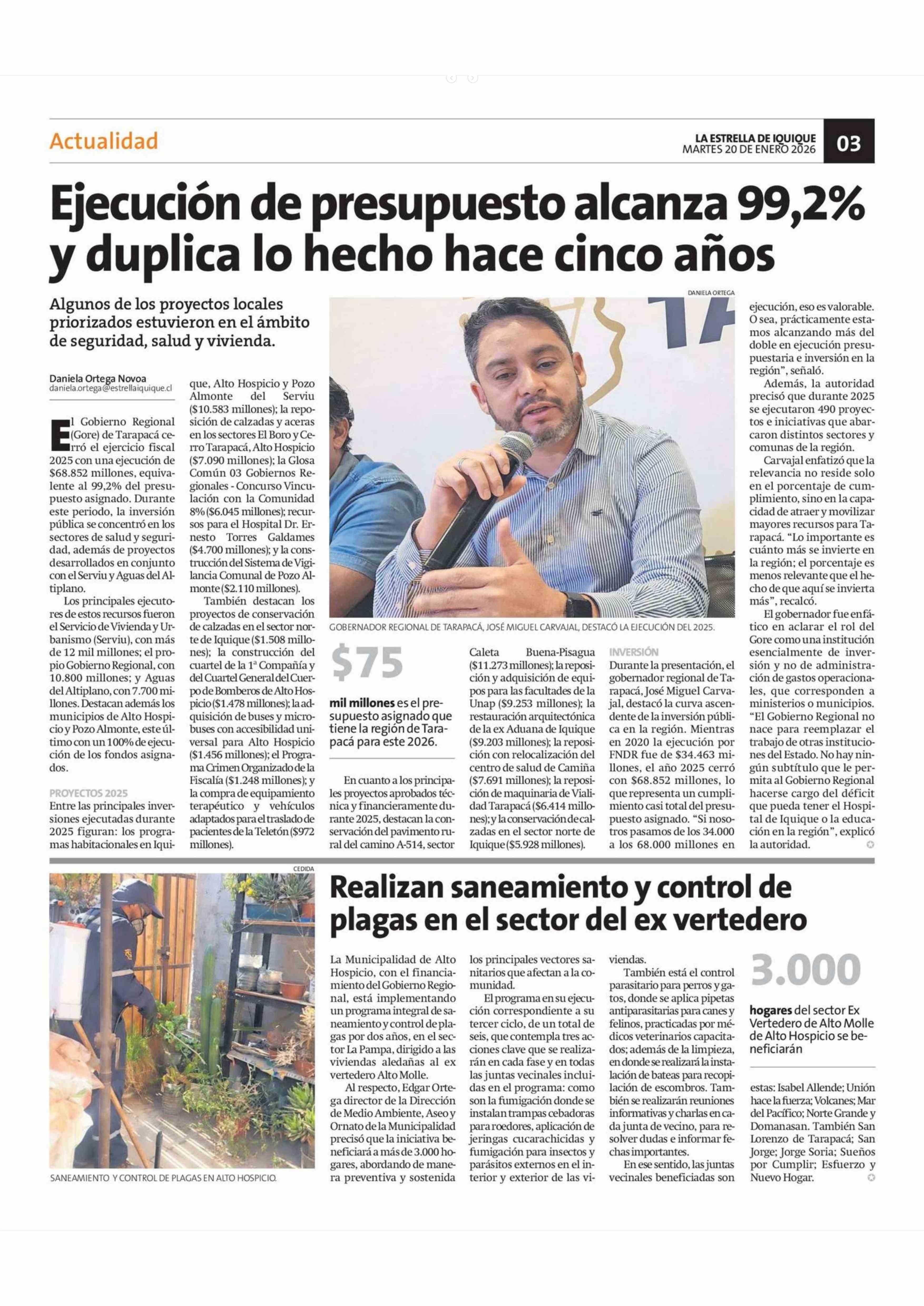 Ejecución de presupuesto alcanza 99,2% y duplica lo hecho hace cinco años 20-01-2026 La Estrella de Iquique |
