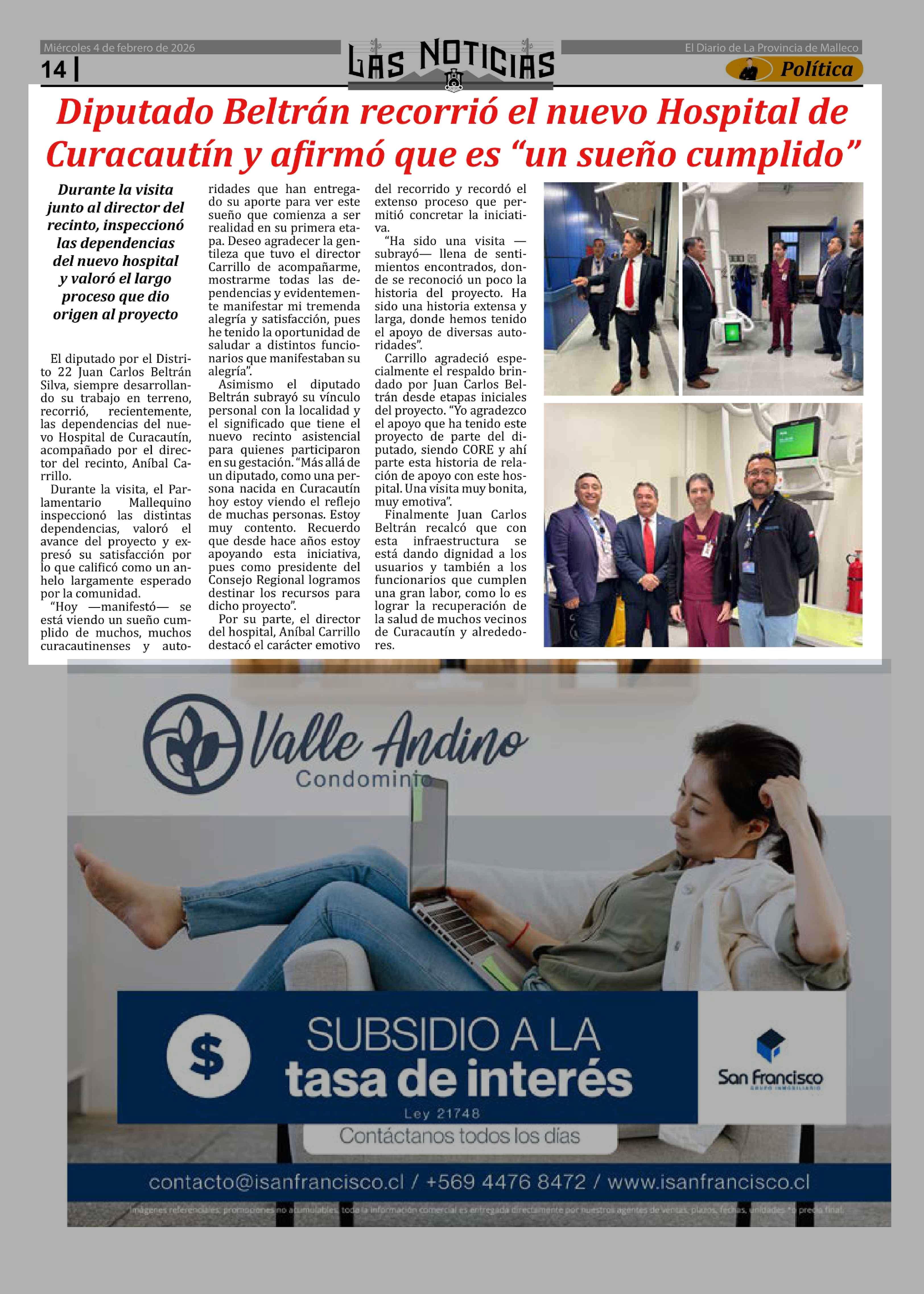 Diputado Beltrán recorrió el nuevo Hospital de Curacautín y afirmó que es "un sueño cumplido" 04-02-2026 Las Noticias |