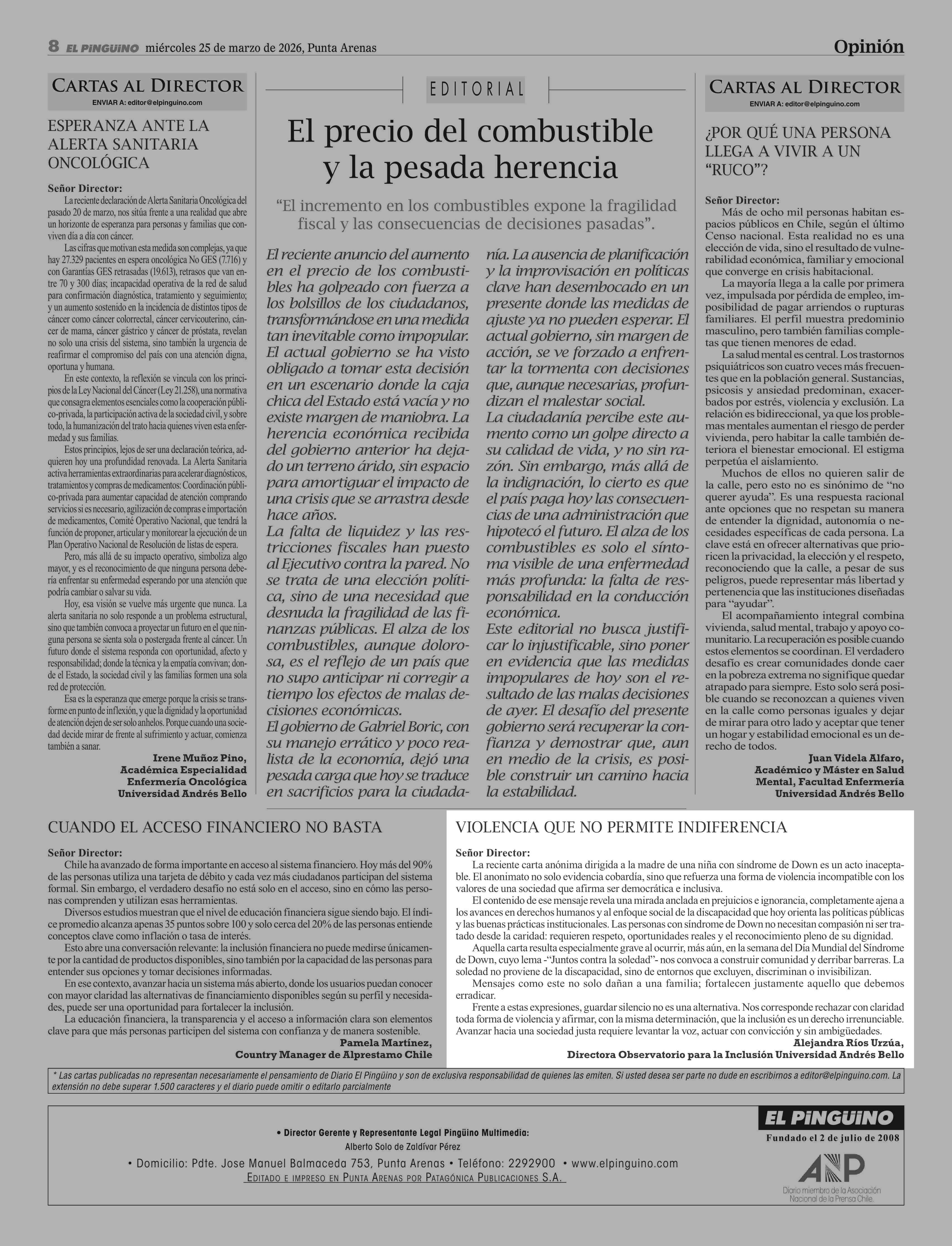 Cartas: Violencia que no Permite indiferencia 25-03-2026 El Pingüino |