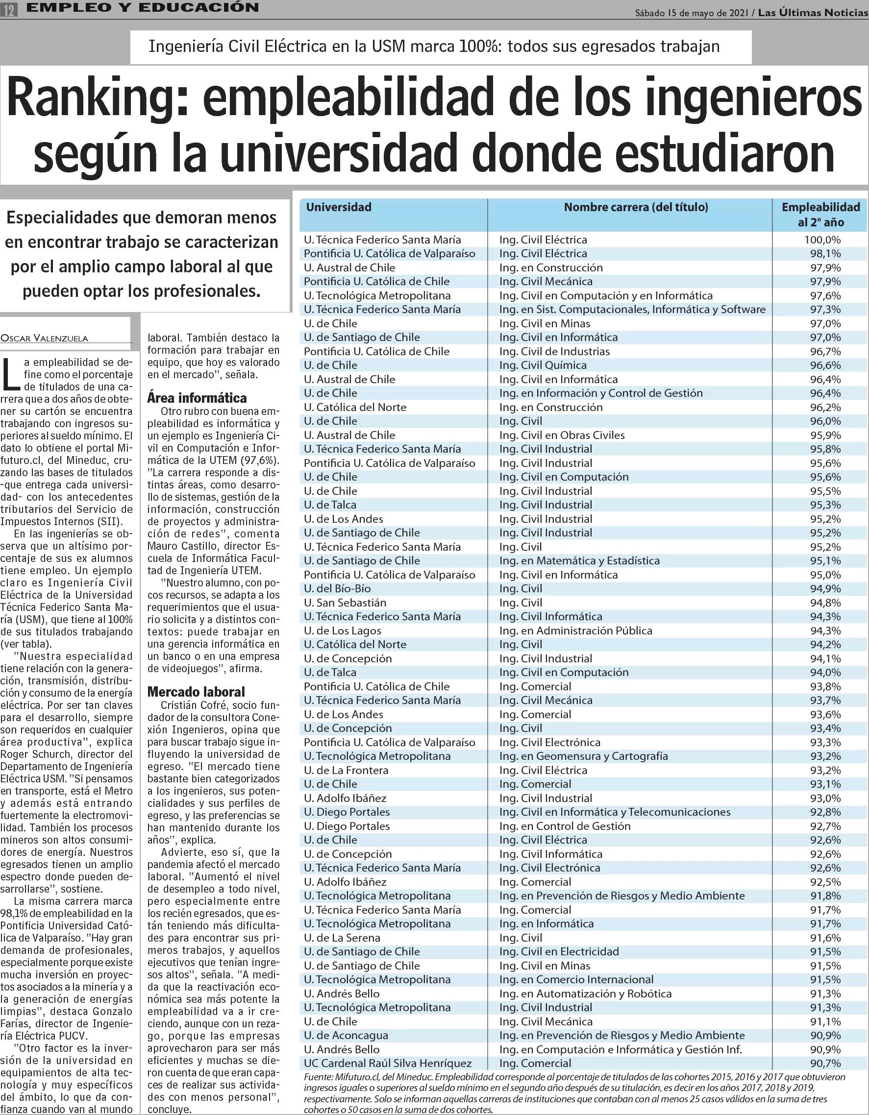 Ranking: empleabilidad de los ingenieros según la universidad donde estudiaron 15-05-2021 Las Últimas Noticias |