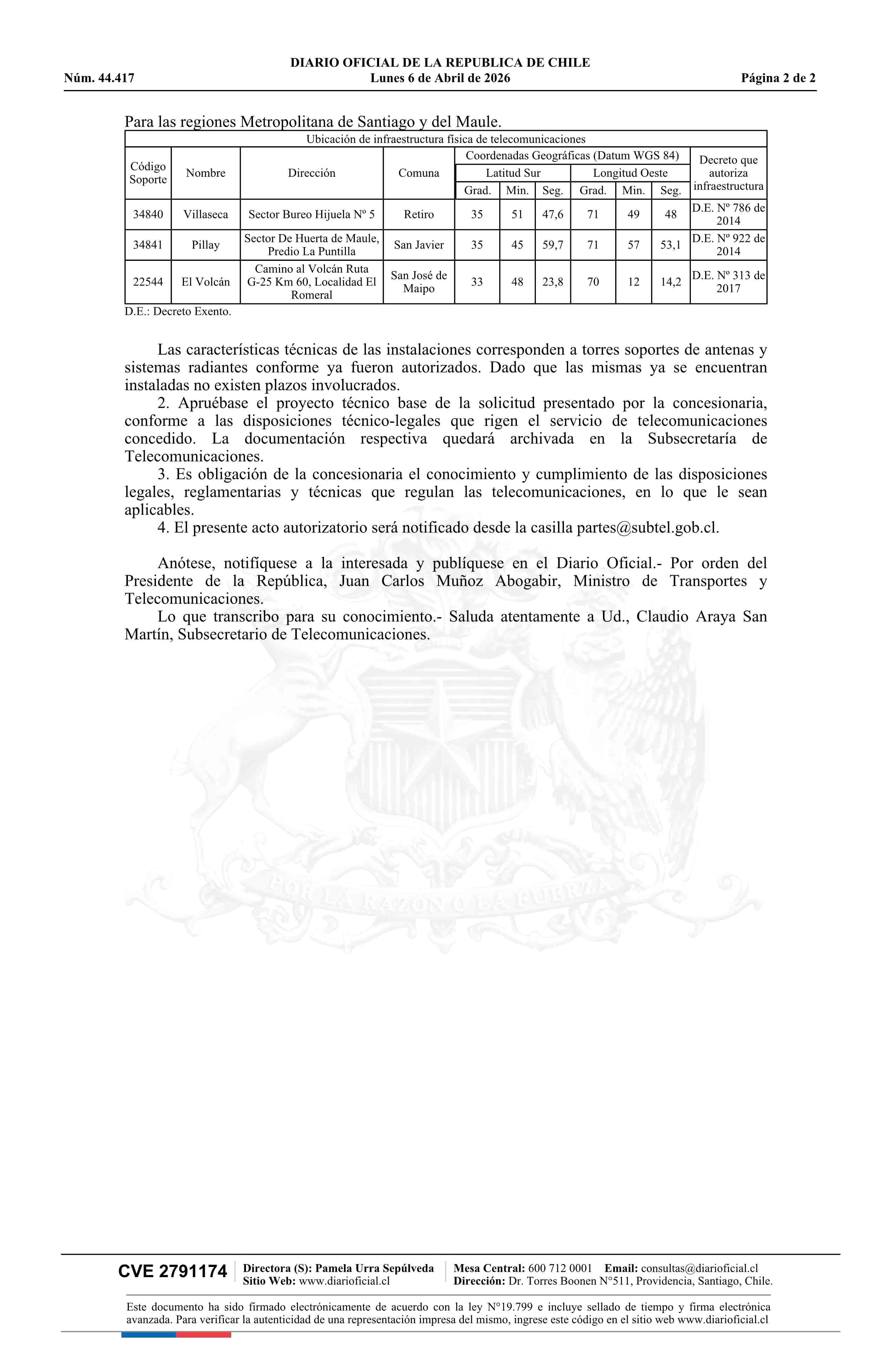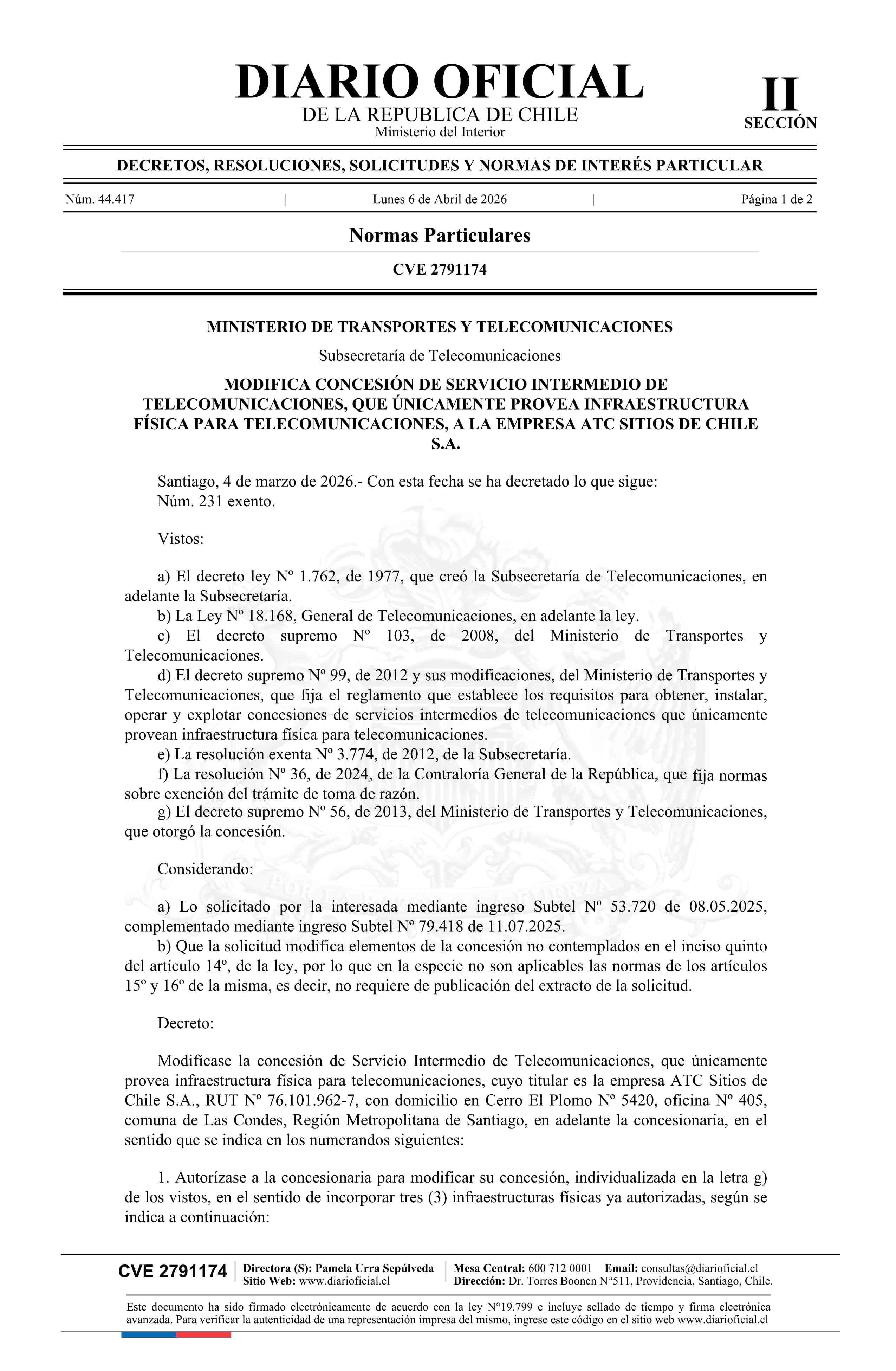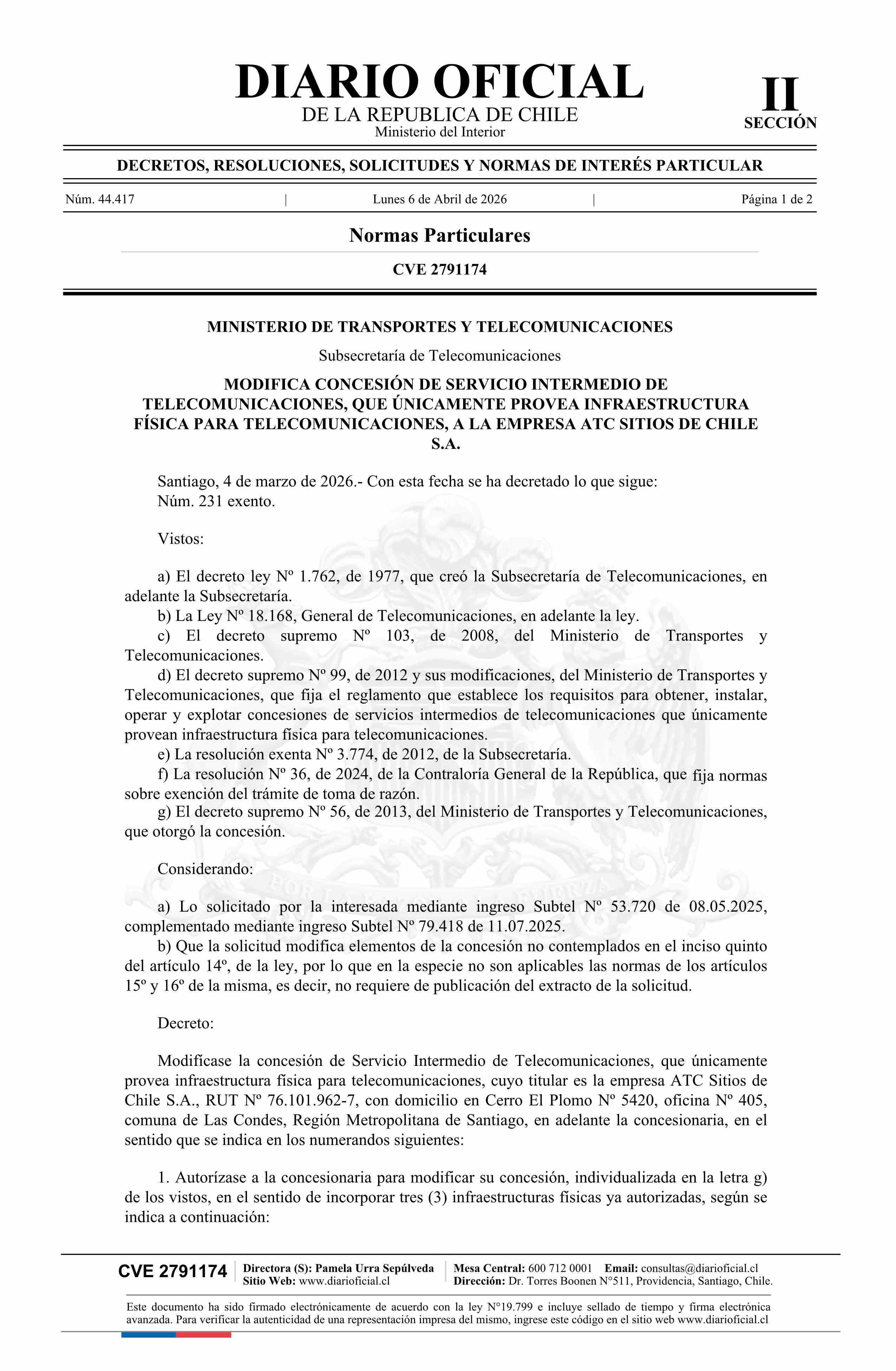 | Título: | Decreto exento número 231, de 2026.- Modifica concesión de servicio intermedio de telecomunicaciones, que únicamente provea infraestructura física para telecomunicaciones, a la empresa ATC Sitios de Chile S.A. |
