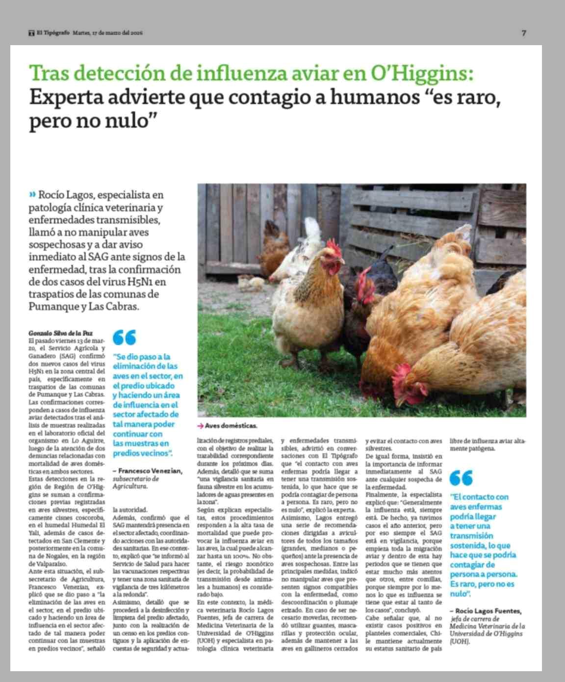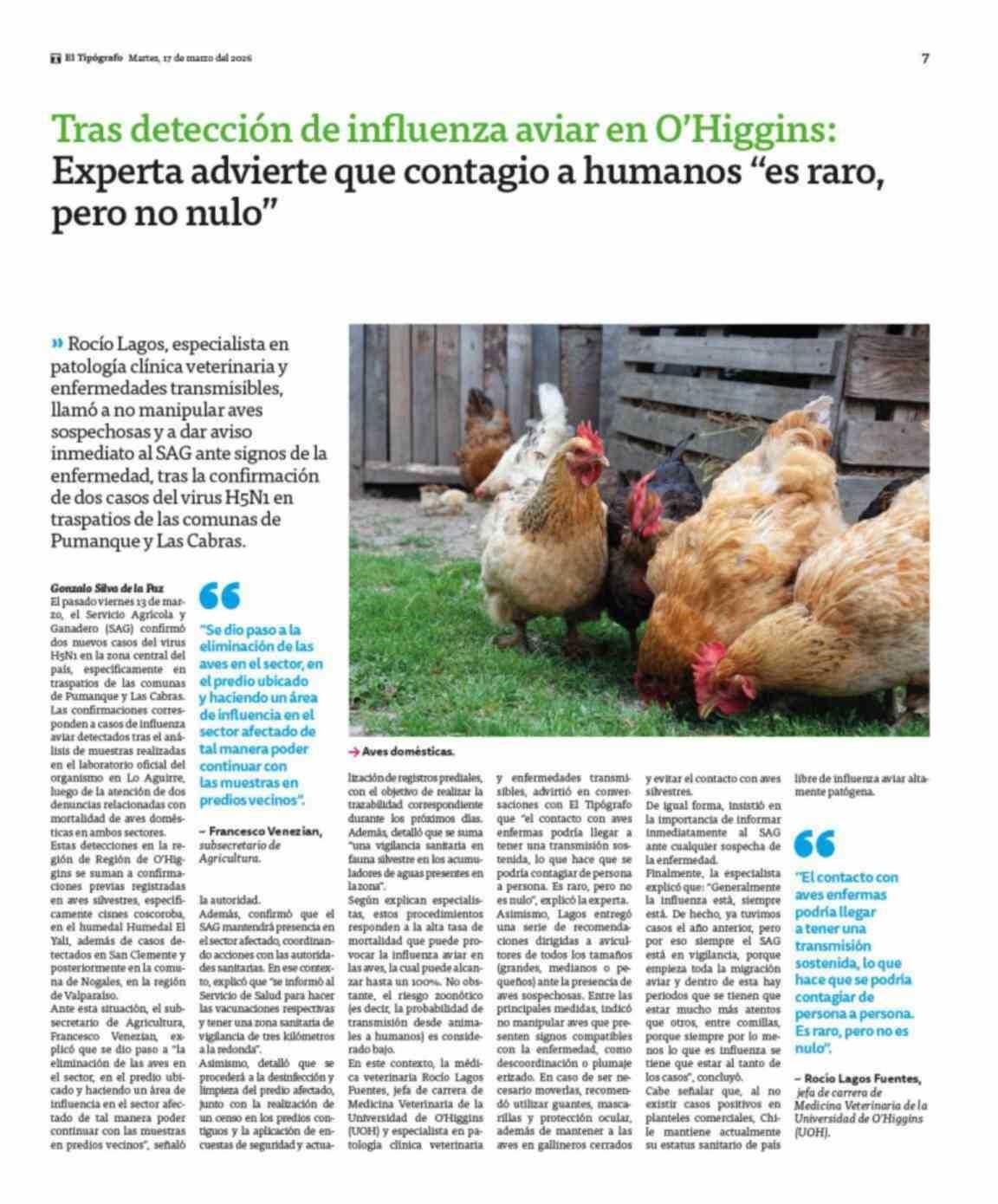 Tras detección de influenza aviar en O'Higgins: Experta advierte que contagio a humanos "es raro, pero no nulo" 17-03-2026 El Tipógrafo |