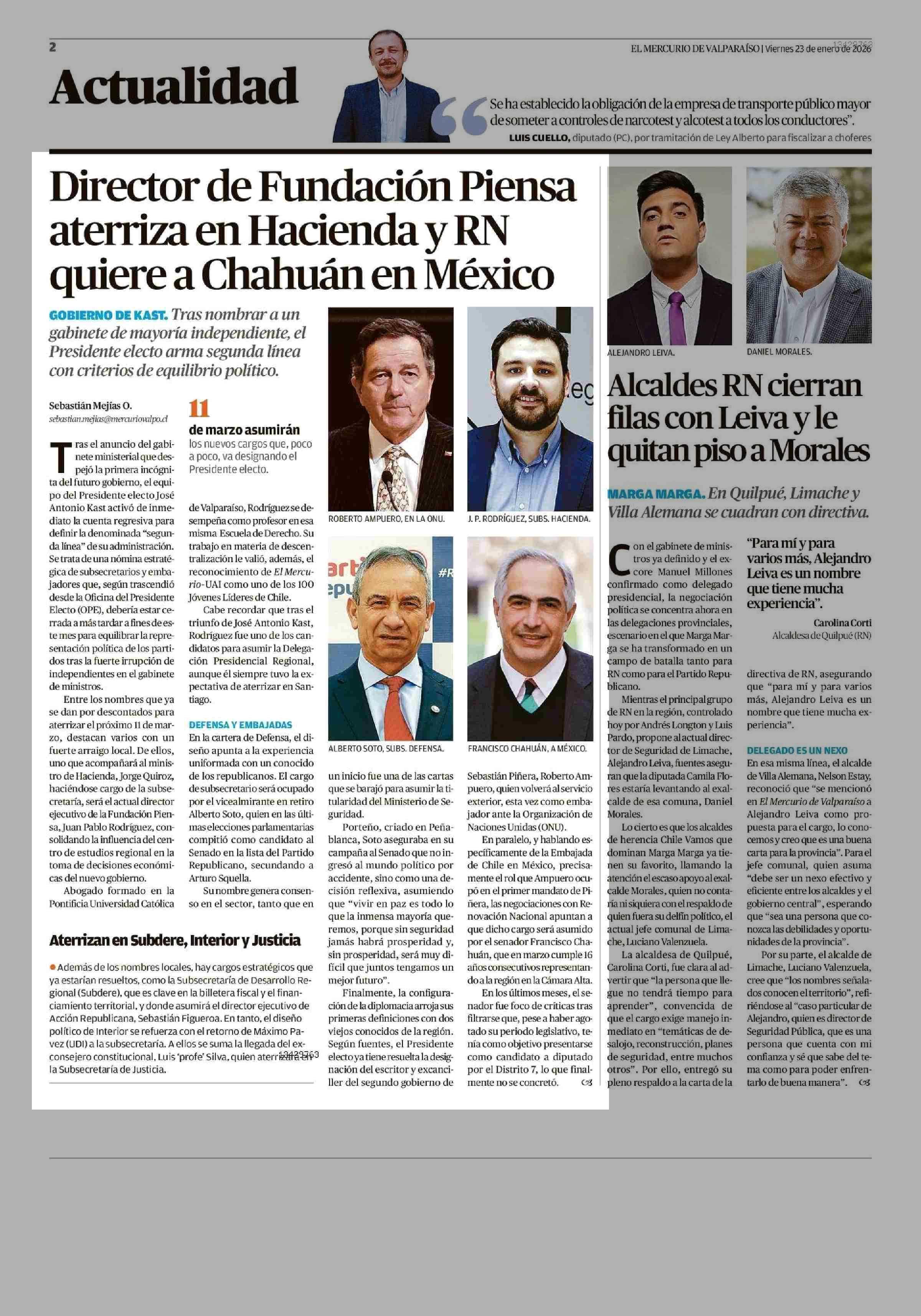 Director de Fundación Piensa aterriza en Hacienda y RN quiere a Chahuán en México 23-01-2026 El Mercurio de Valparaíso |