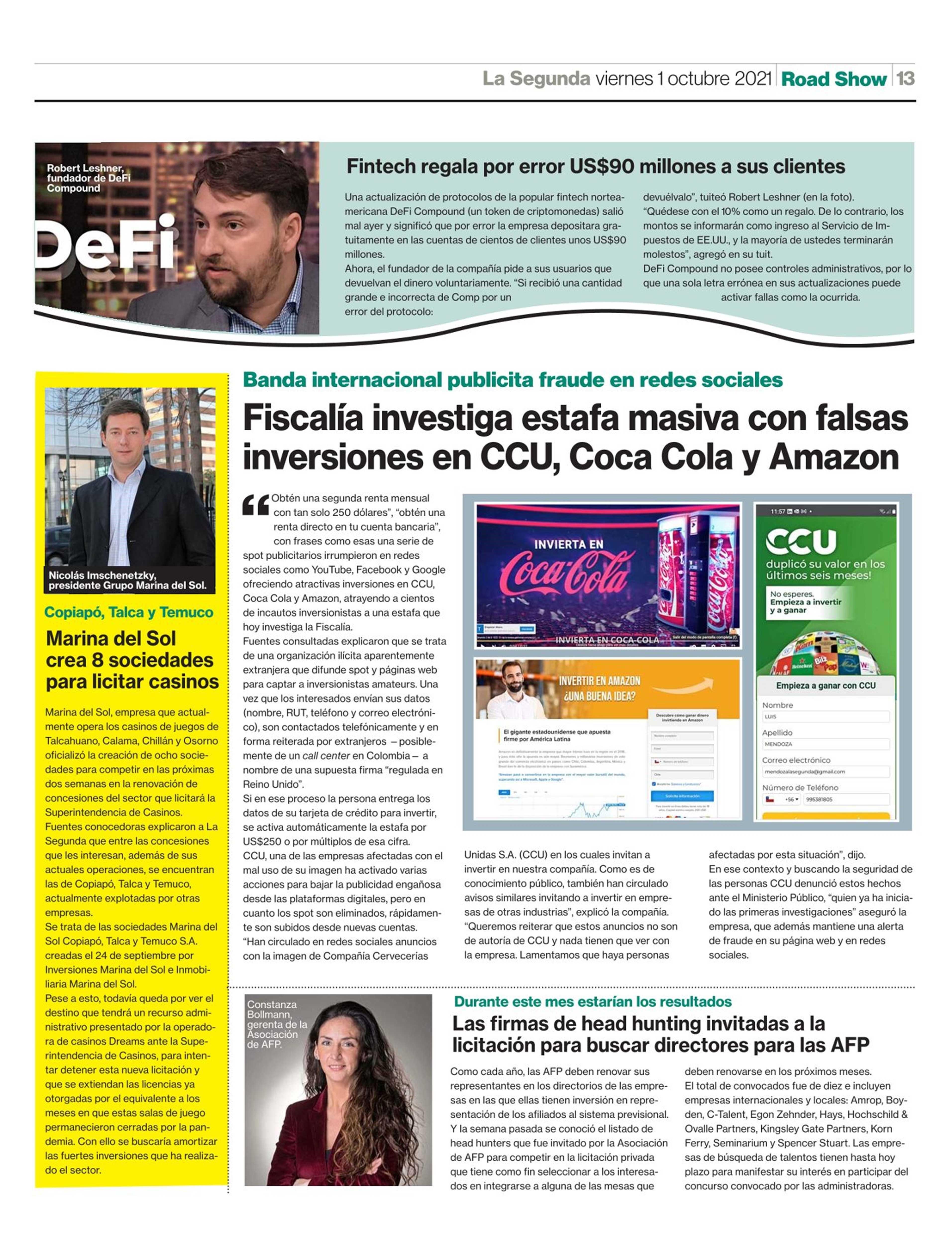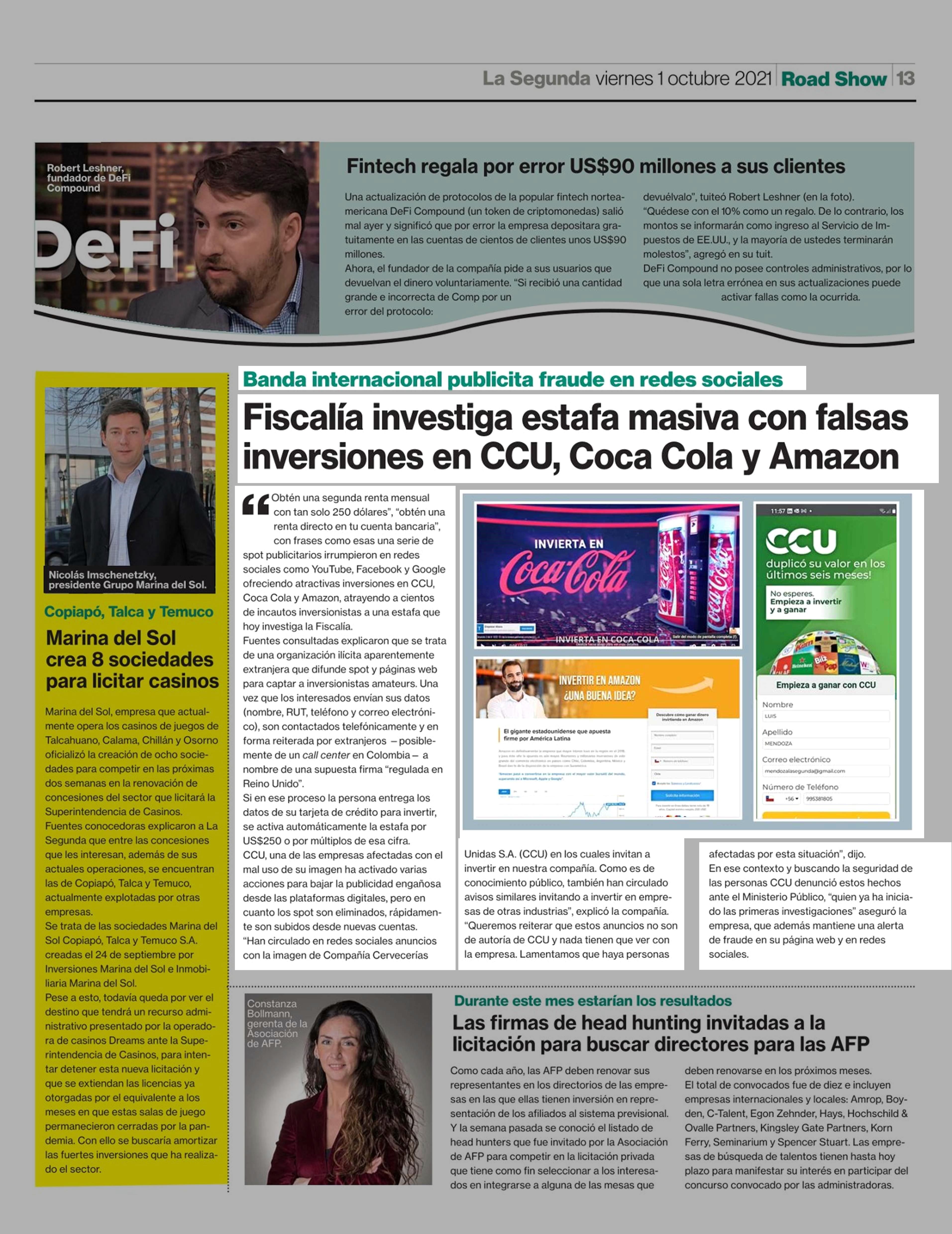 Fiscalía investiga estafa masiva con falsas inversiones en CCU, Coca Cola y Amazon 01-10-2021 La Segunda |
