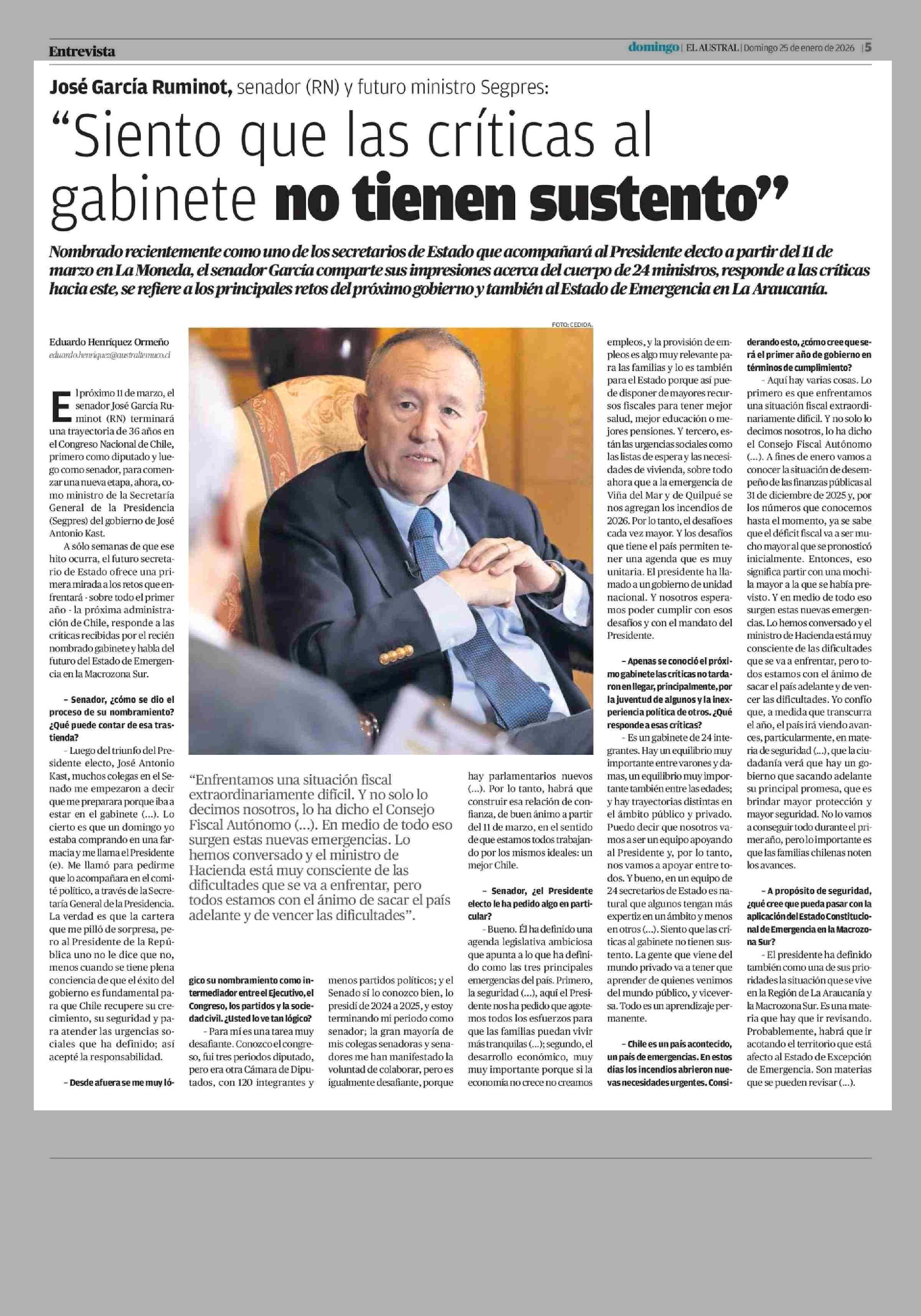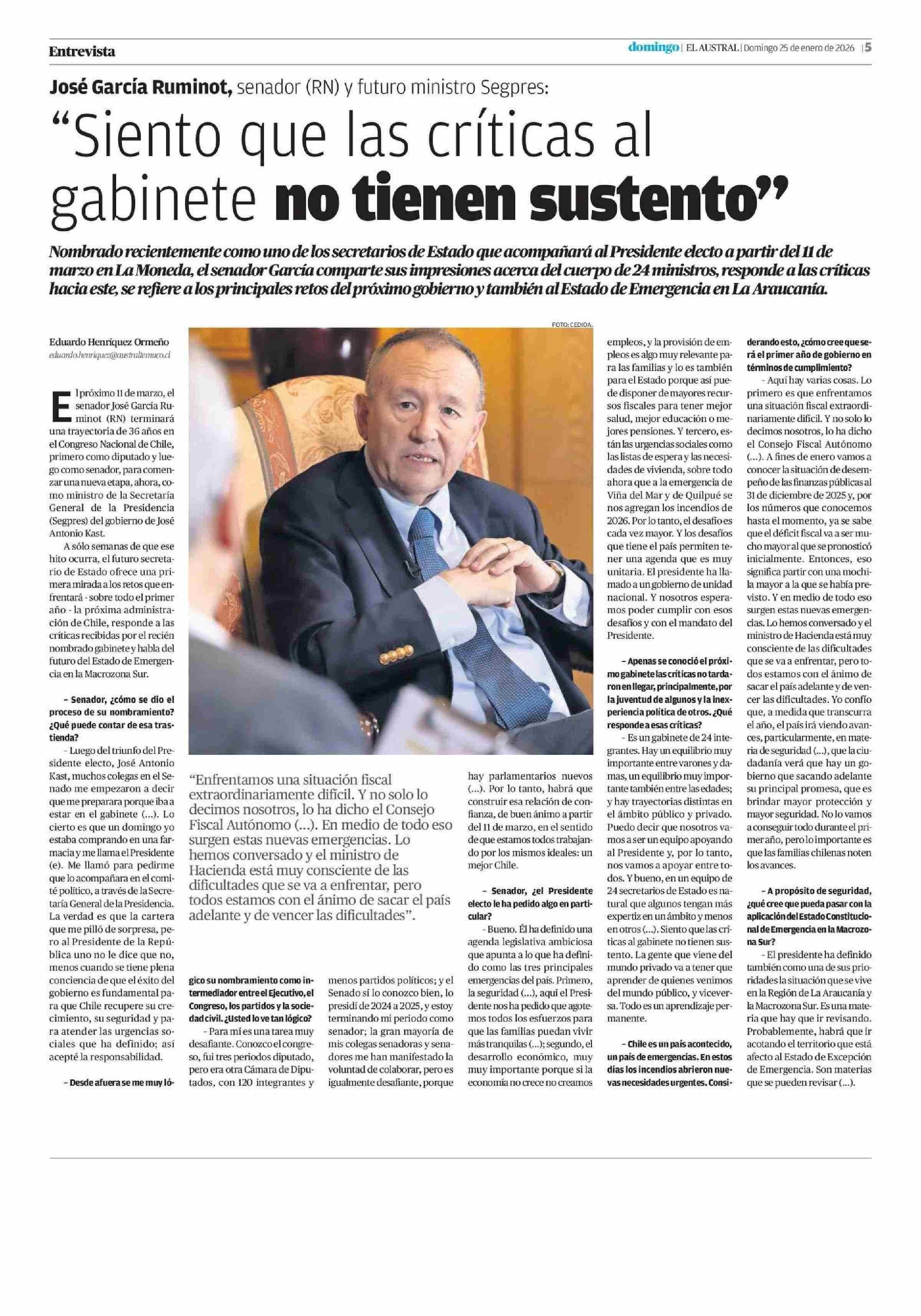 "Siento que las críticas al gabinete no tienen sustento" 25-01-2026 El Austral de la Araucanía |