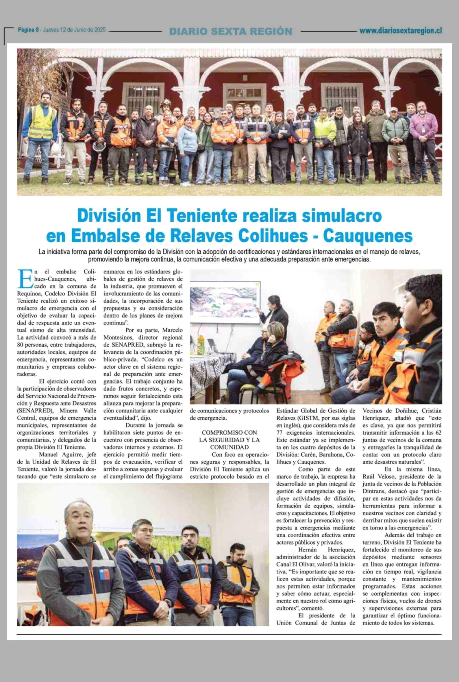 División El Teniente realiza simulacro en Embalse de Relaves Colihues - Cauquenes 12-06-2025 Diario VI Región |