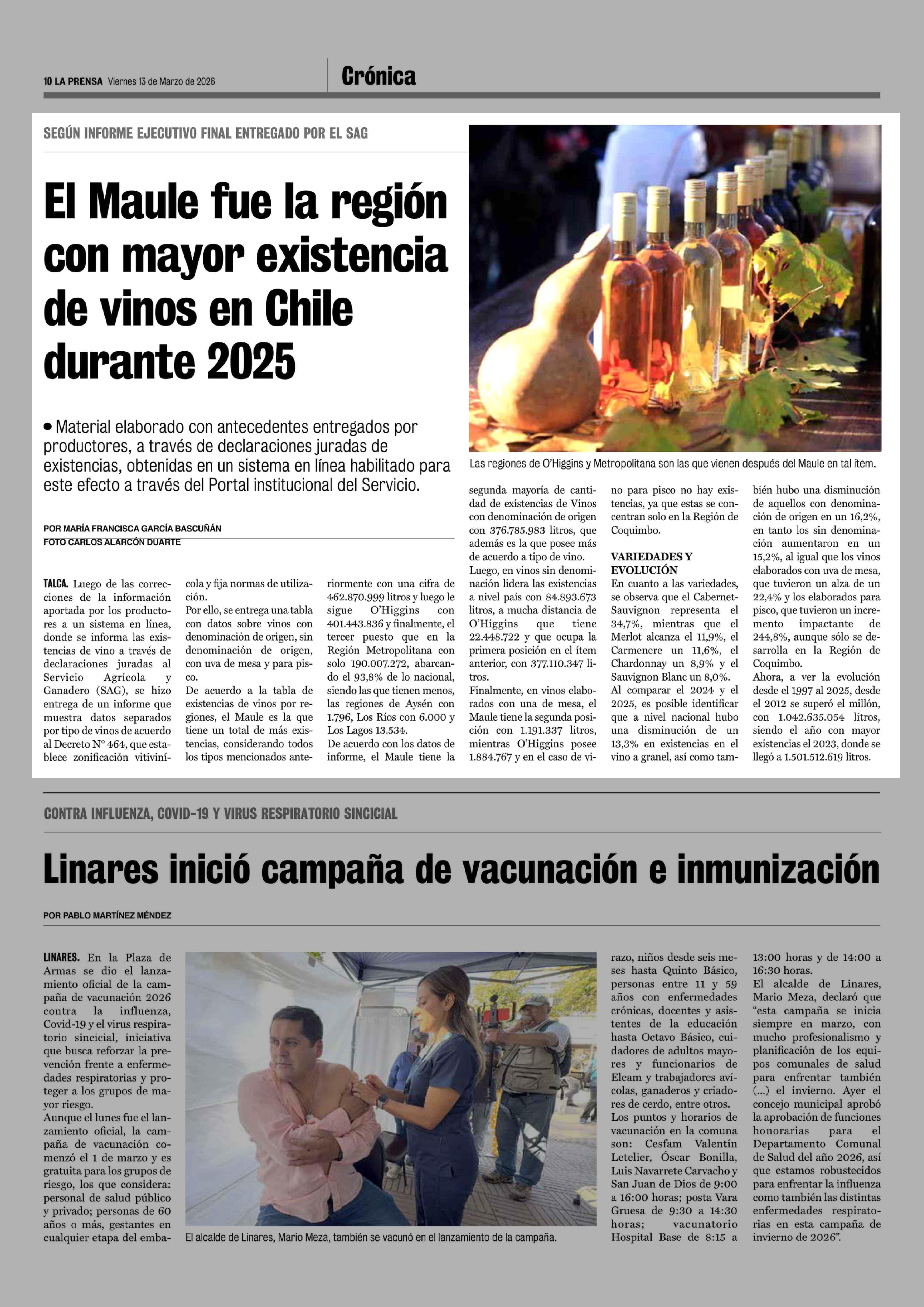 El Maule fue la región con mayor existencia de vinos en Chile durante 2025 13-03-2026 La Prensa de Curicó |