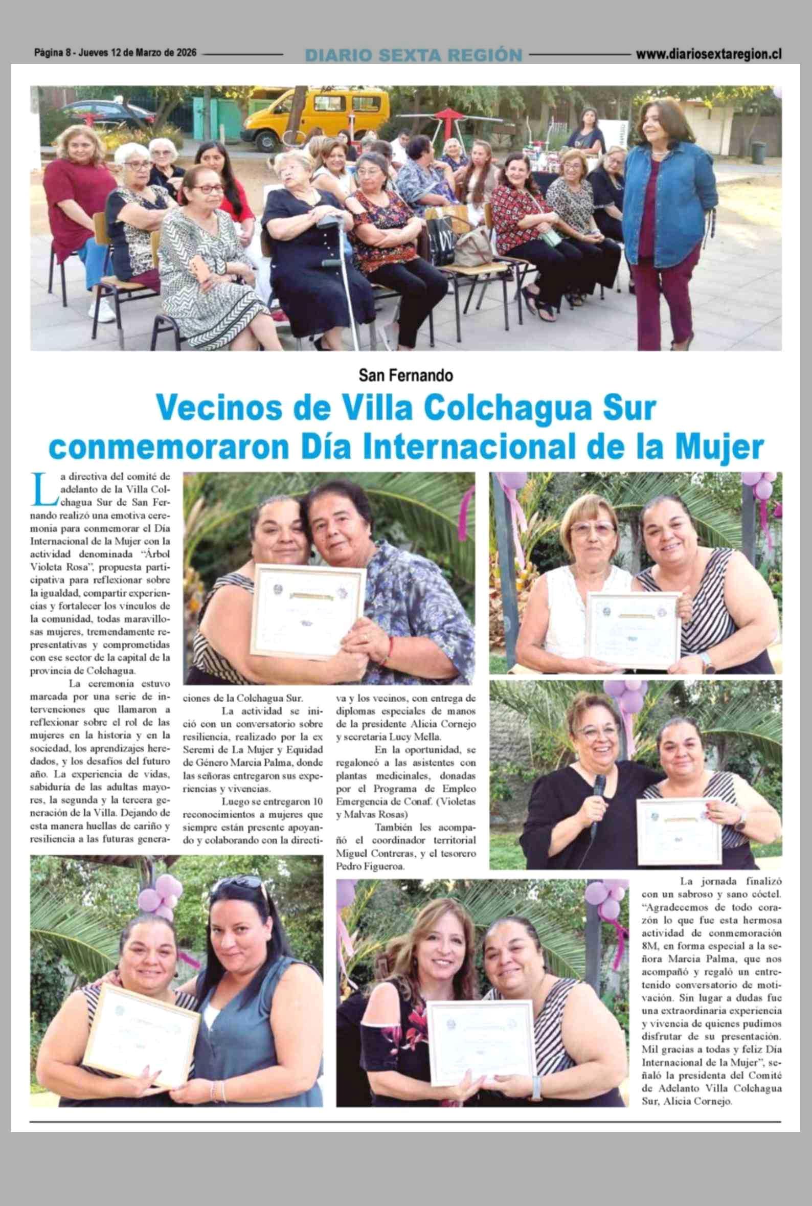 Vecinos de Villa Colchagua Sur conmemoraron Día Internacional de la Mujer 12-03-2026 Diario VI Región |