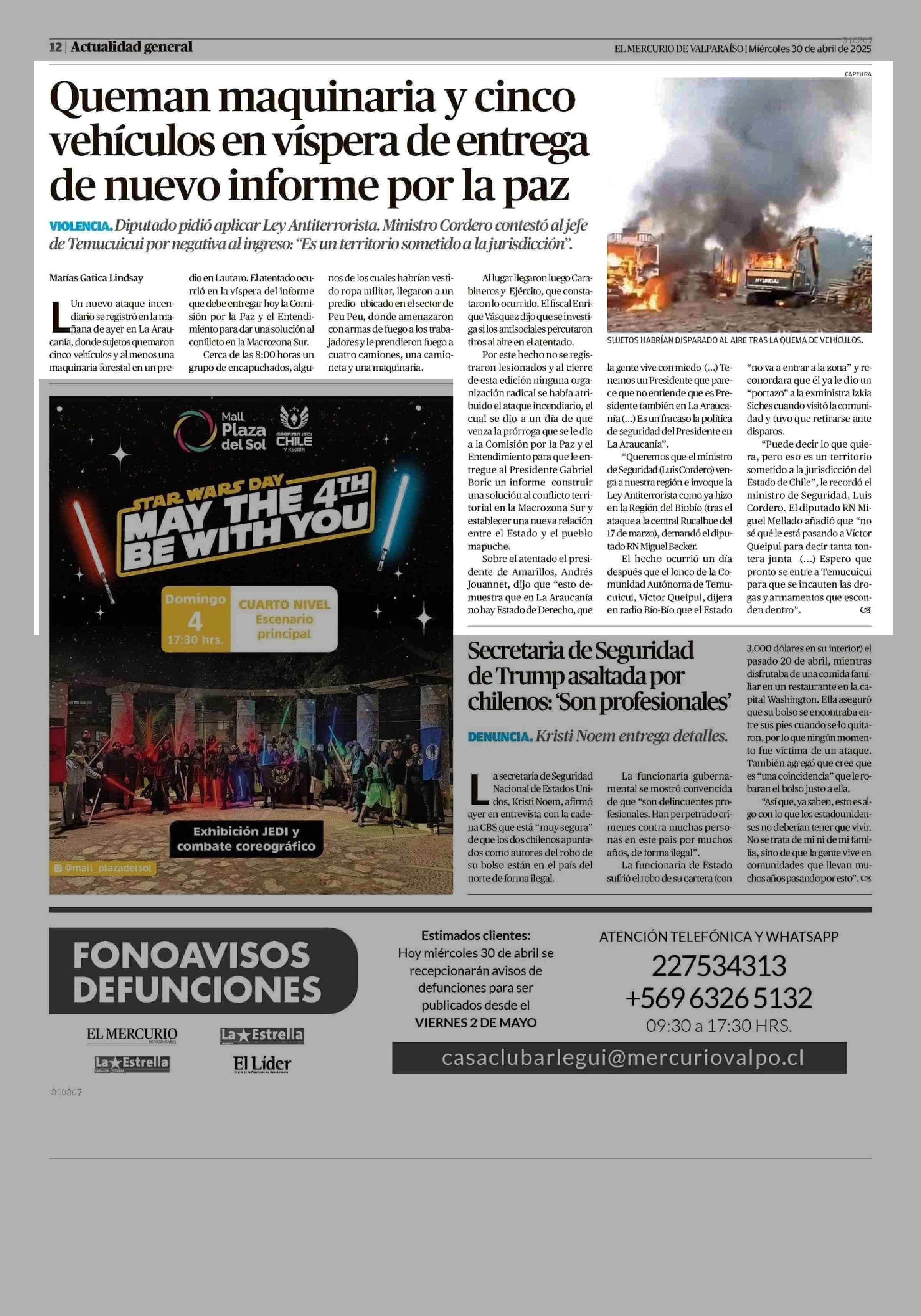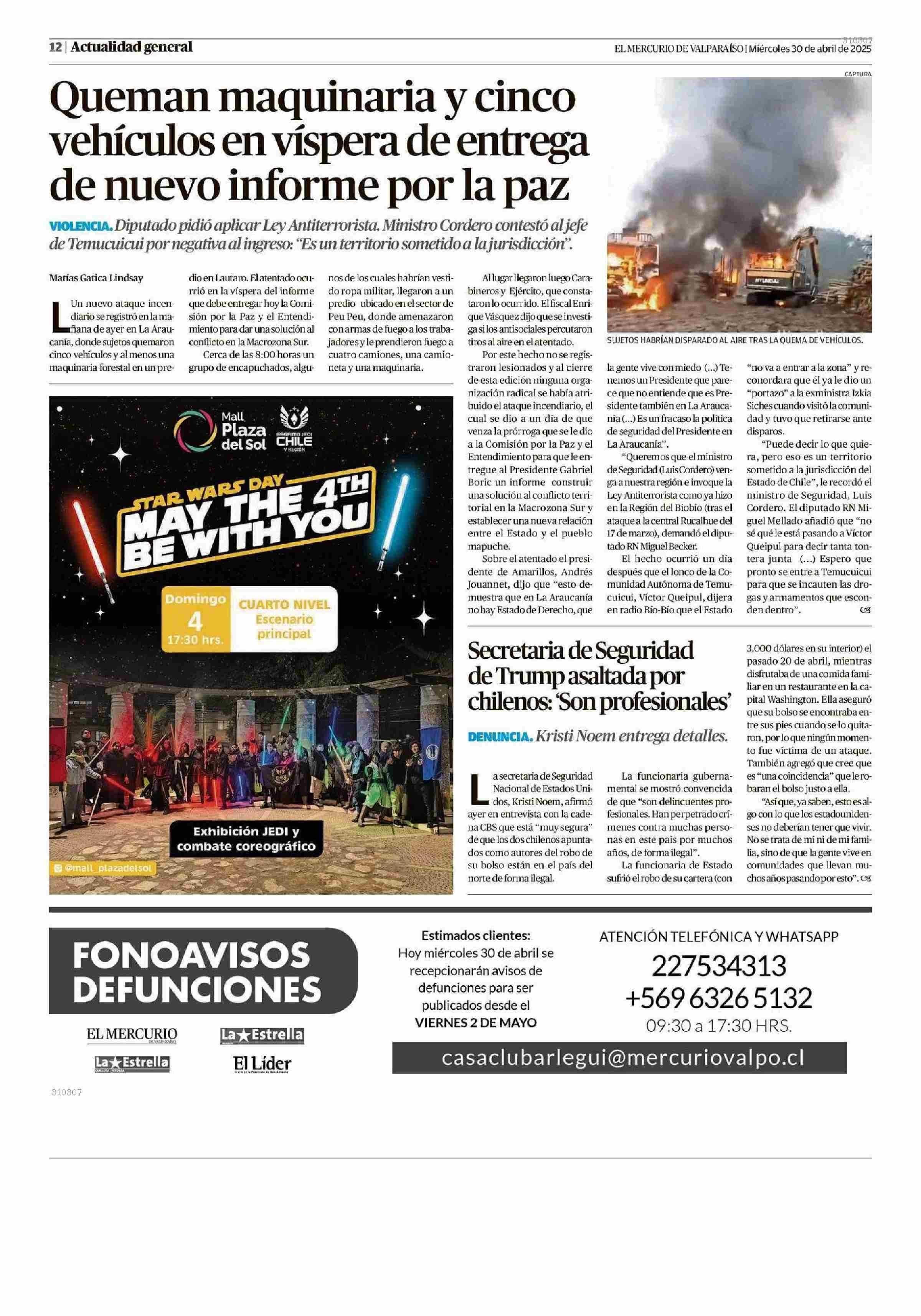 Queman maquinaria y cinco vehículos en víspera de entrega de nuevo informe por la paz 30-04-2025 El Mercurio de Valparaíso |