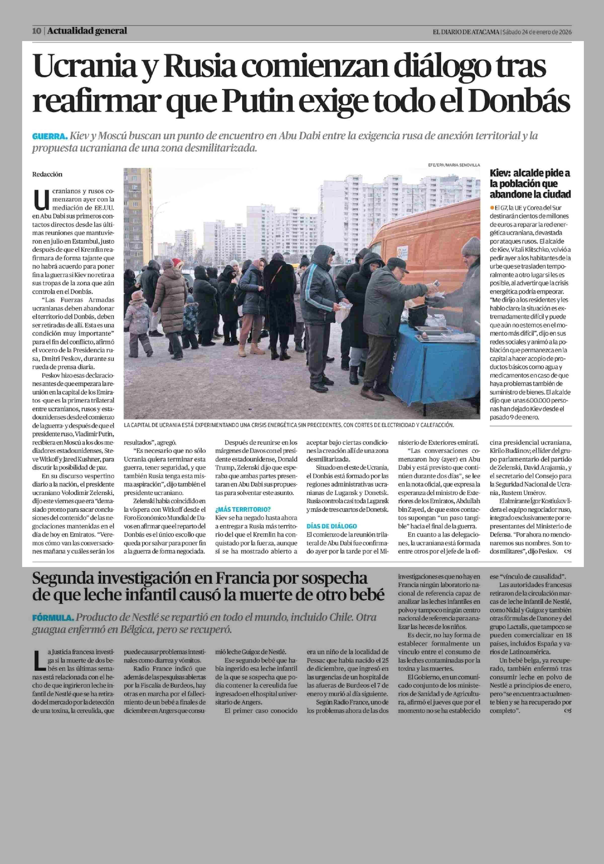 Ucrania y Rusia comienzan diálogo tras reafirmar que Putin exige todo el Donbás 24-01-2026 El Diario de Atacama |
