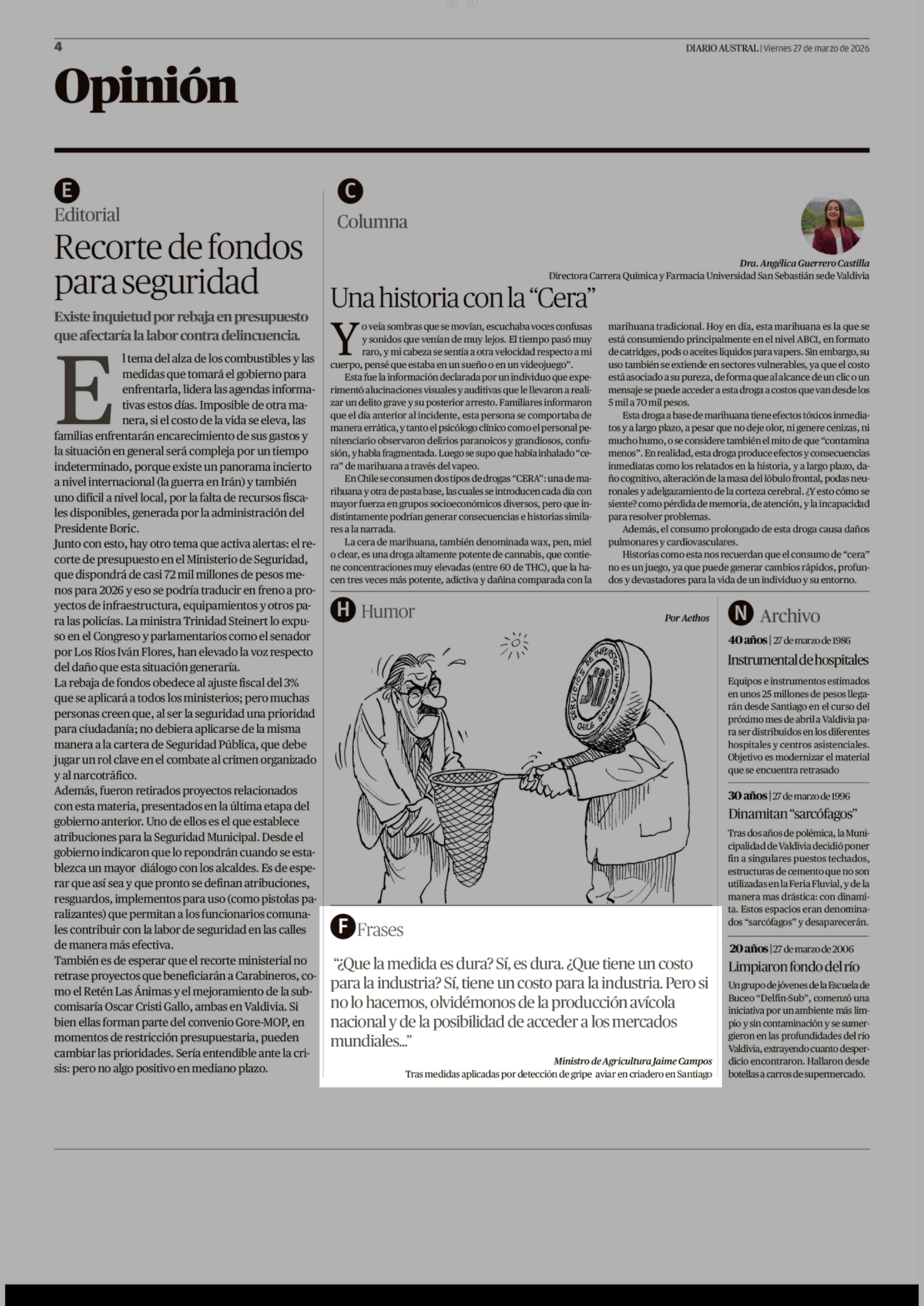 Ministro de Agricultura Jaime Campos Tras medidas aplicadas por detección de gripe aviar en criadero en Santiago 27-03-2026 Diario Austral Región de Los Ríos |