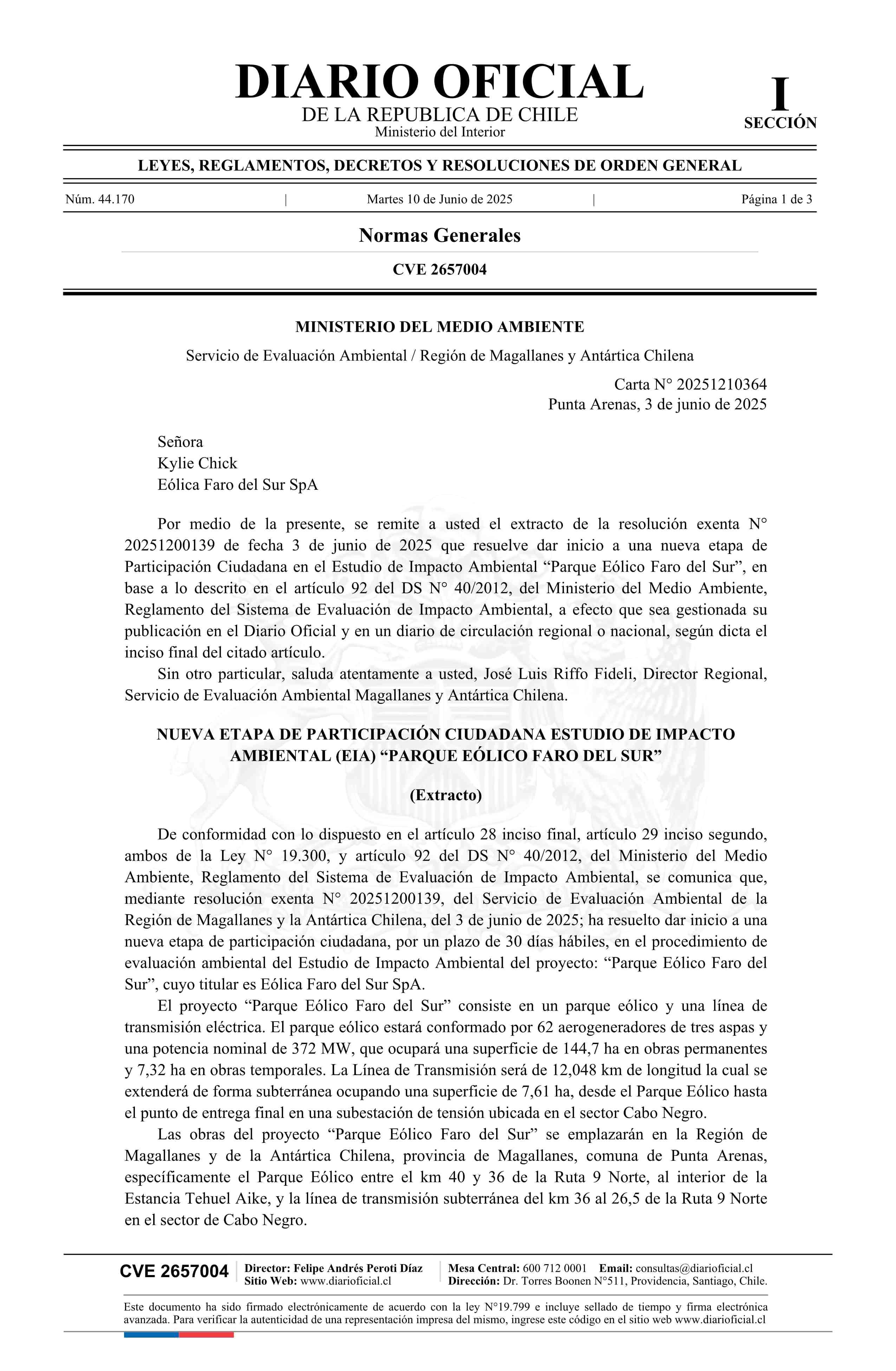 | Título: | Extracto de resolución exenta número 20251200139, de 2025.- Inicia nueva etapa de participación ciudadana por Adenda al Estudio de Impacto Ambiental del proyecto Parque Eólico Faro del Sur |