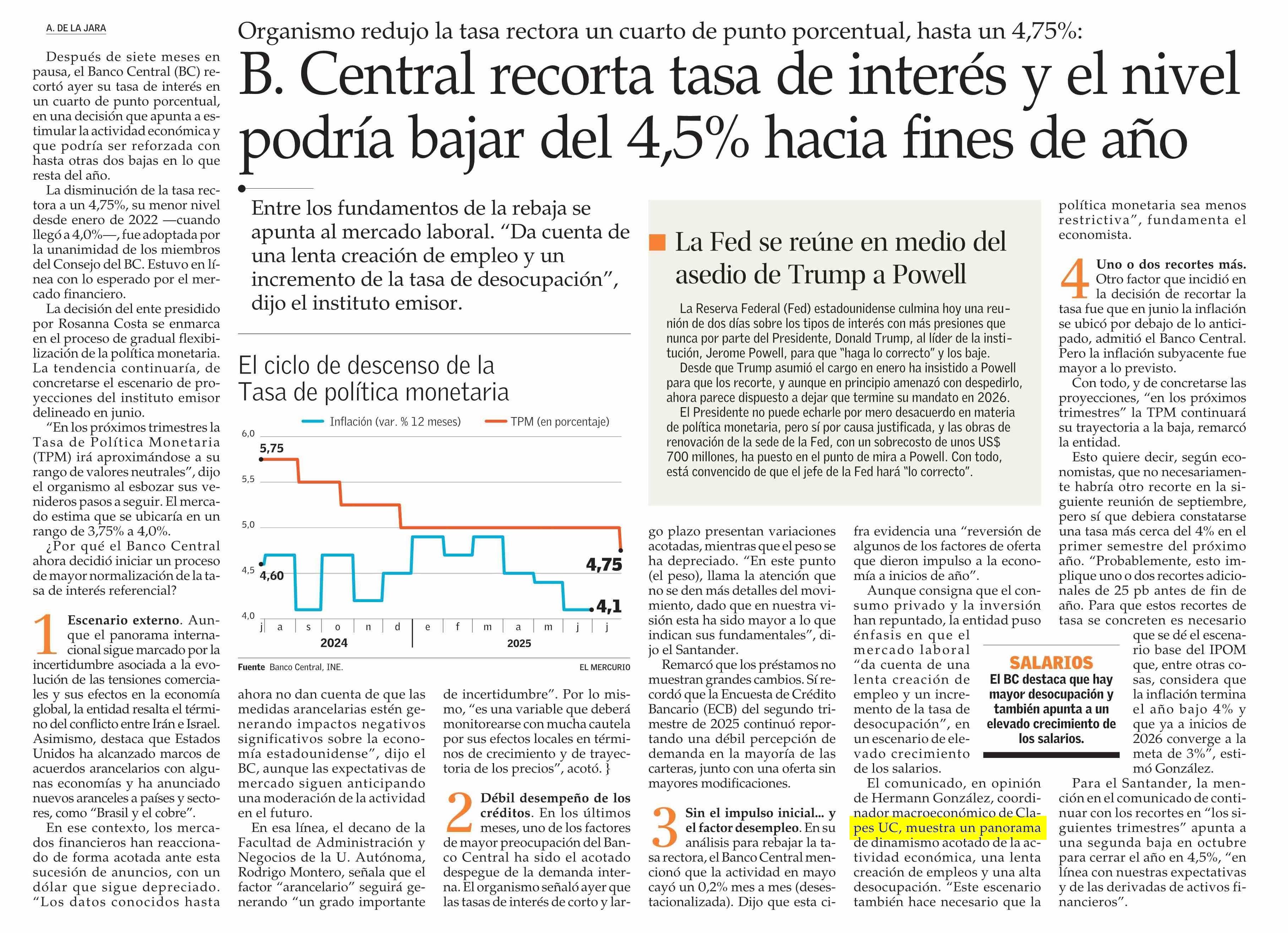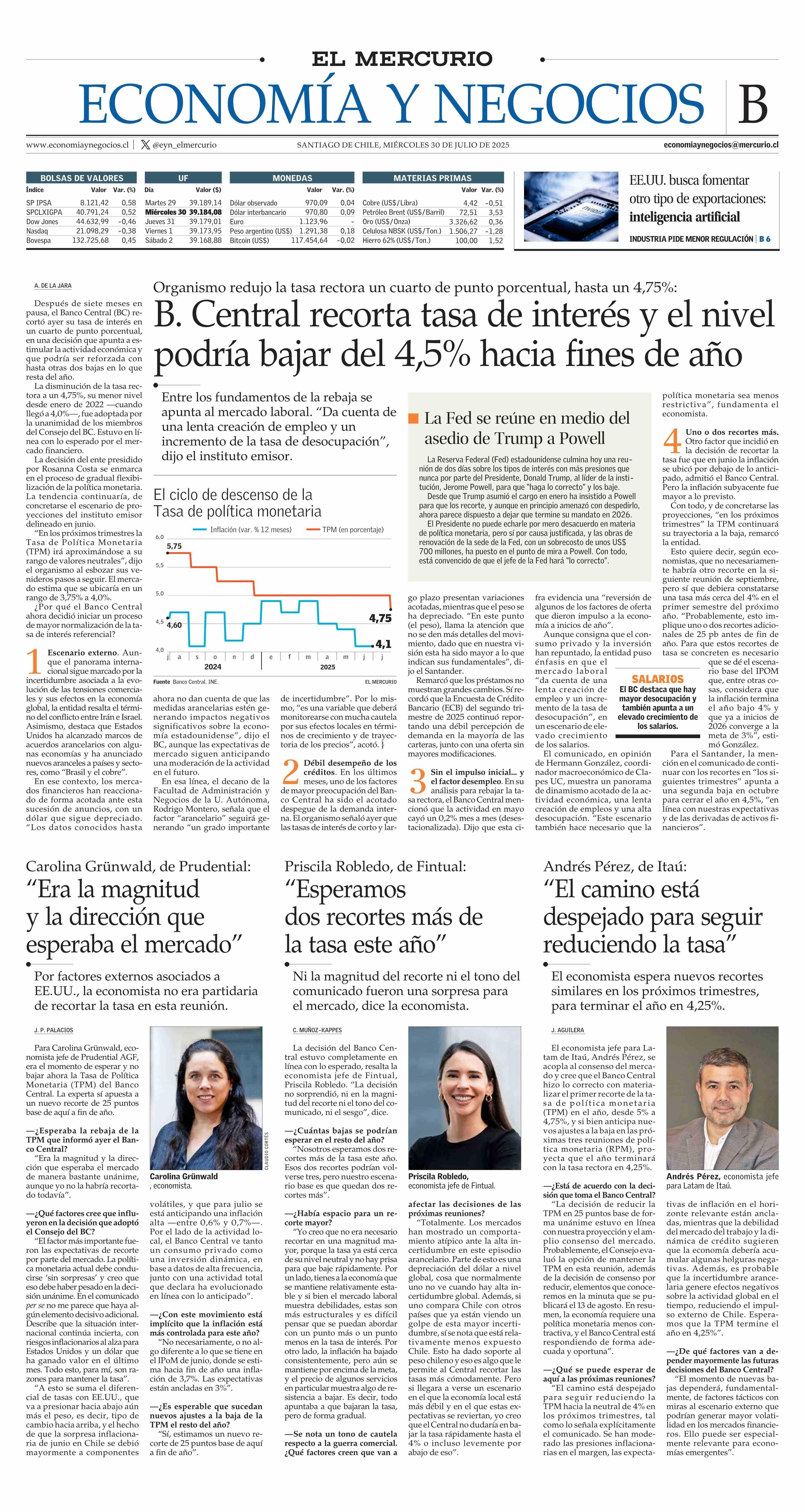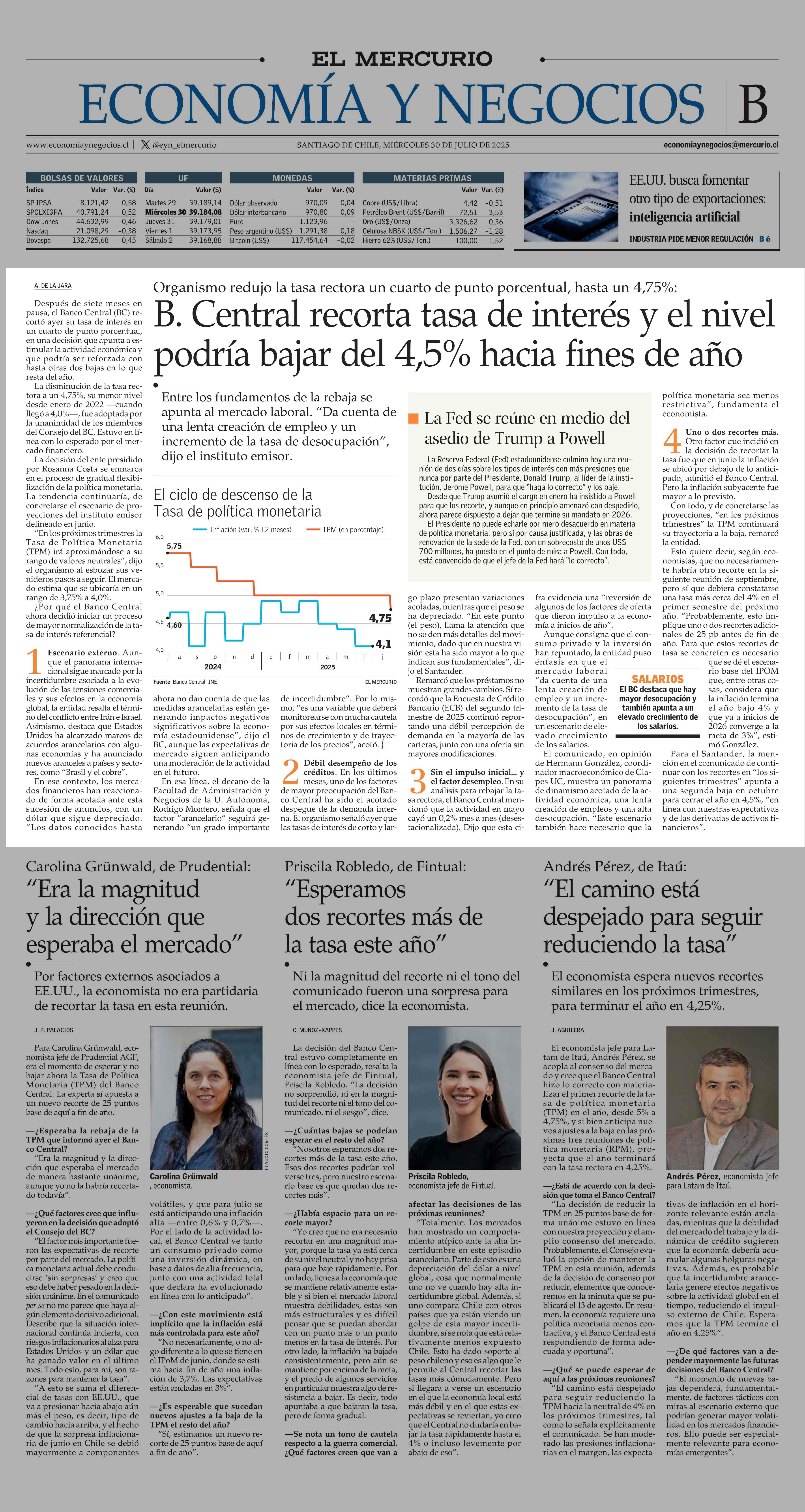 B. Central recorta tasa de interés y el nivel podría bajar del 4,5% hacia fines de año 30-07-2025 El Mercurio |