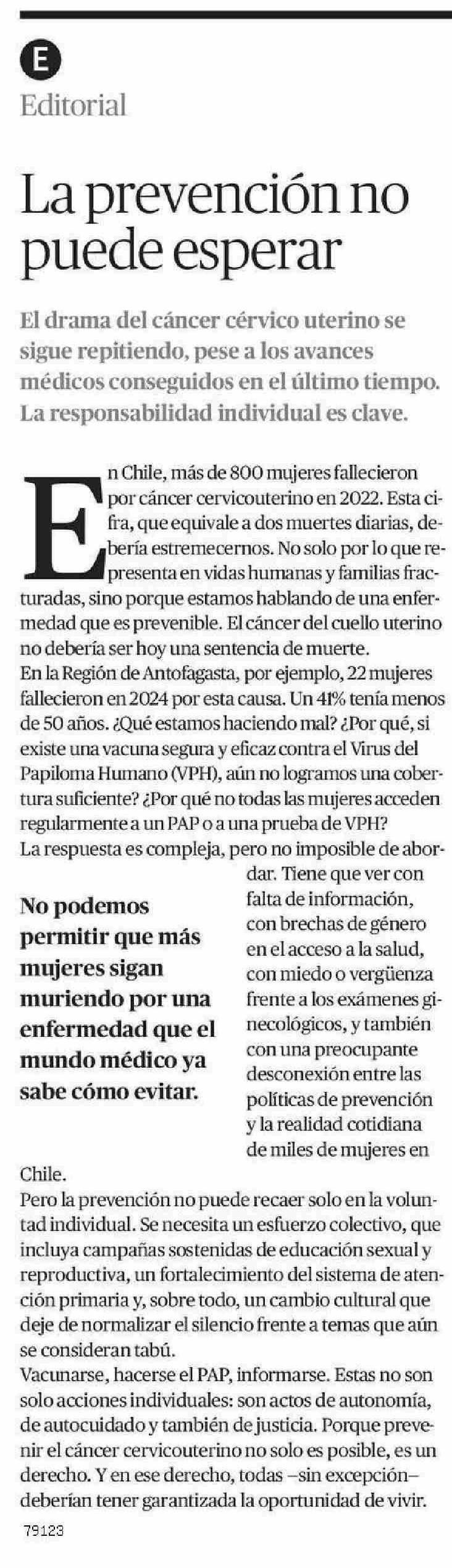 Editorial: La prevención no puede esperar 18-04-2025 El Mercurio de Calama |