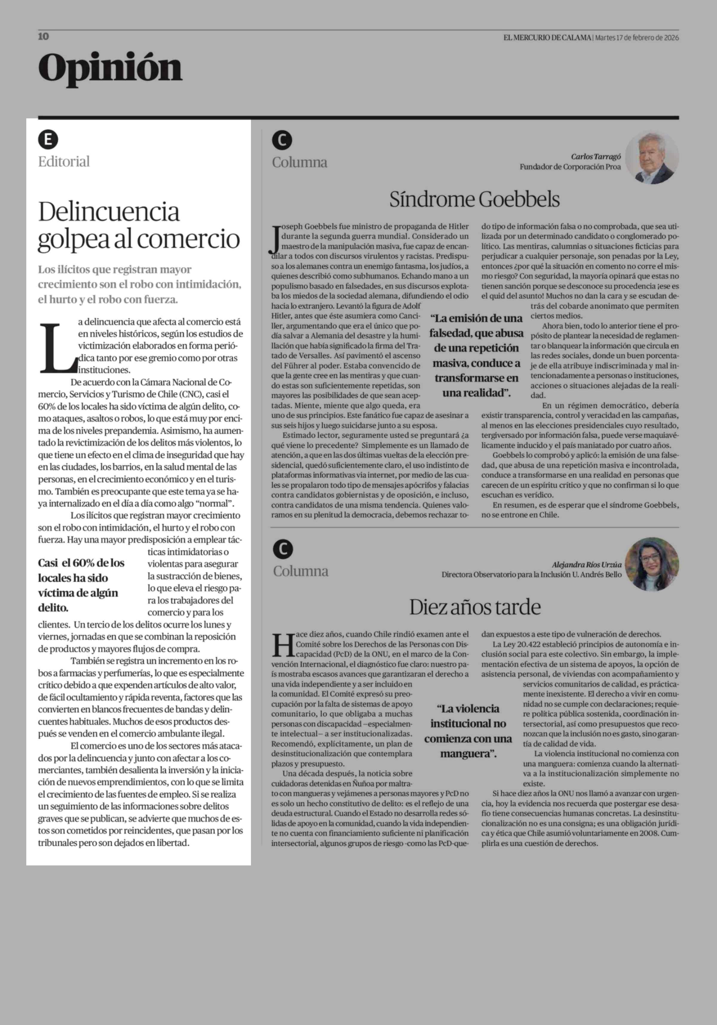 Editorial: Delincuencia golpea al comercio 17-02-2026 El Mercurio de Calama |