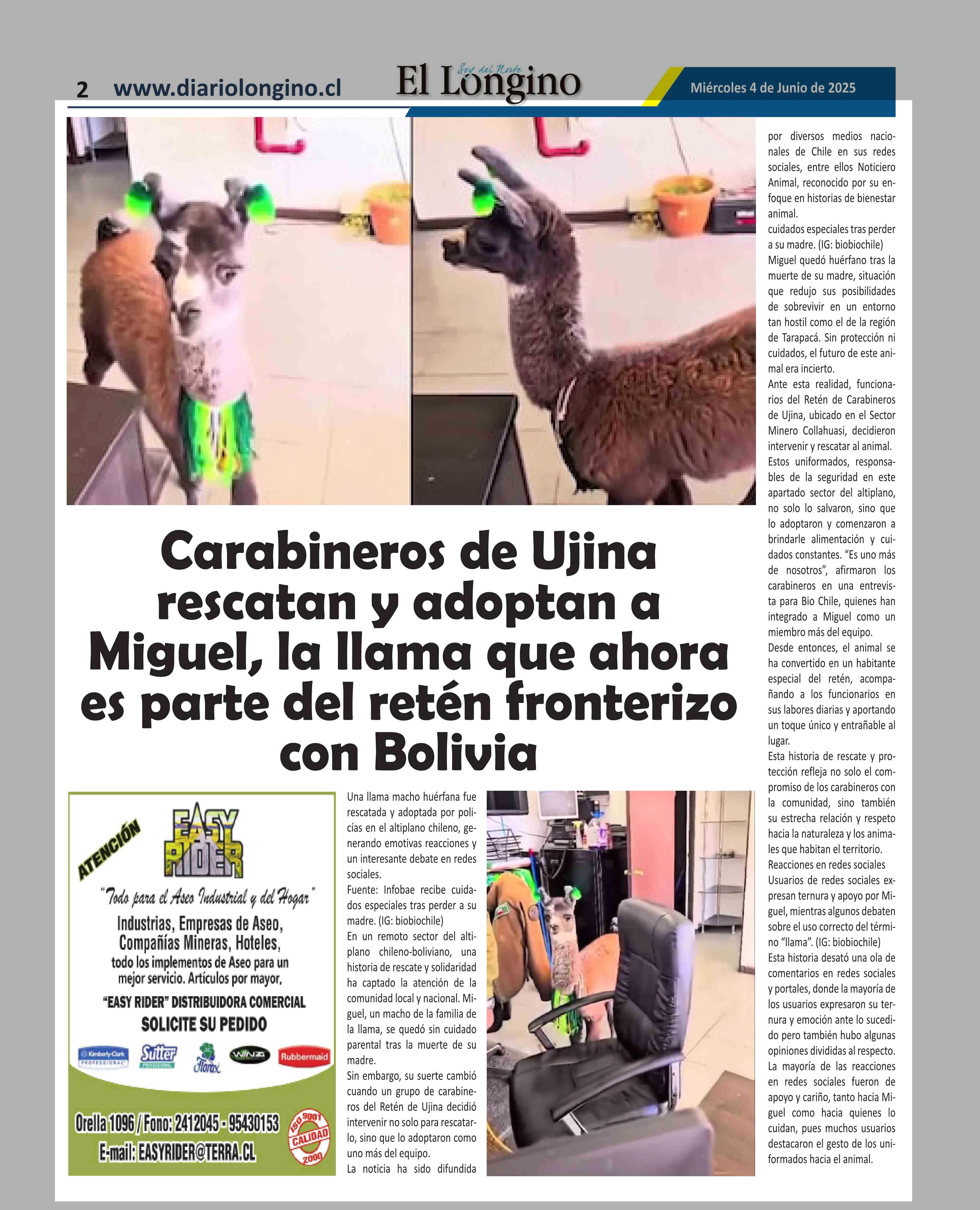 Carabineros de Ujina rescatan y adoptan a Miguel, la llama que ahora es parte del retén fronterizo con Bolivia 04-06-2025 El Longino |