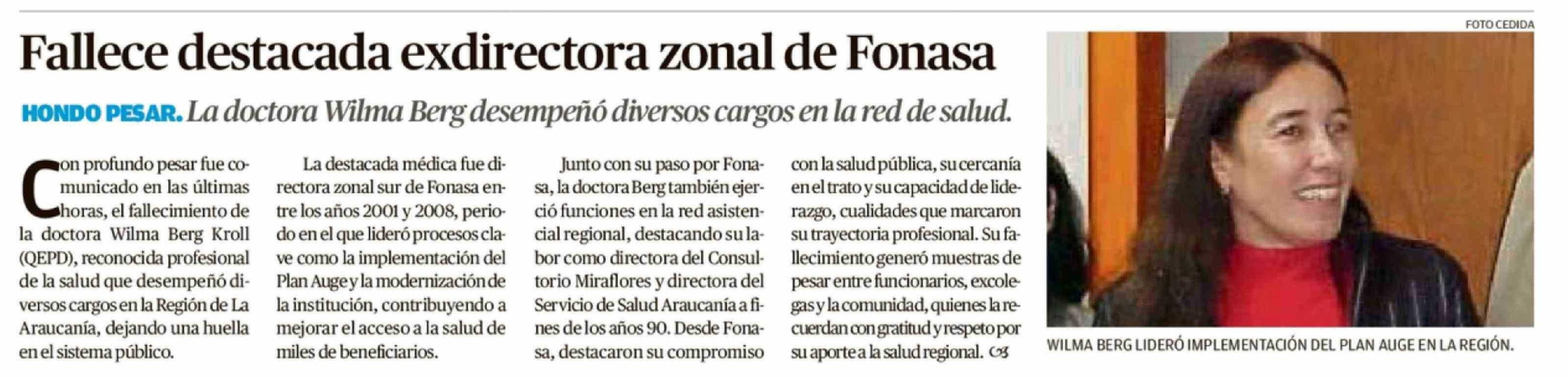 Fallece destacada exdirectora zonal de Fonasa 28-03-2026 El Austral de la Araucanía |