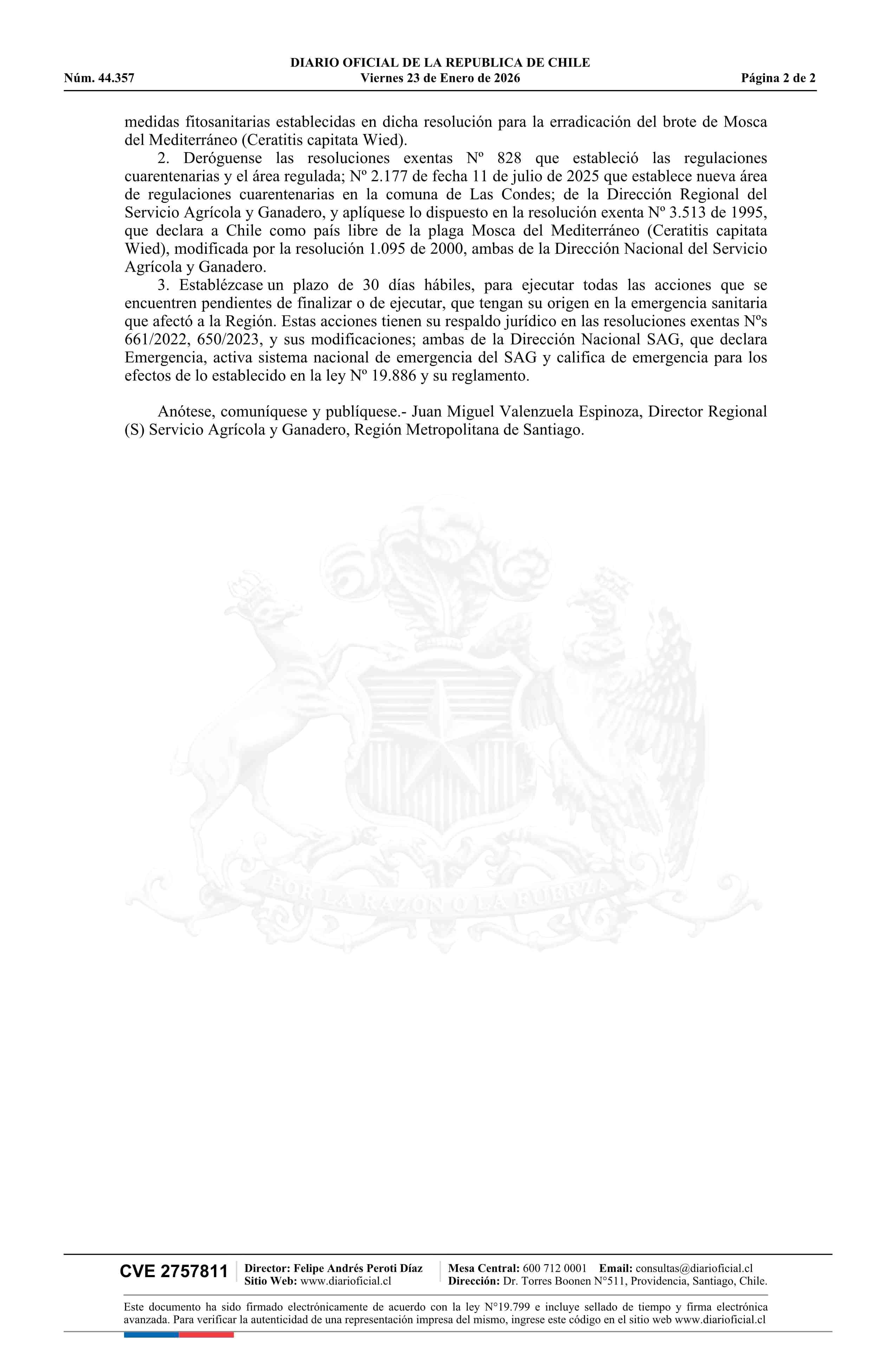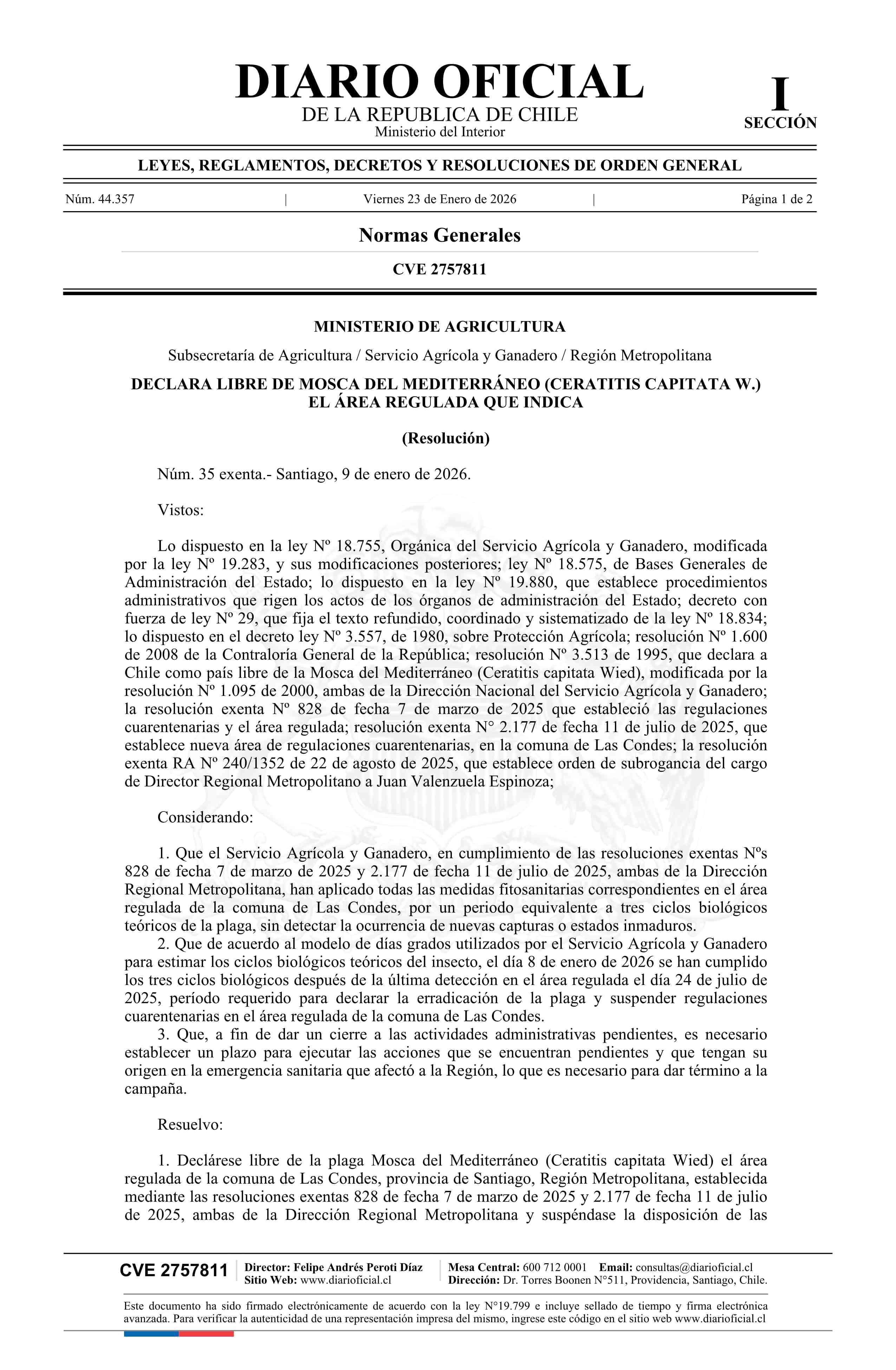 | Título: | Resolución exenta número 35, de 2026.- Declara libre de Mosca del Mediterráneo (Ceratitis capitata W.) el área regulada que indica |