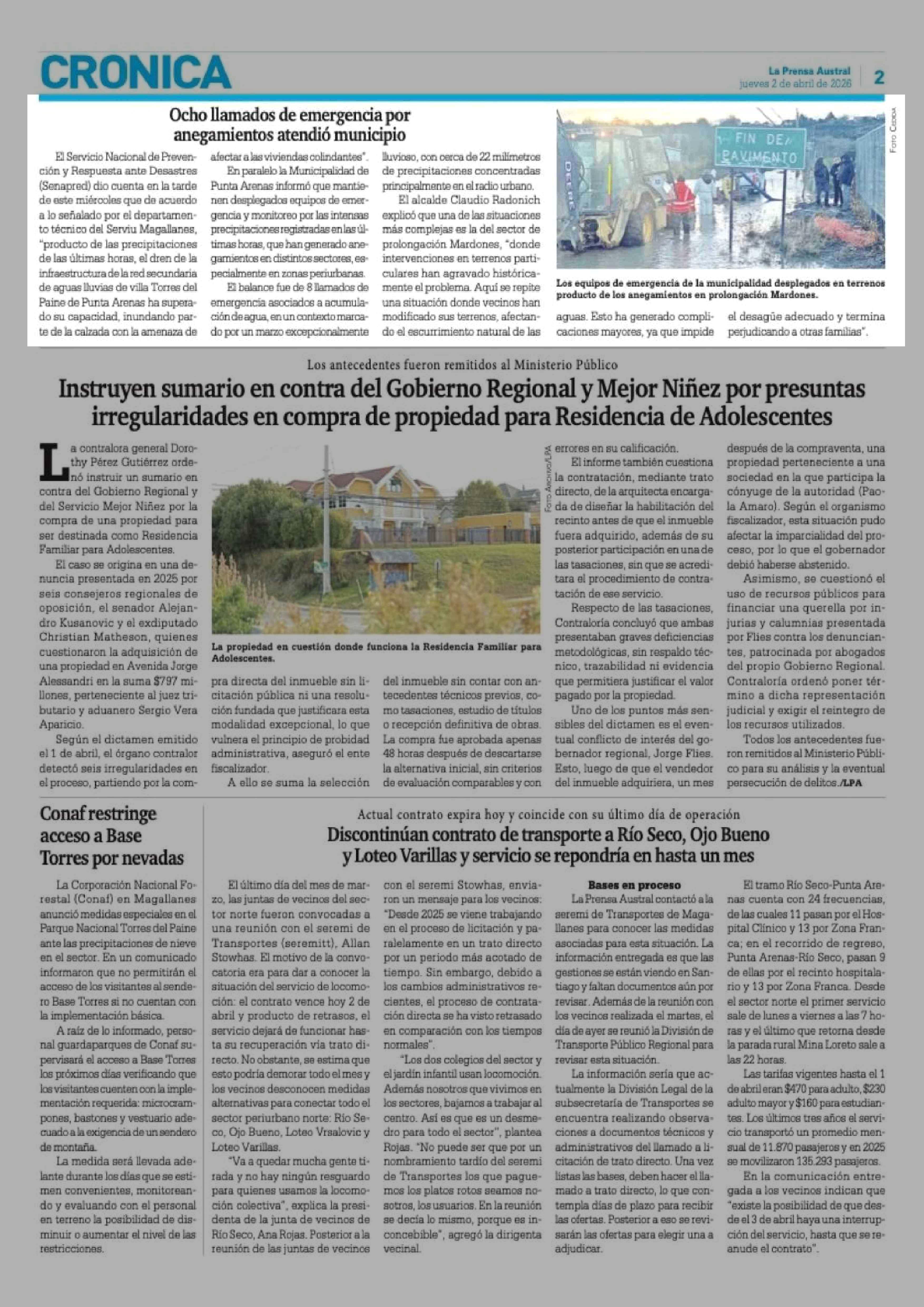 Ocho llamados de emergencia por anegamientos atendió municipio 02-04-2026 La Prensa Austral |