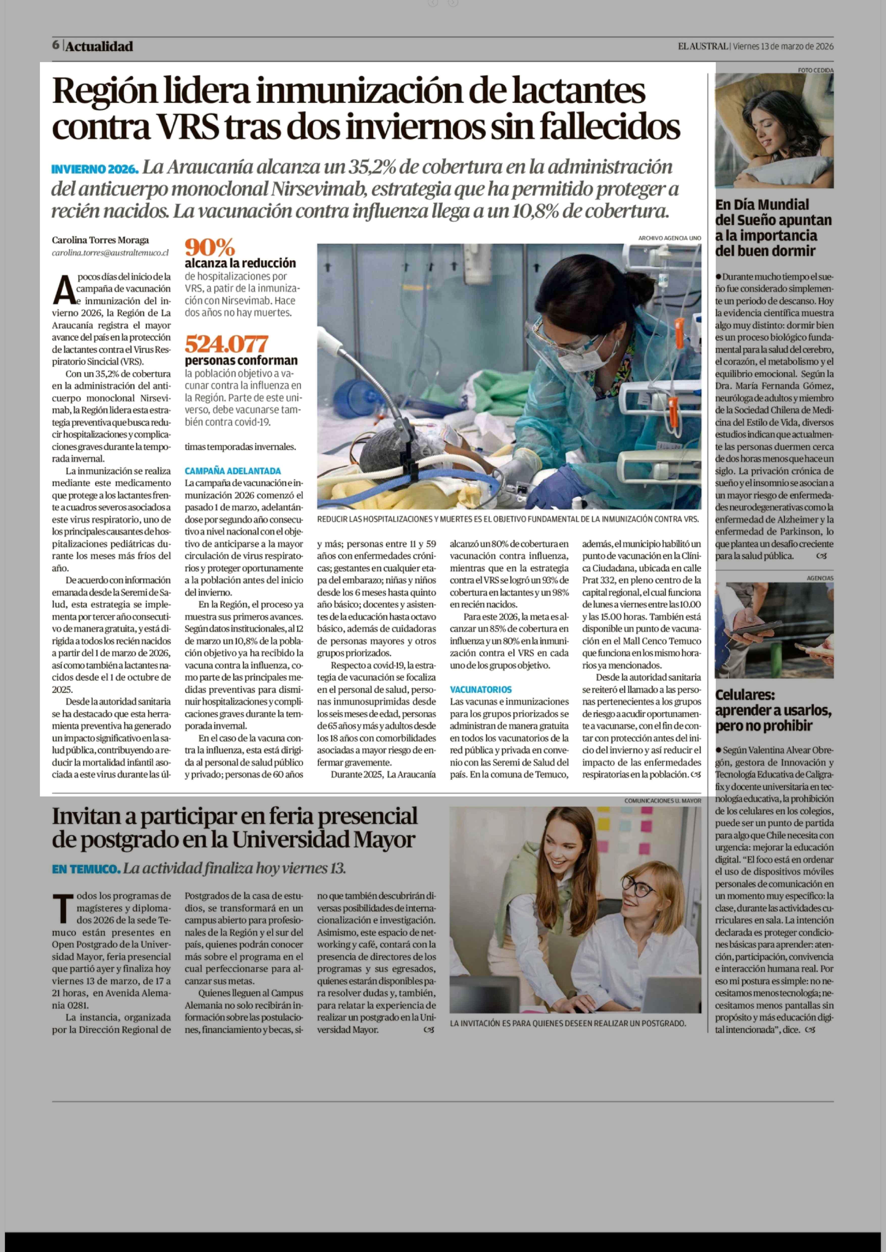 Región lidera inmunización de lactantes contra VRS tras dos inviernos sin fallecidos 13-03-2026 El Austral de la Araucanía |