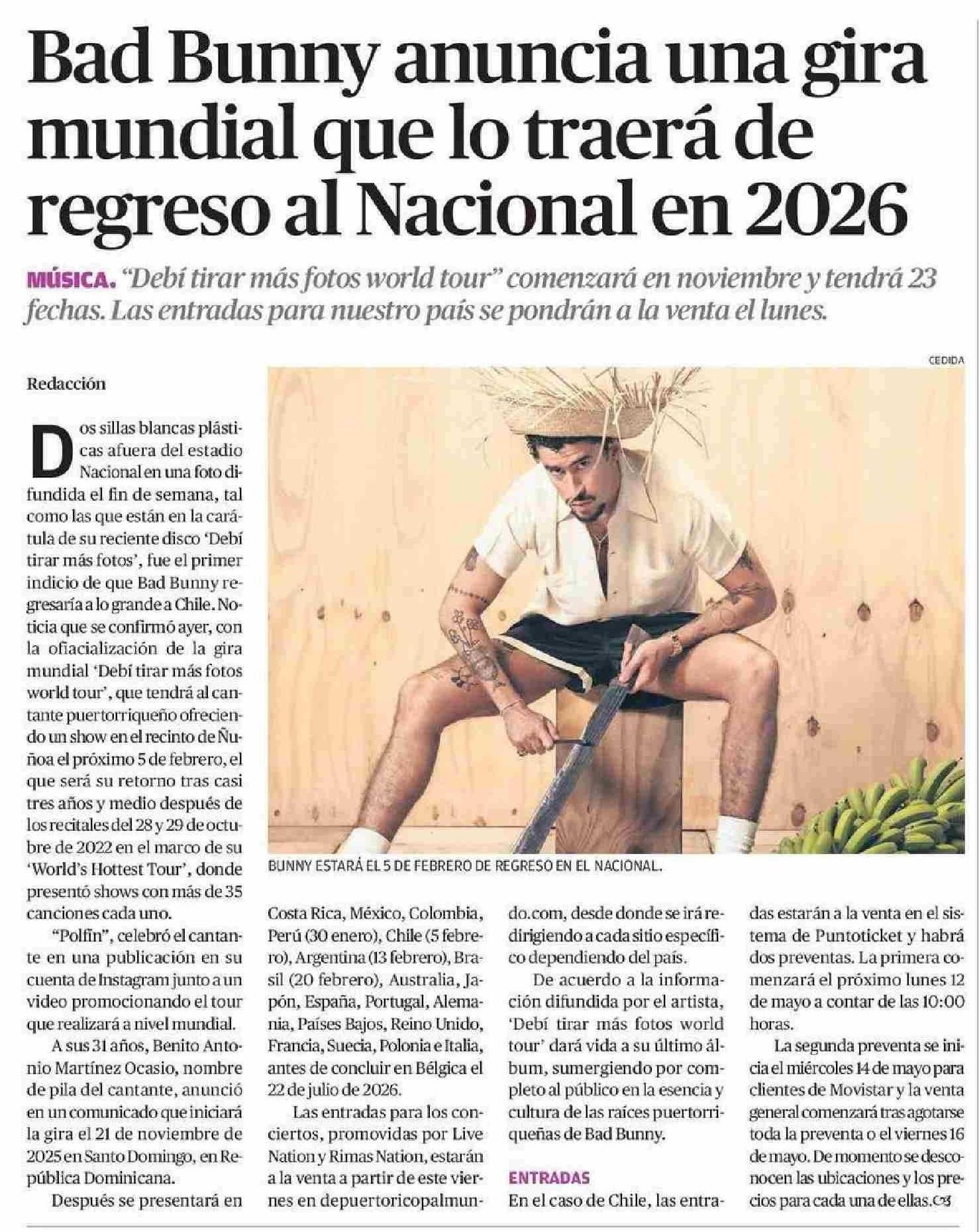 Título: Bad Bunny anuncia una gira mundial que lo traerá de regreso al Nacional en 2026