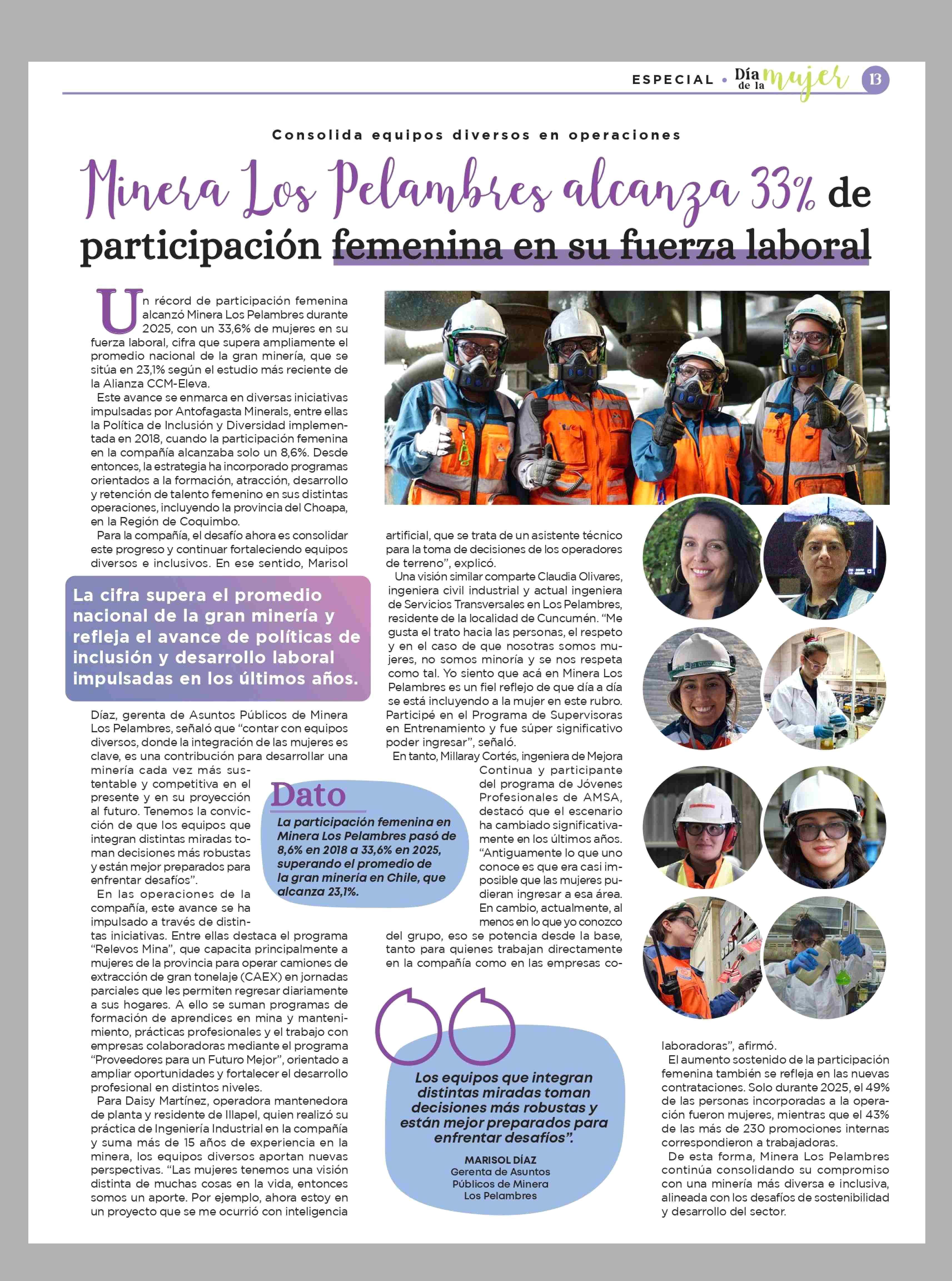 Título: Minera Los Plambres alcanza 33%, de participación femenina en suf uerza laboral