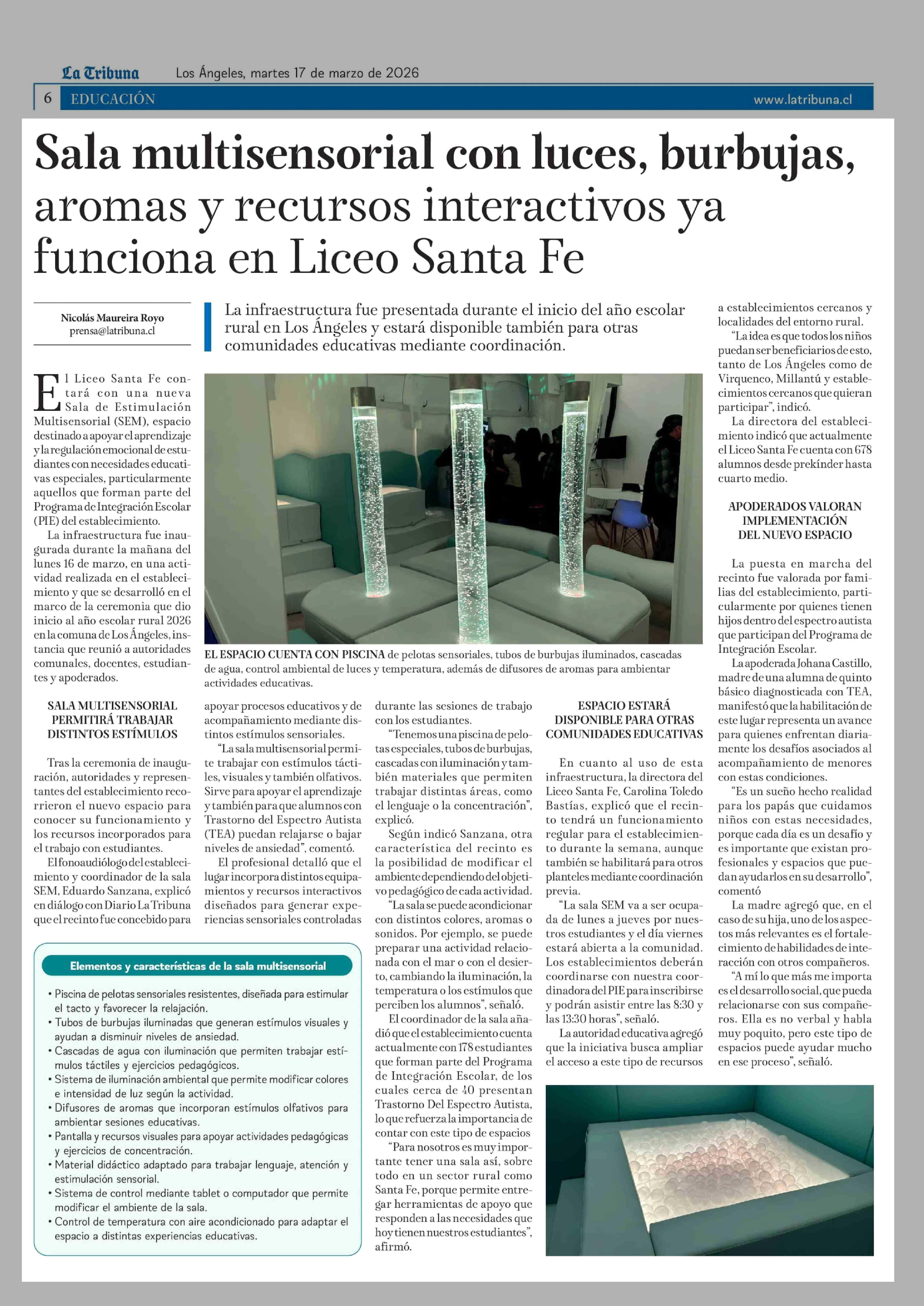 Título: Sala multisensorial con luces, burbujas, aromas y recursos interactivos ya funciona en Liceo Santa Fe