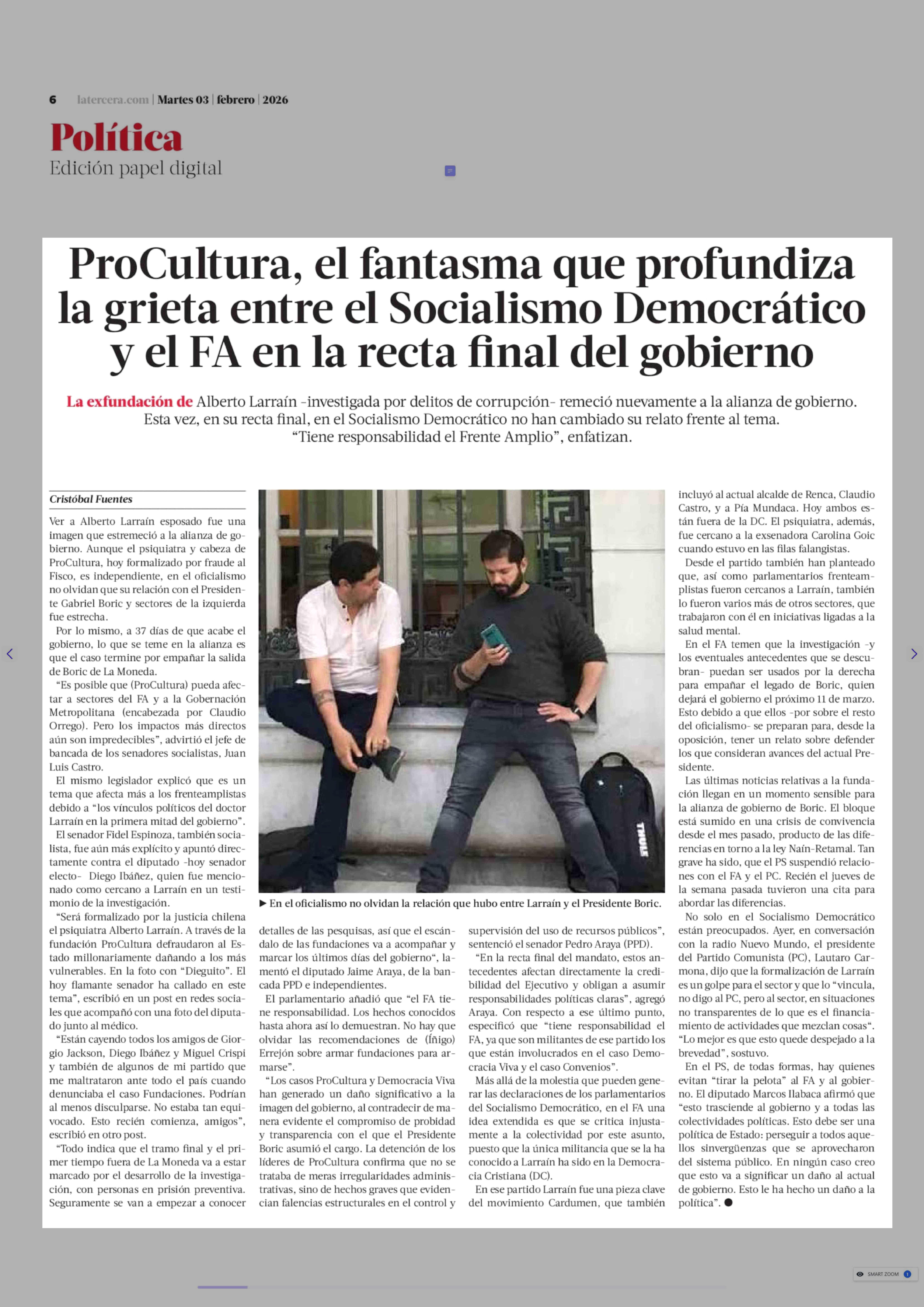 ProCultura, el fantasma que profundiza la grieta entre el Socialismo Democrático y el FA en la recta final del gobierno 03-02-2026 La Tercera |