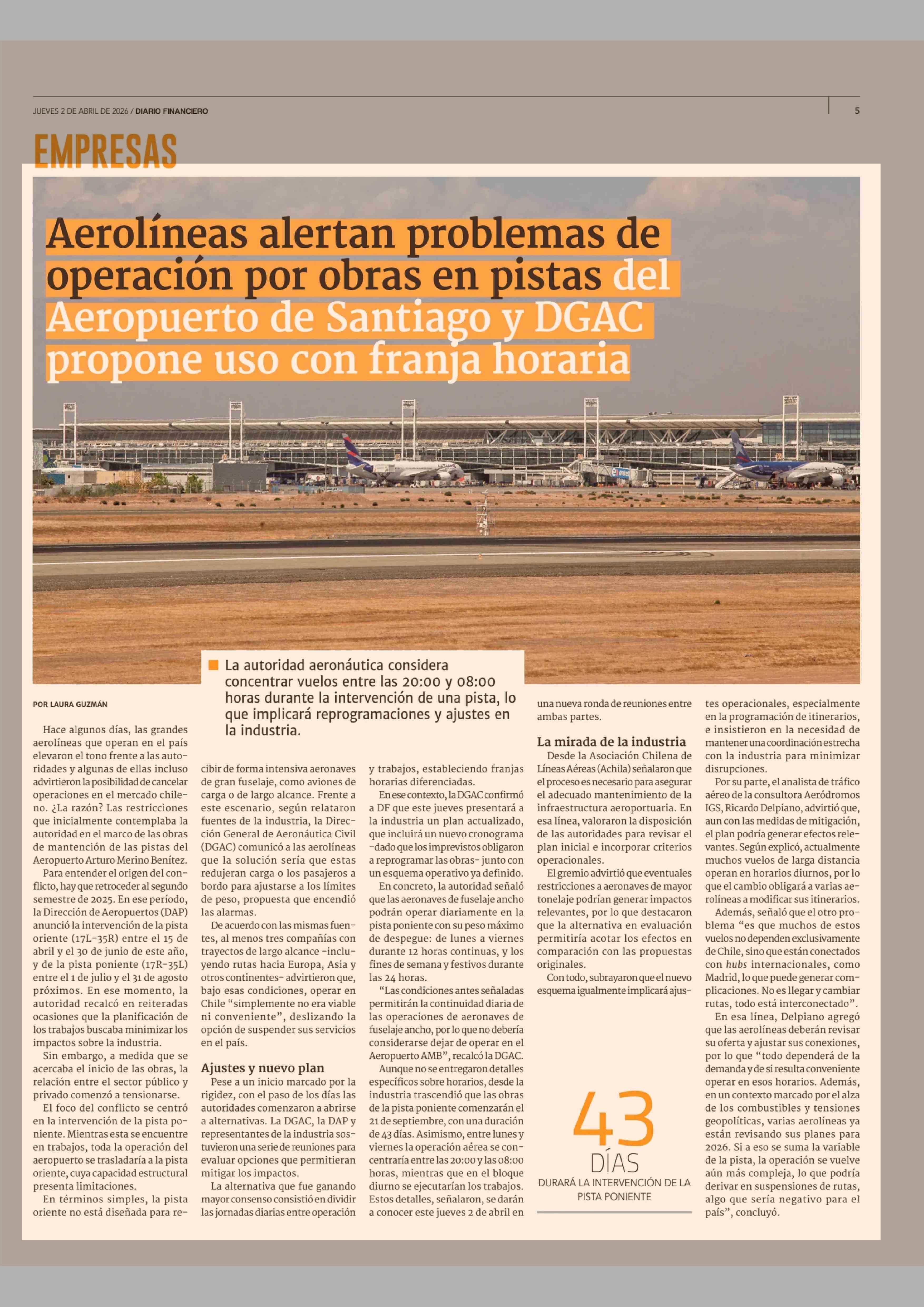 Título: Aerolíneas alertan problemas de operación por obras en pistas del Aeropuerto de Santiago y DGAC propone uso con franja horaria