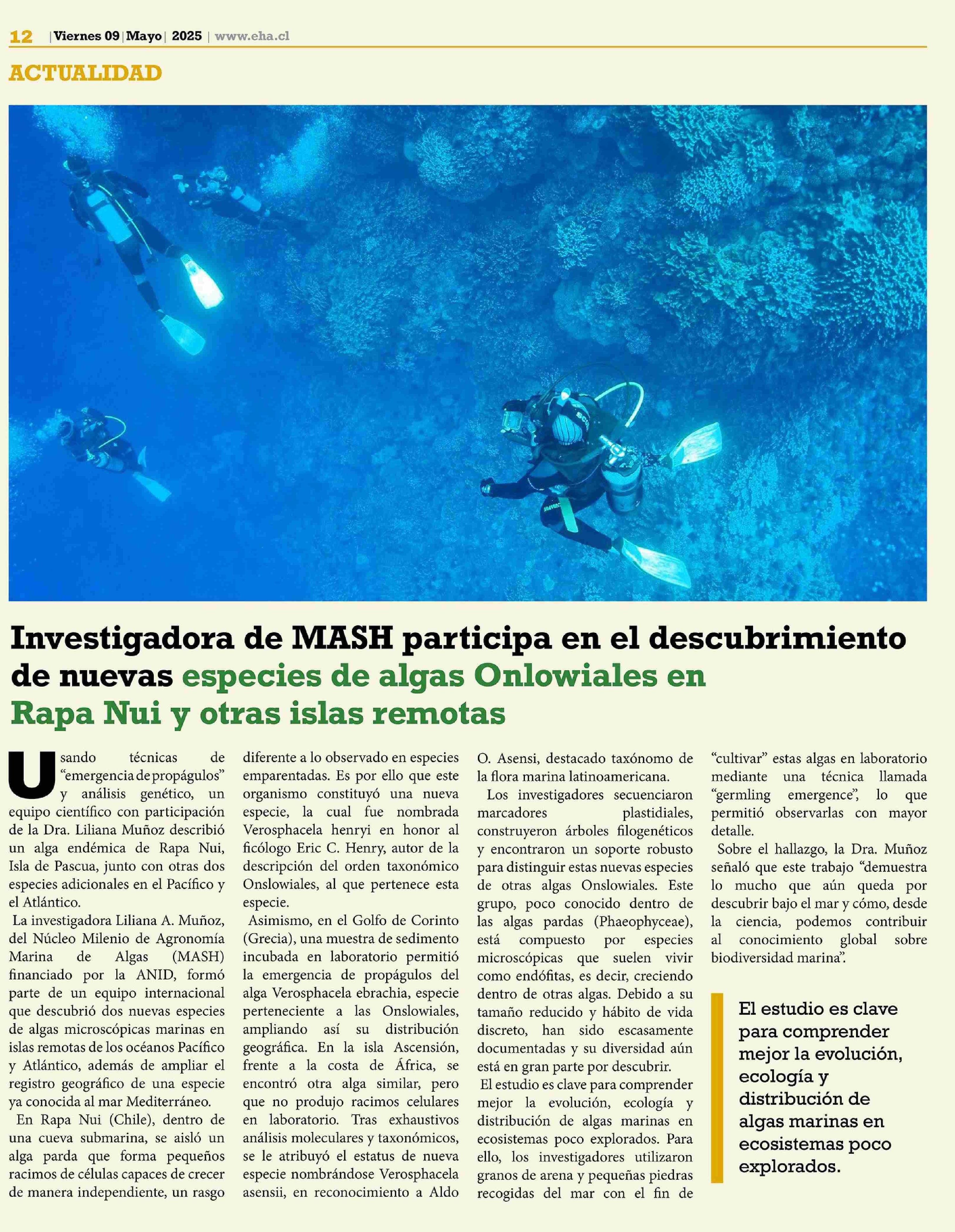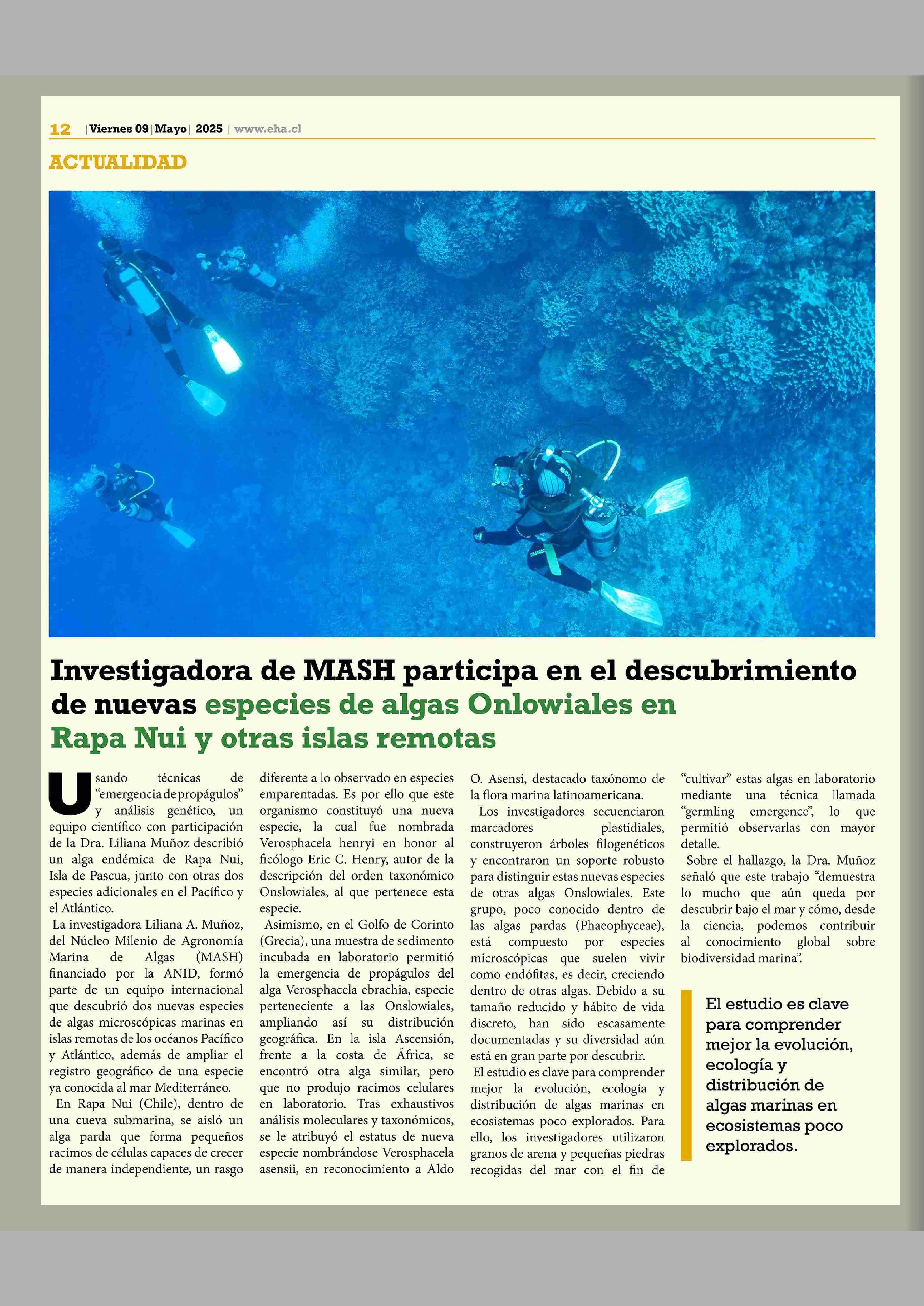 Investigadora de MASH participa en el descubrimiento de nuevas especies de algas Onlowiales en Rana Nui v otras islas remotas 09-05-2025 El Heraldo Austral |