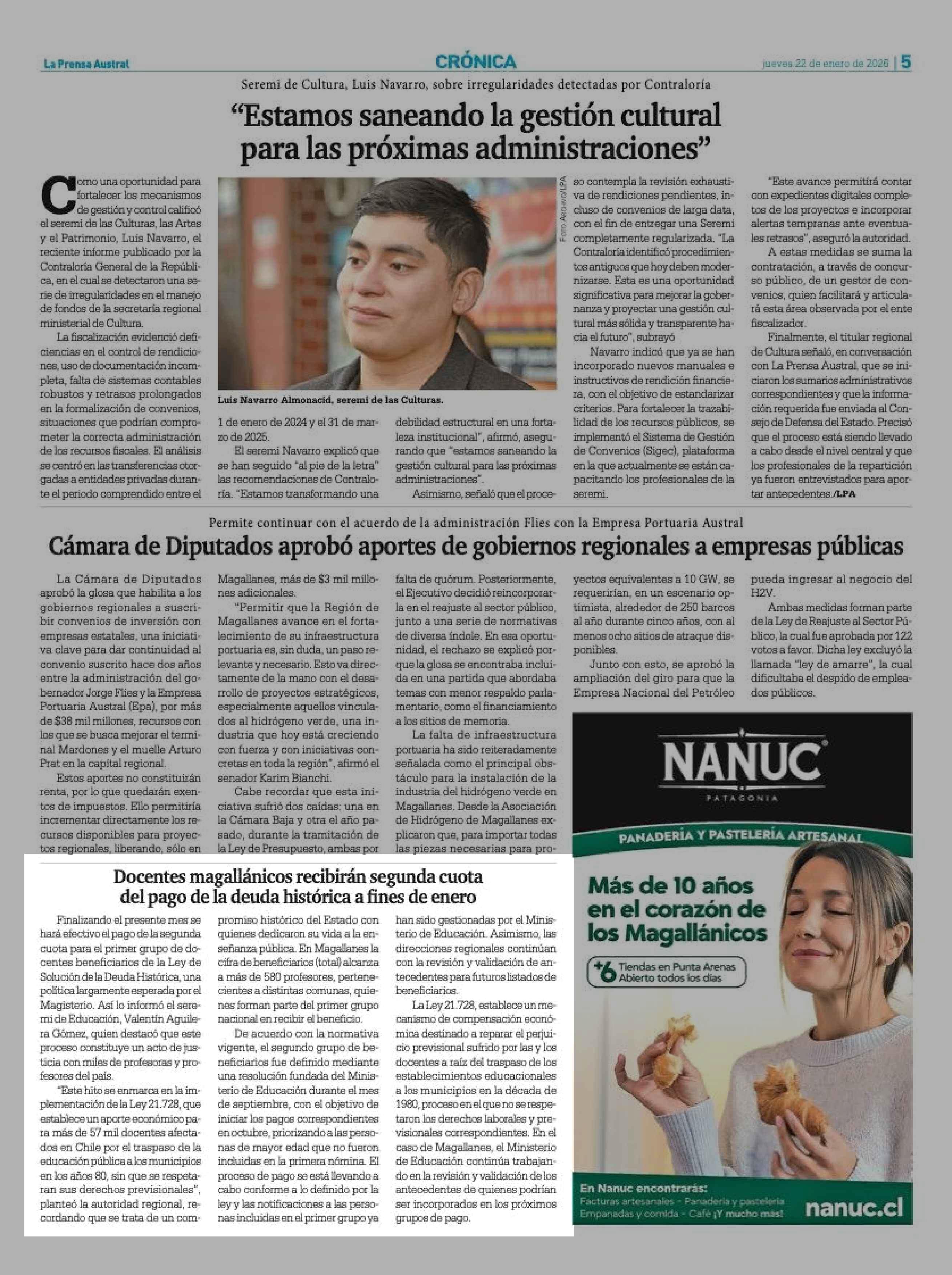 Docentes magallánicos recibirán segunda cuota del pago de la deuda histórica a fines de enero 22-01-2026 La Prensa Austral |