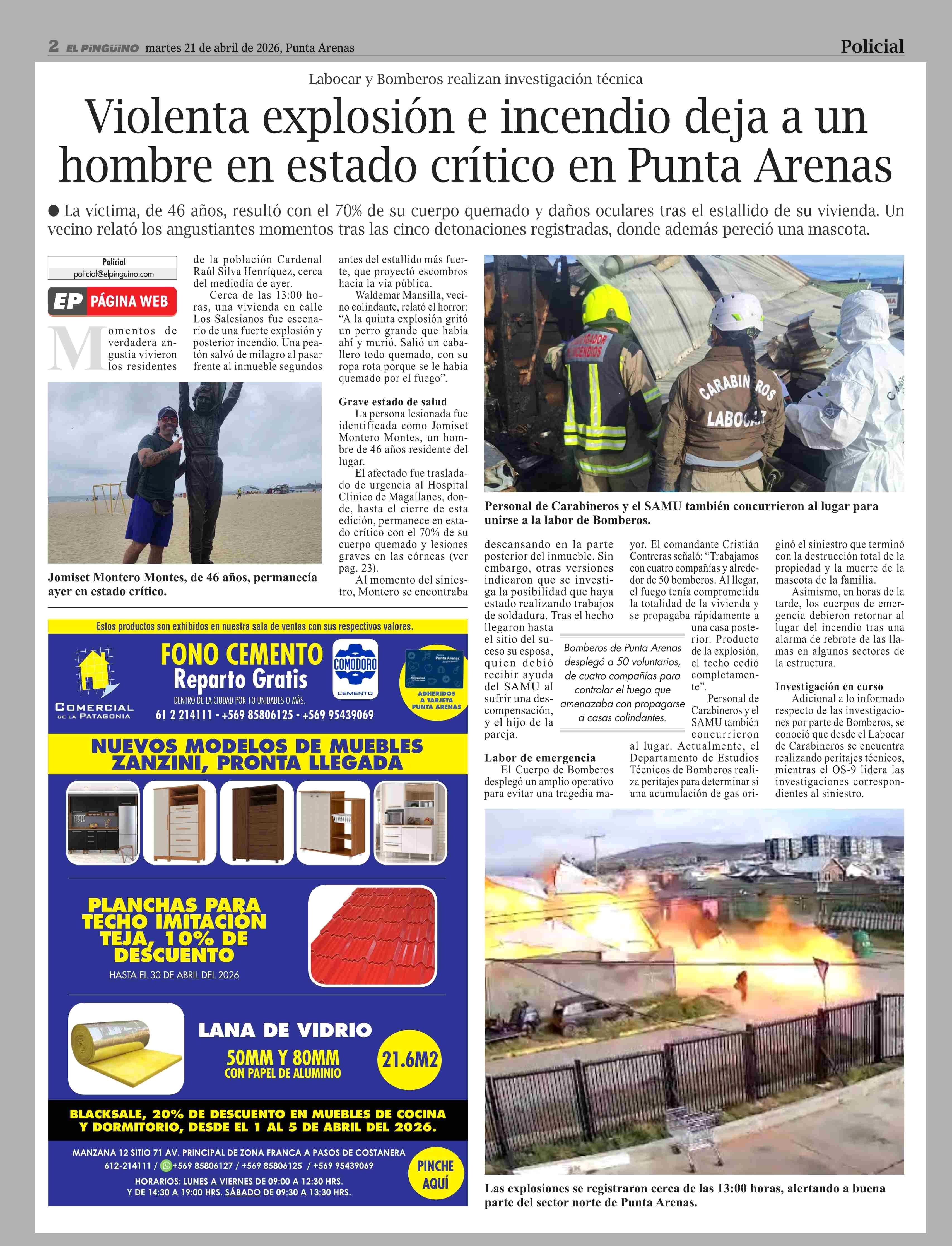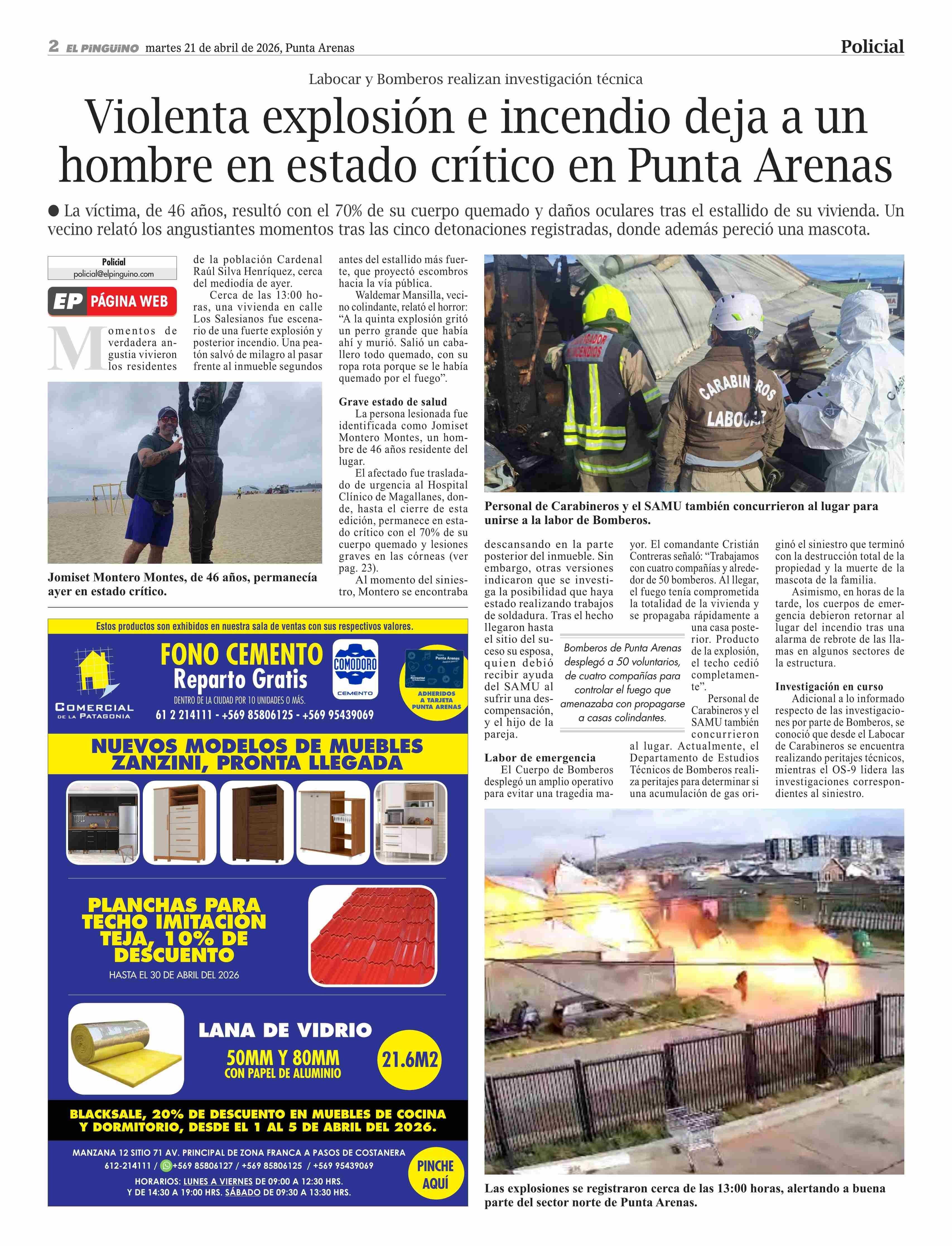 Violenta explosión e incendio deja a un hombre en estado crítico en Punta Arenas 21-04-2026 El Pingüino |