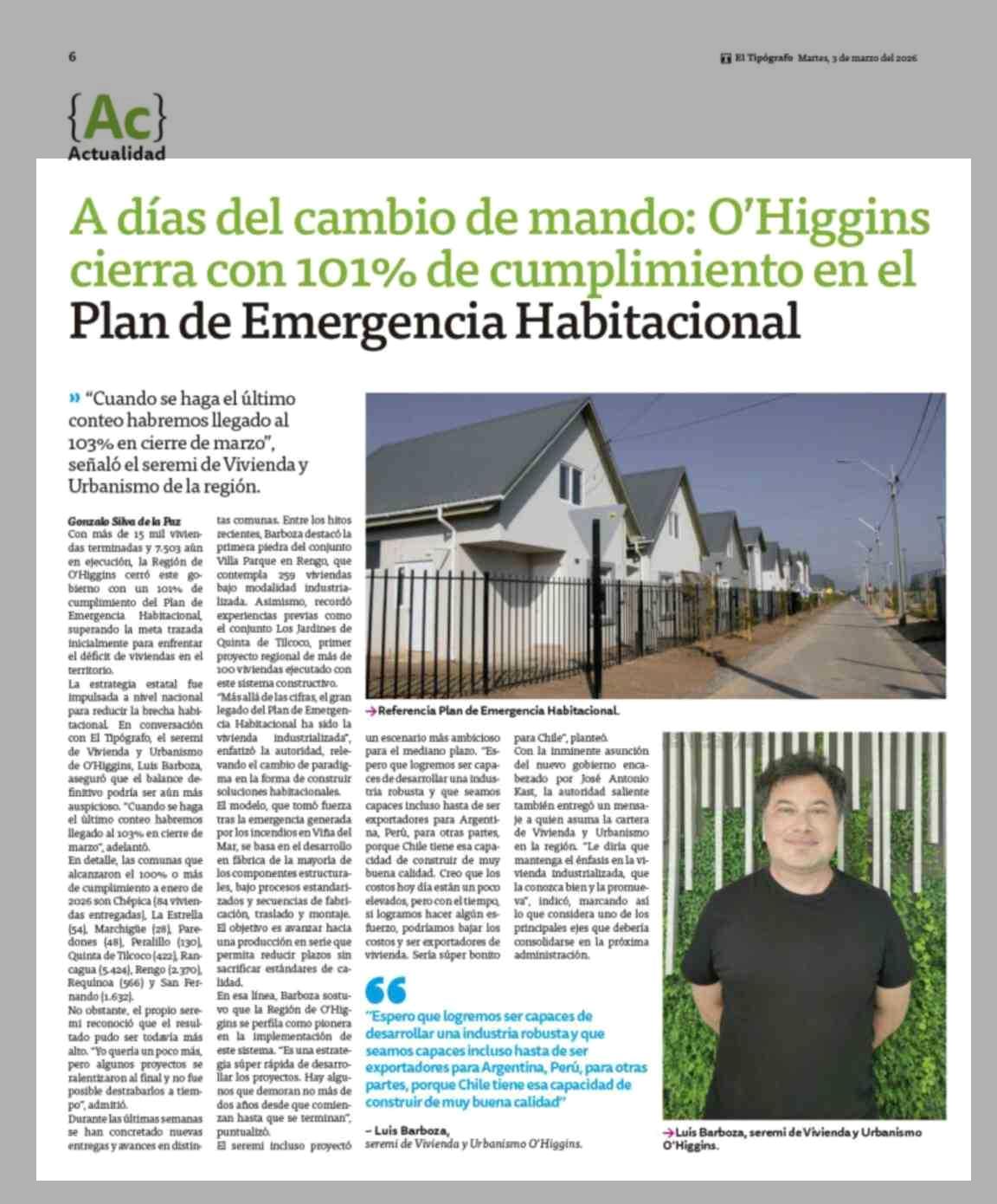 Título: A días del cambio de mando: O'Higgins cierra con 101% de cumplimiento en el Plan de Emergencia Habitacional