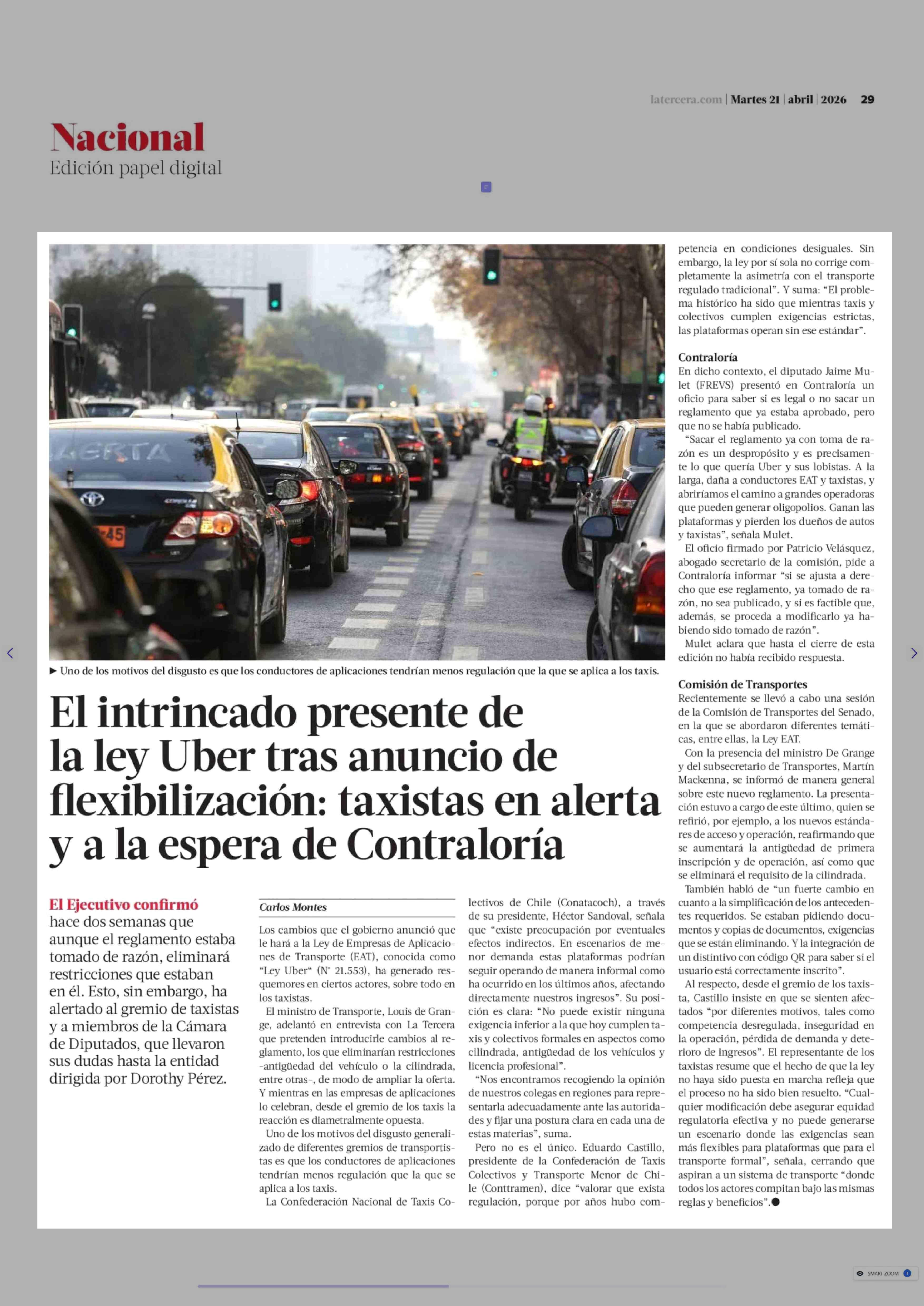 El intrincado presente de la ley Uber tras anuncio de flexibilización: taxistas en alerta y a la espera de Contraloría 21-04-2026 La Tercera |