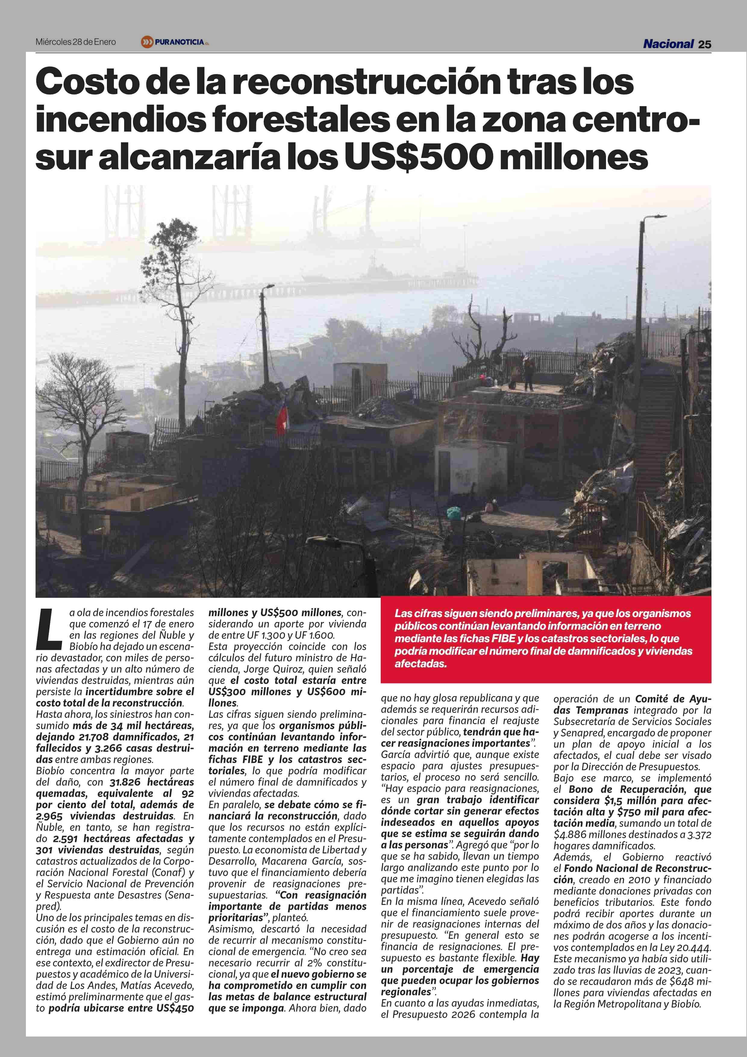 Título: Costo de la reconstrucción tras los incendios forestales en la zona centro- sur alcanzaría los US$500 millones