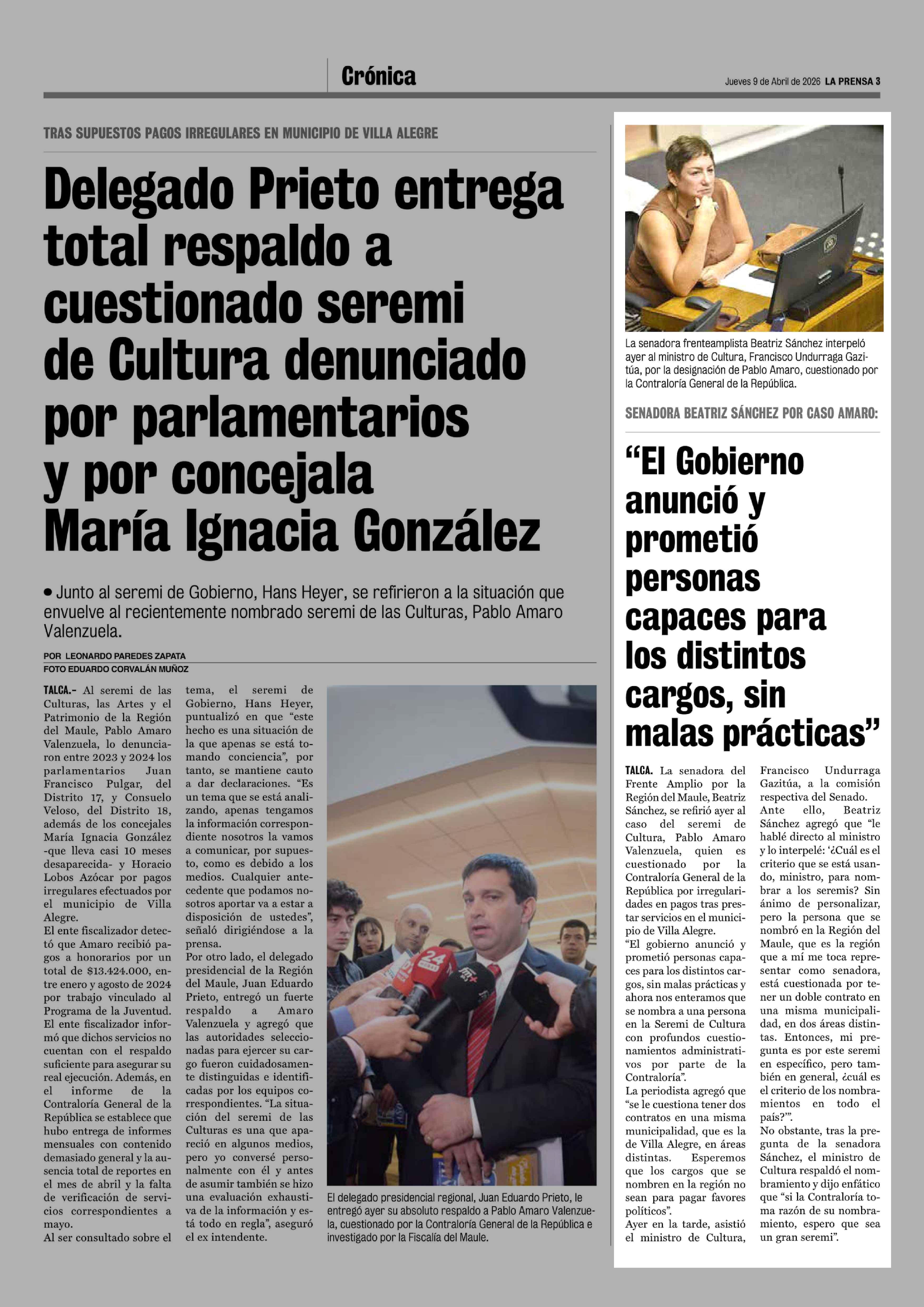 "El Gobierno anunció y prometió personas capaces para los distintos cargos, sin malas prácticas" 09-04-2026 La Prensa de Curicó |