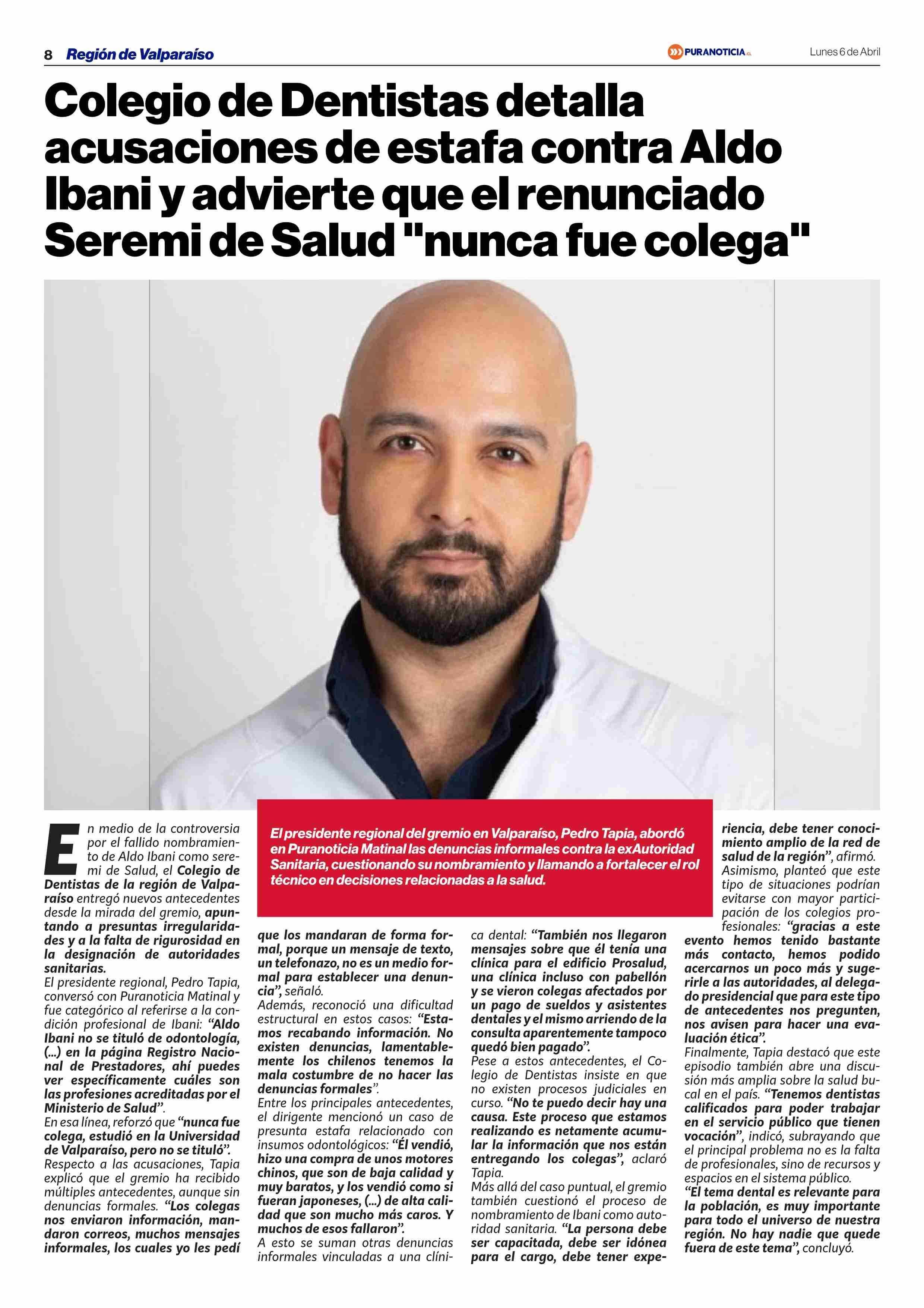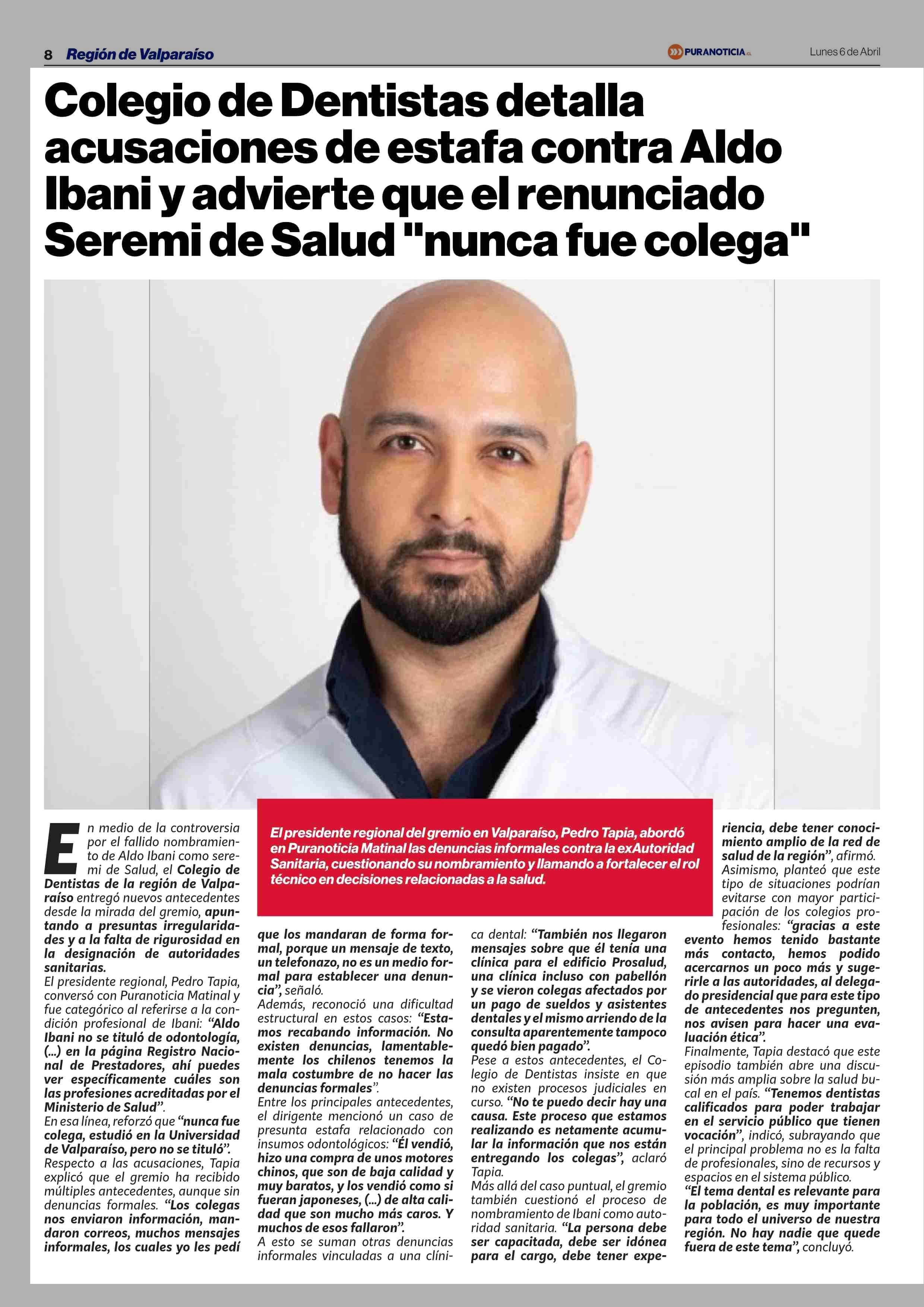 Colegio de Dentistas detalla acusaciones de estafa contra Aldo Ibani y advierte que el renunciado Seremi de Salud "nunca fue colega” 06-04-2026 Puranoticia.cl |