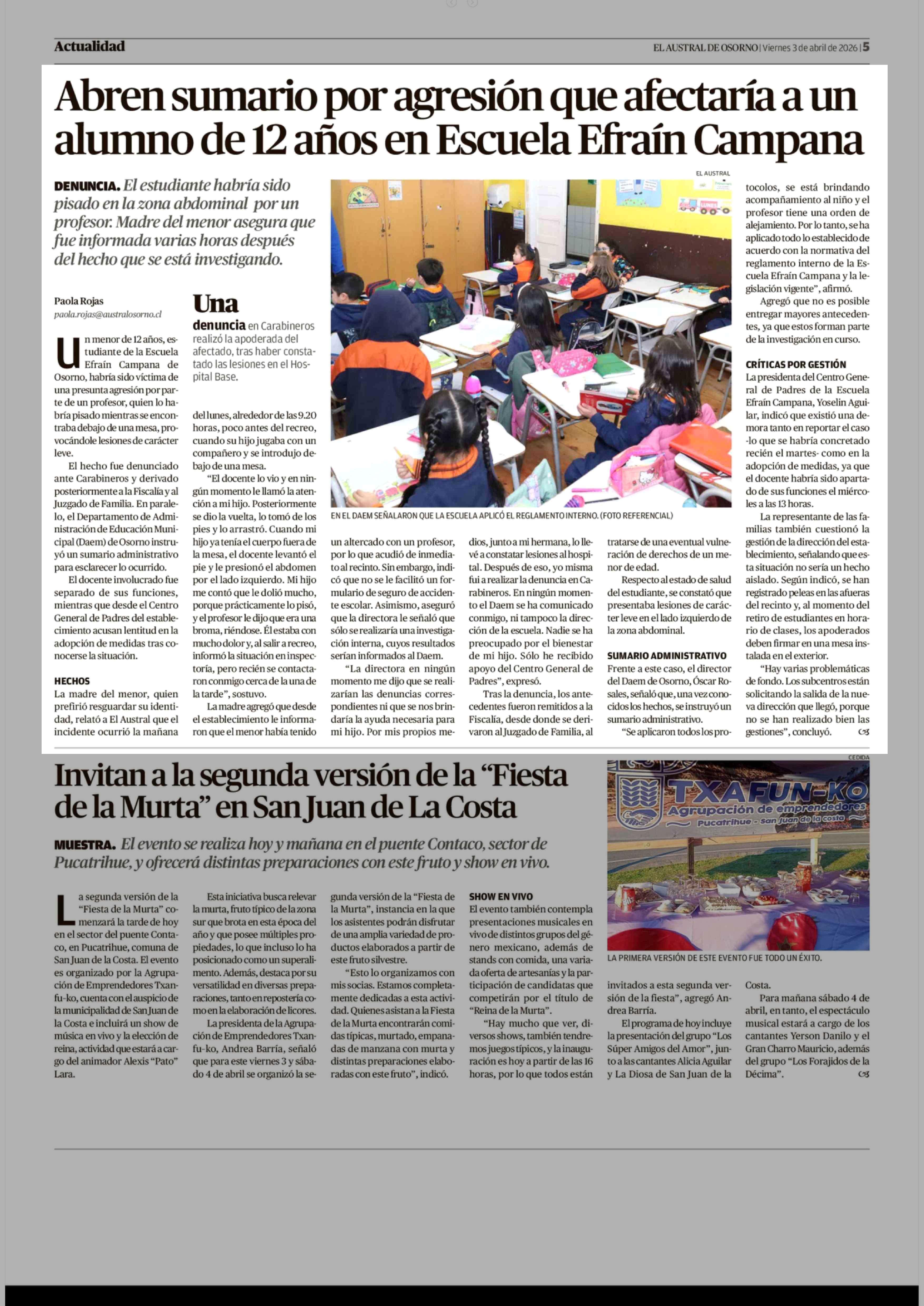 Abren sumario por agresión que afectaría a un alumno de 12 años en Escuela Efraín Campana 03-04-2026 El Austral de Osorno |