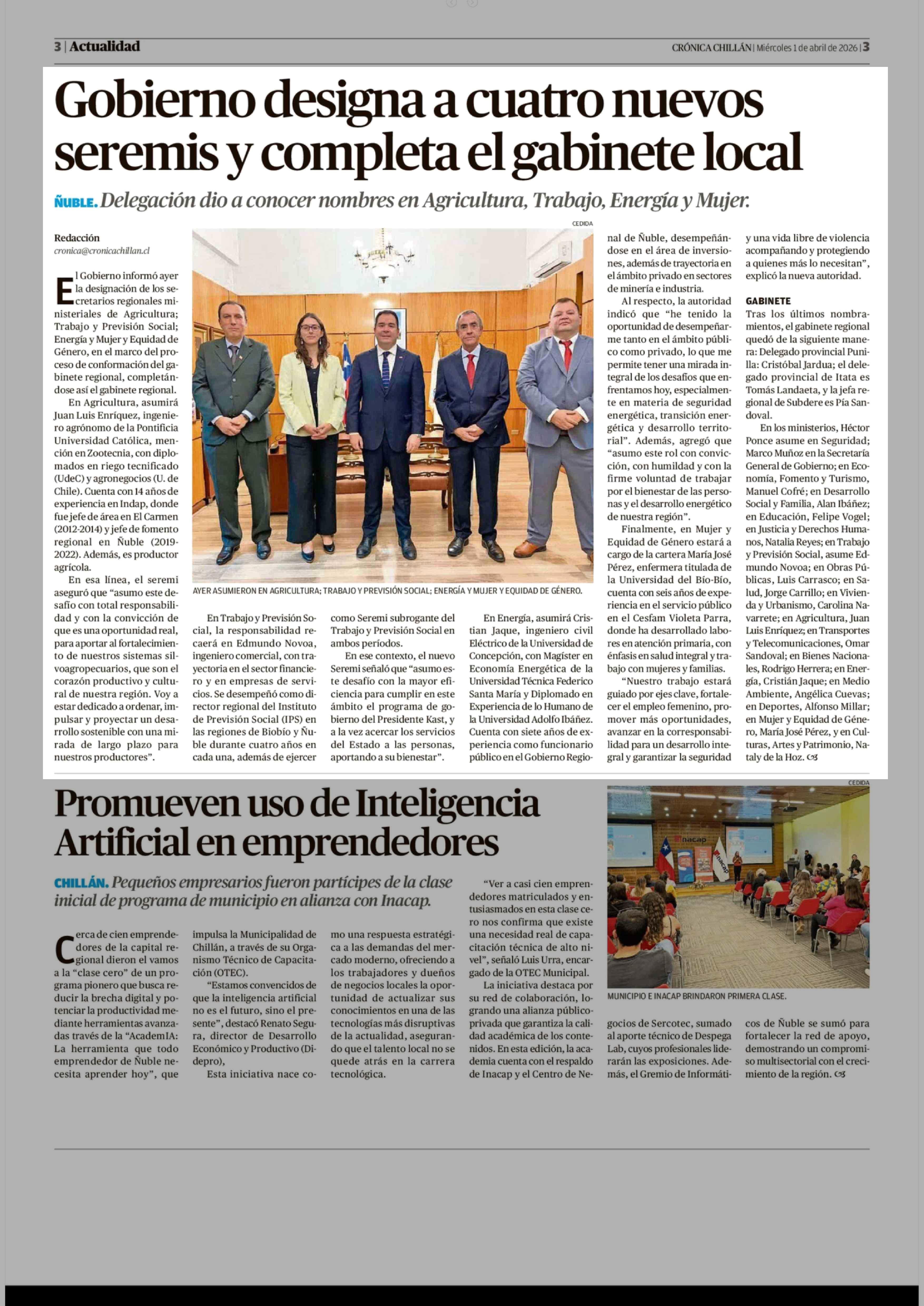 Gobierno designa a cuatro nuevos seremis y completa el gabinete local 01-04-2026 Crónica de Chillán |