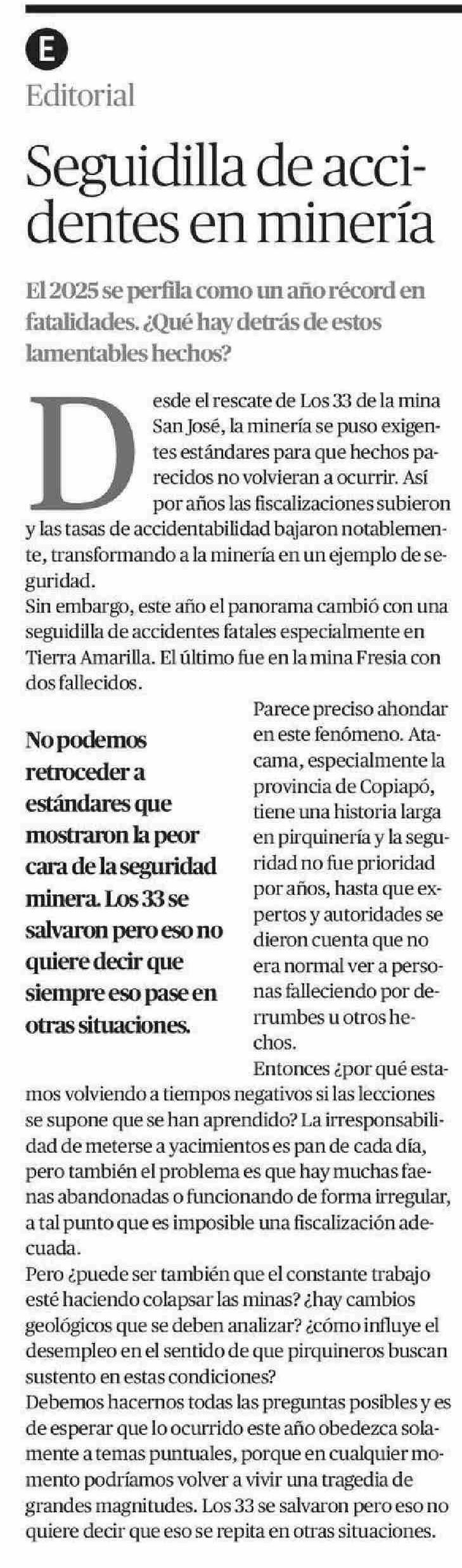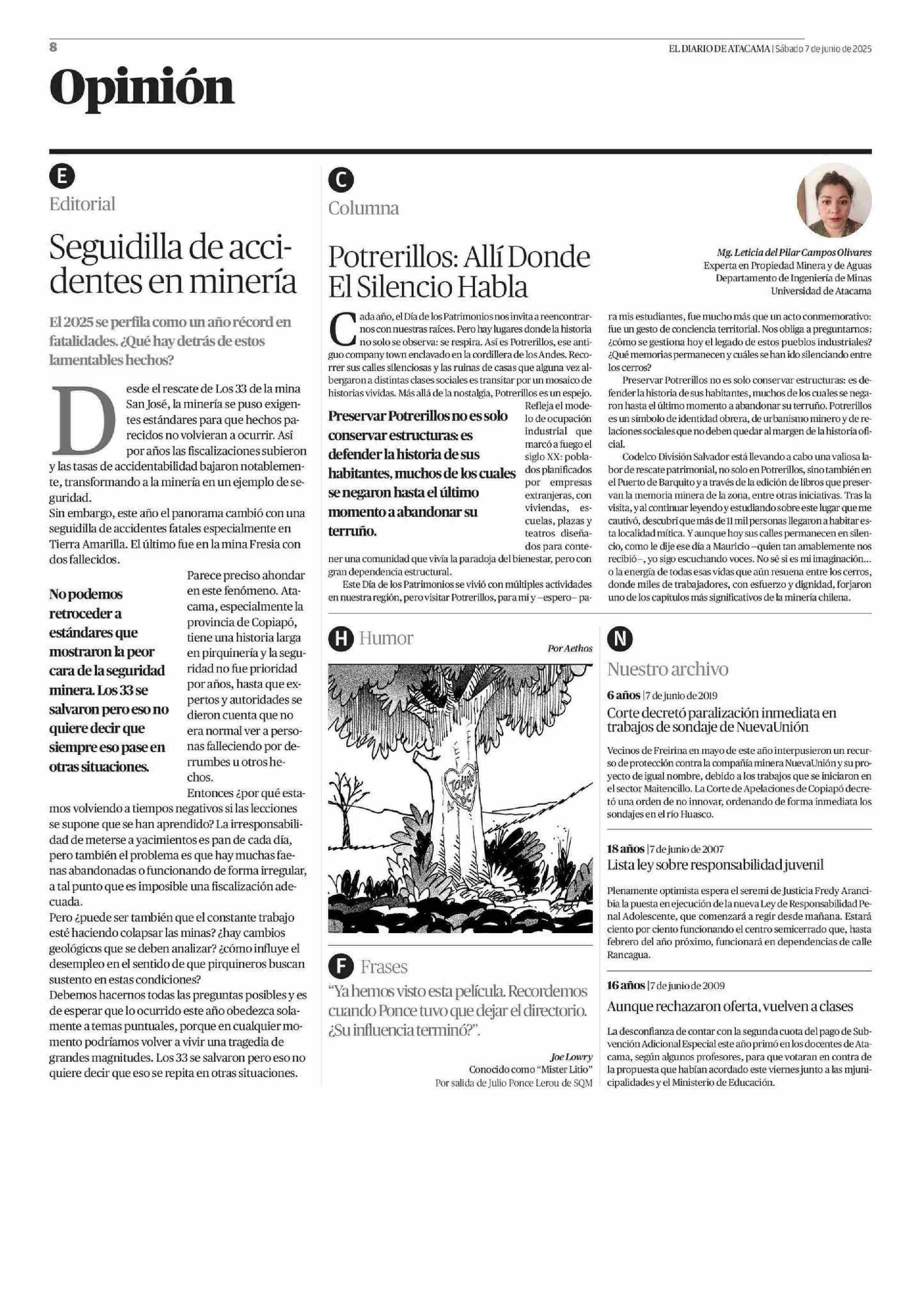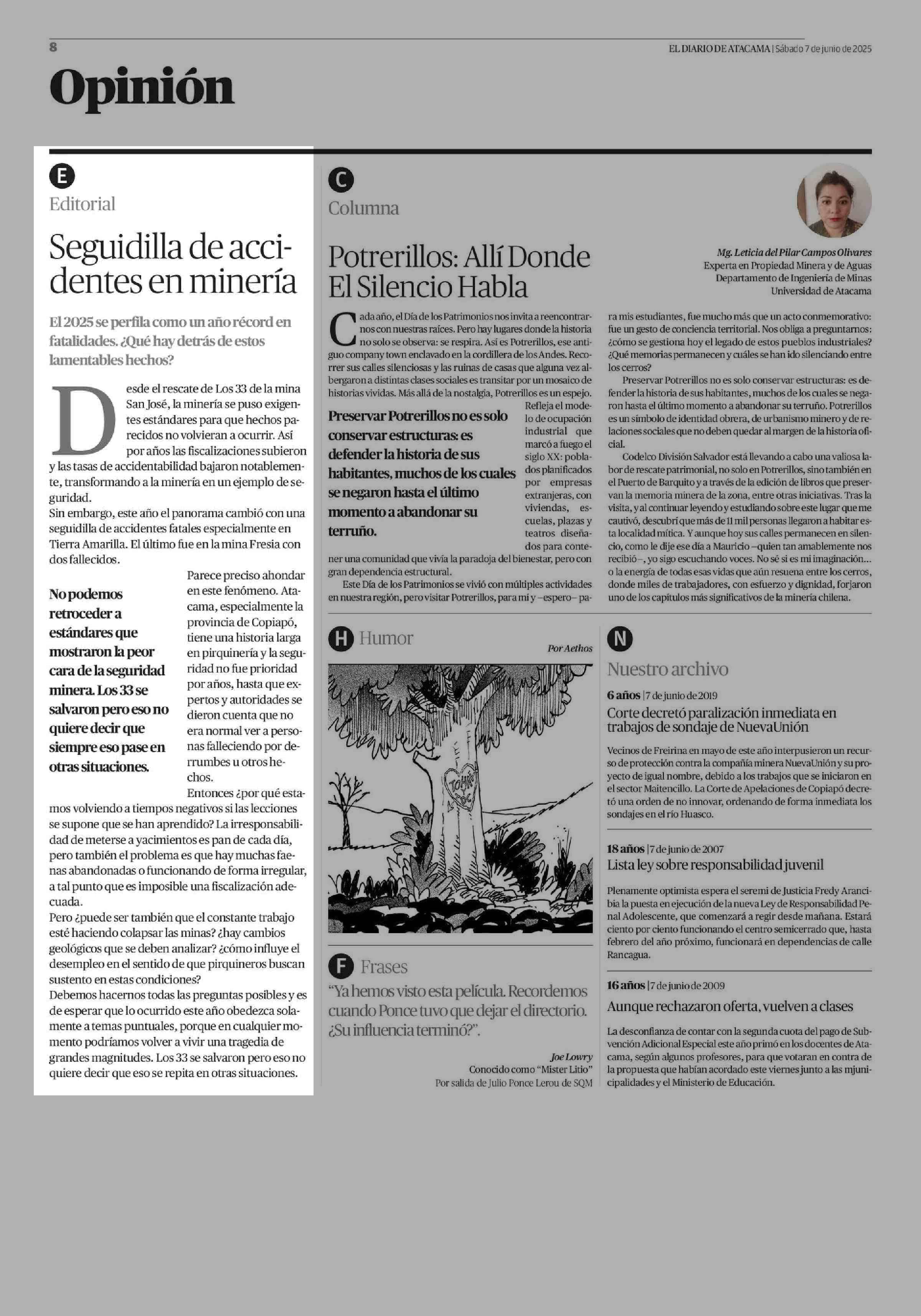 COLUMNAS DE OPINIÓN: Seguidilla de accidentes en minería 07-06-2025 El Diario de Atacama |