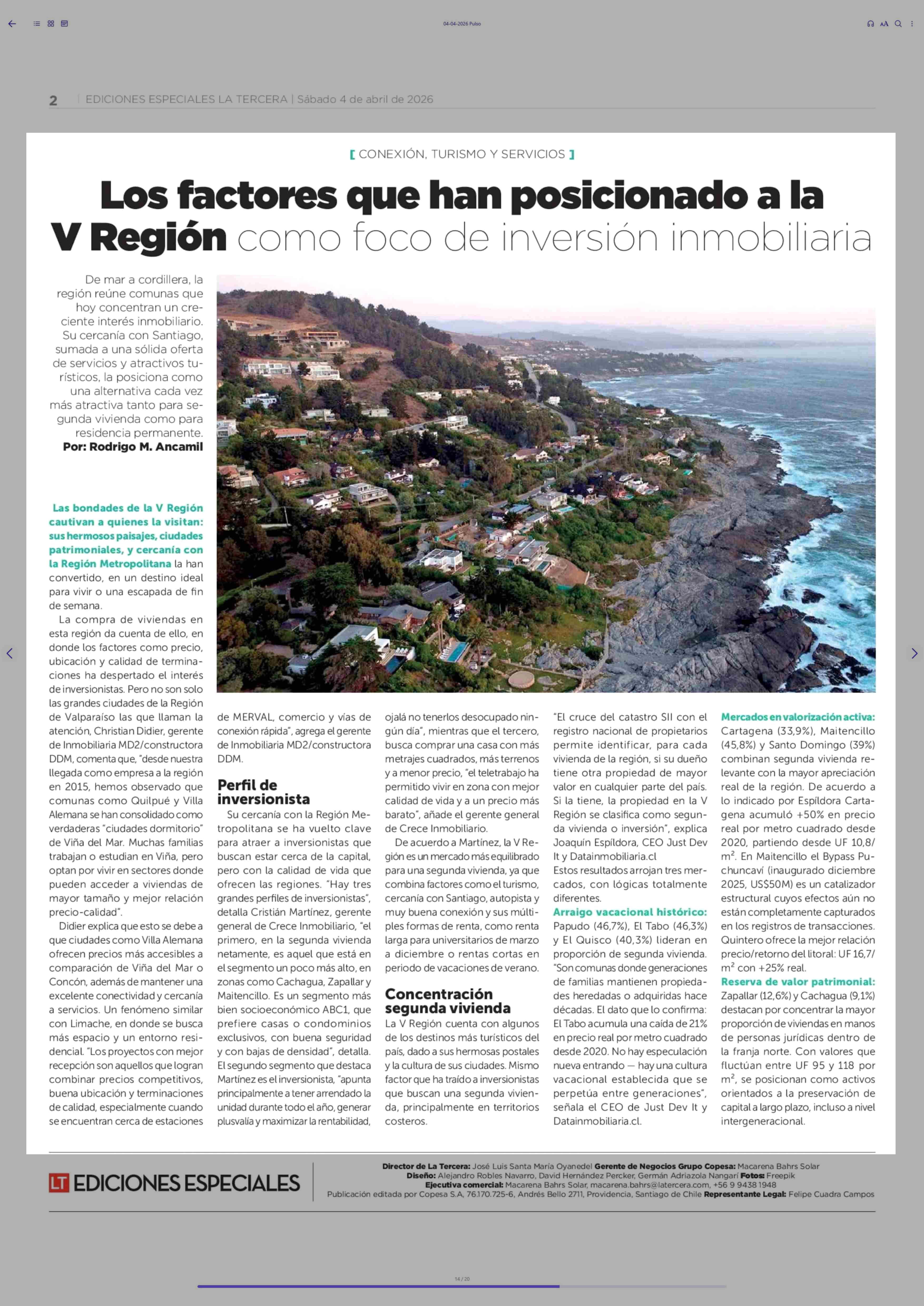 Los factores que han posicionado a la V Región como foco de inversión inmoblliaria 04-04-2026 La Tercera |