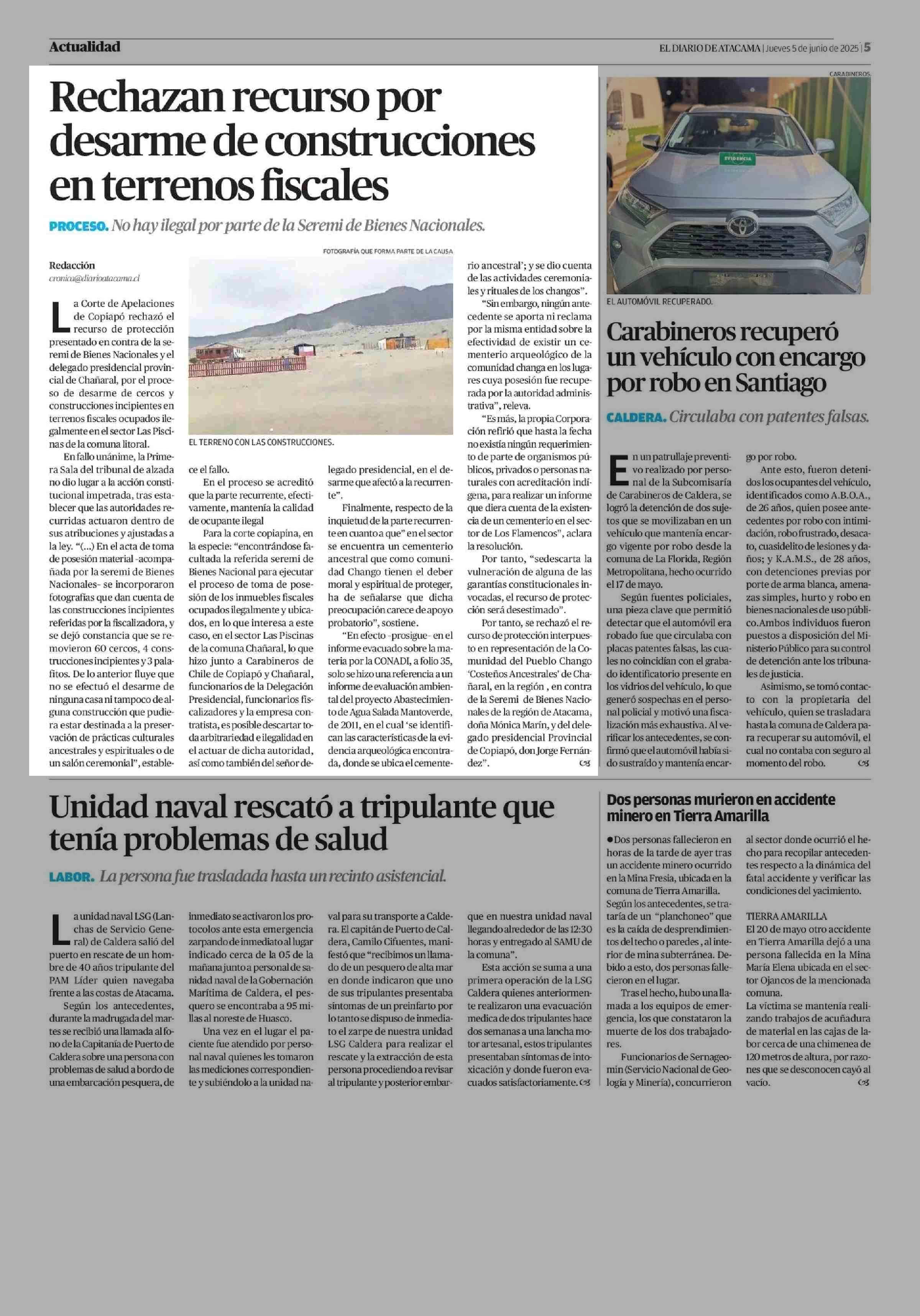 Rechazan recurso por desarme de construcciones en terrenos fiscales 05-06-2025 El Diario de Atacama |