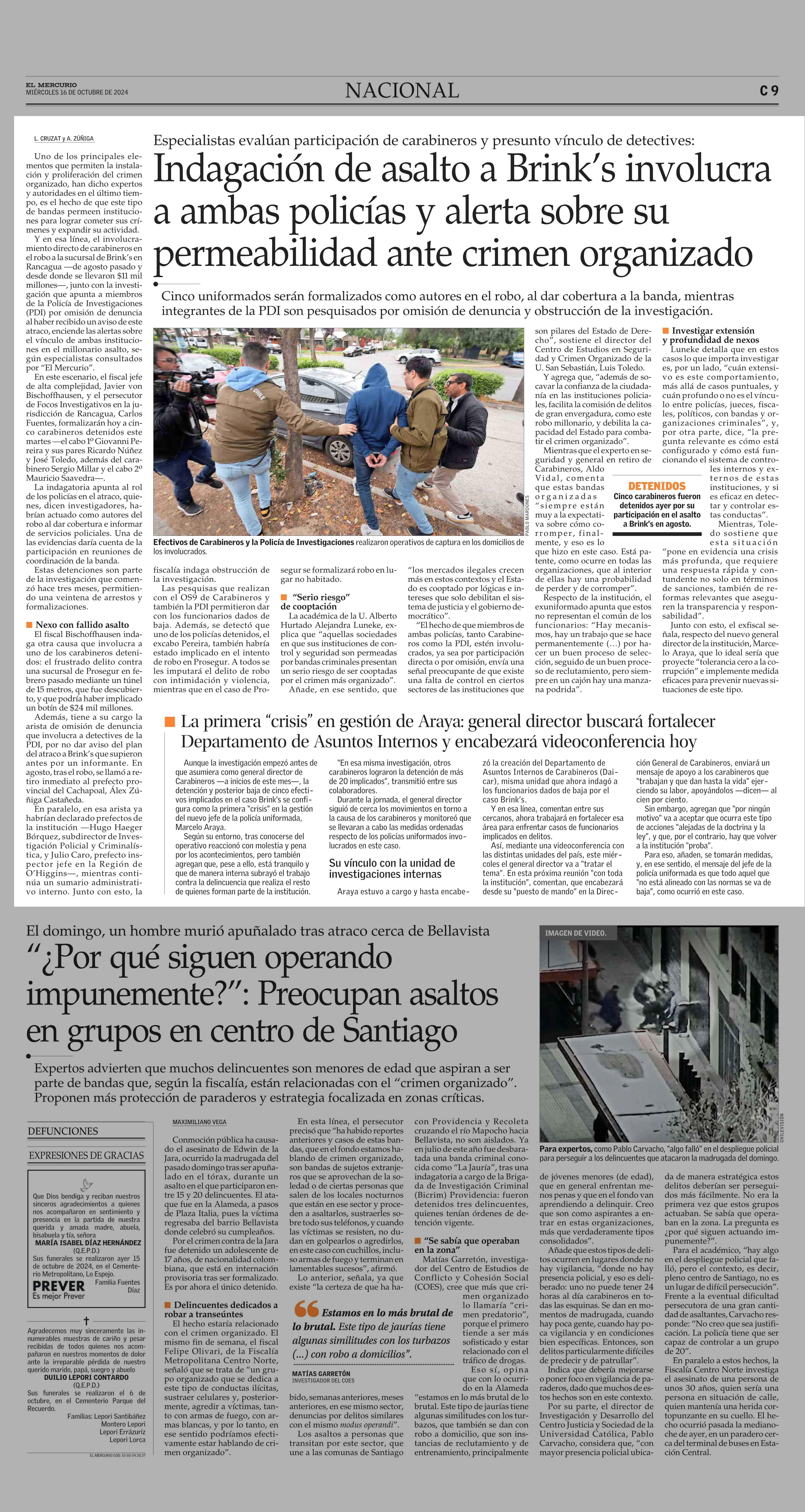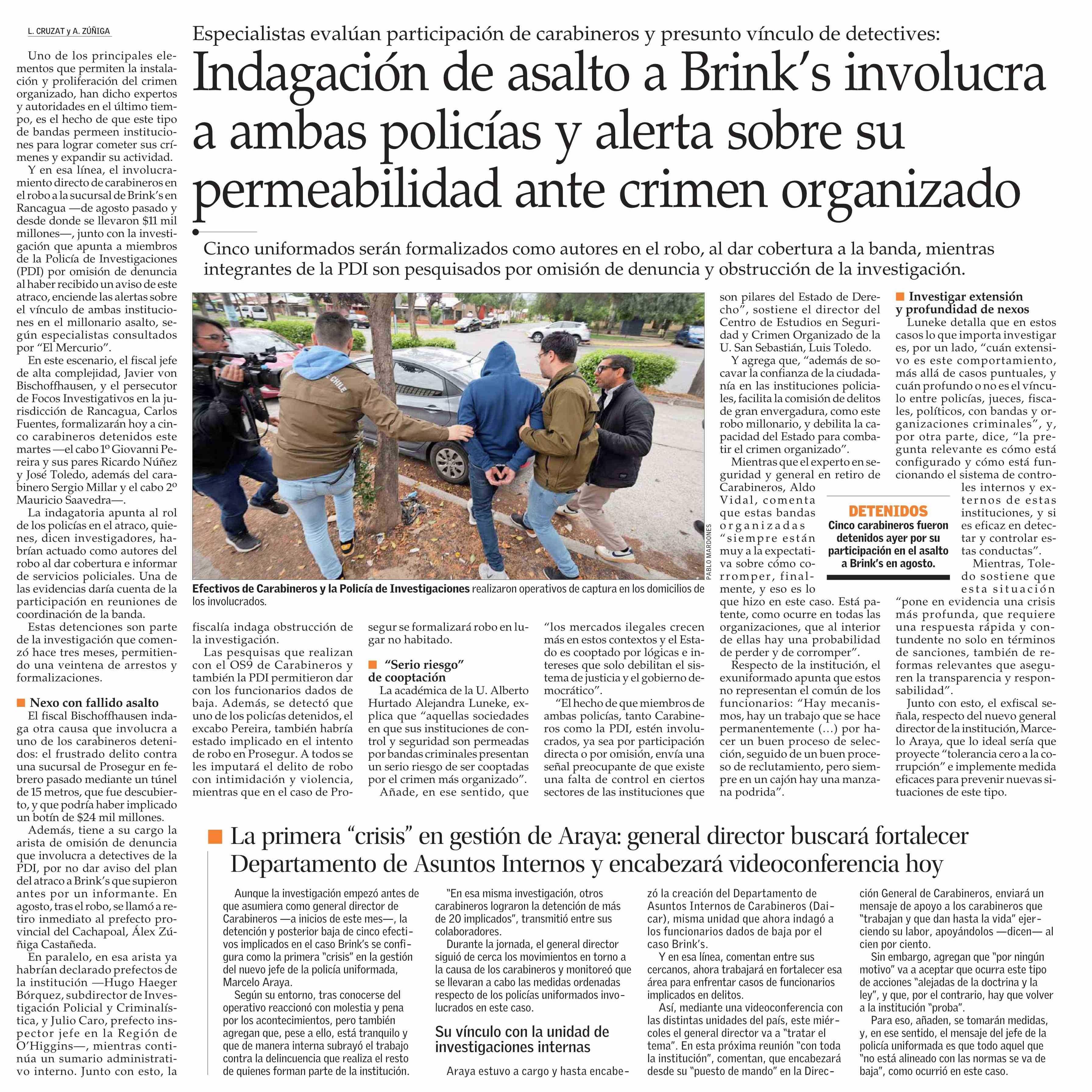 Indagación de asalto a Brink's involucra a ambas policías y alerta sobre su permeabilidad ante crimen organizado 16-10-2024 El Mercurio |