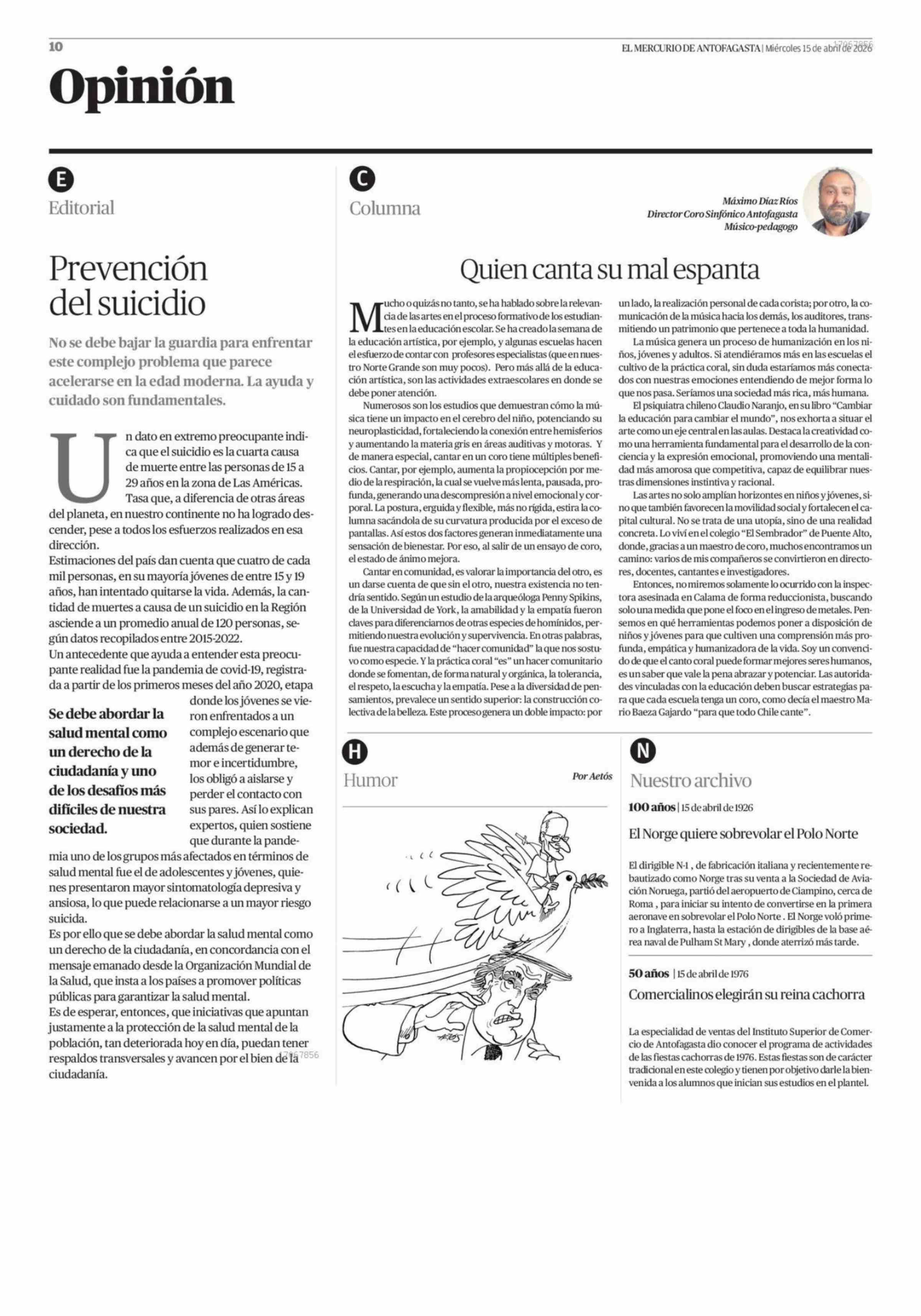 Editorial: Prevención del suicidio 15-04-2026 El Mercurio de Antofagasta |