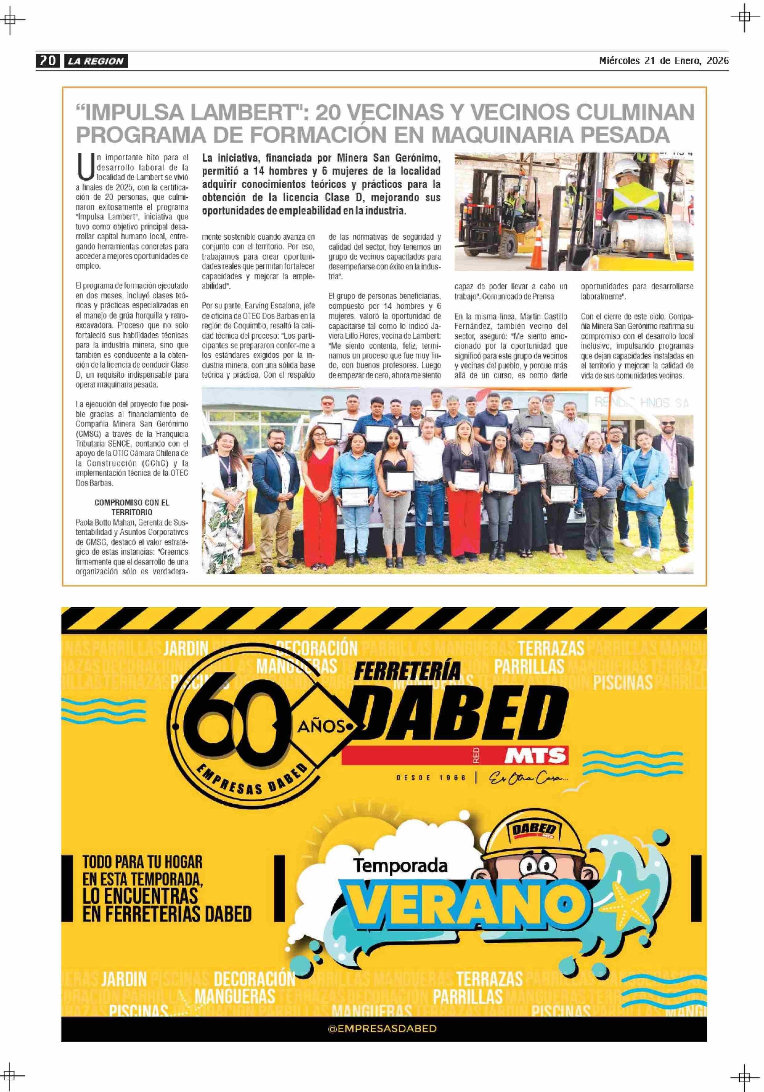 "IMPULSA LAMBERT": 20 VECINAS Y VECINOS CULMINAN PROGRAMA DE FORMACIÓN EN MAQUINARIA PESADA 21-01-2026 Diario la Región |