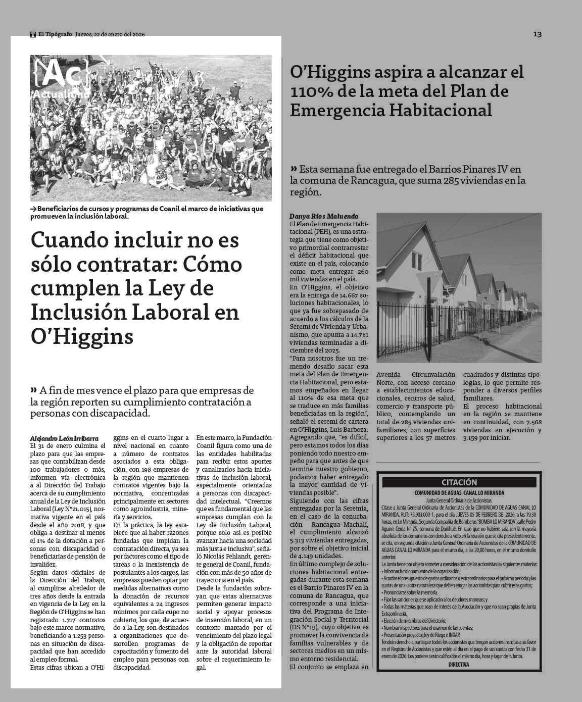 Cuando incluir no es sólo contratar: Cómo cumplen la Ley de Inclusión Laboral en O'Higgins 22-01-2026 El Tipógrafo |